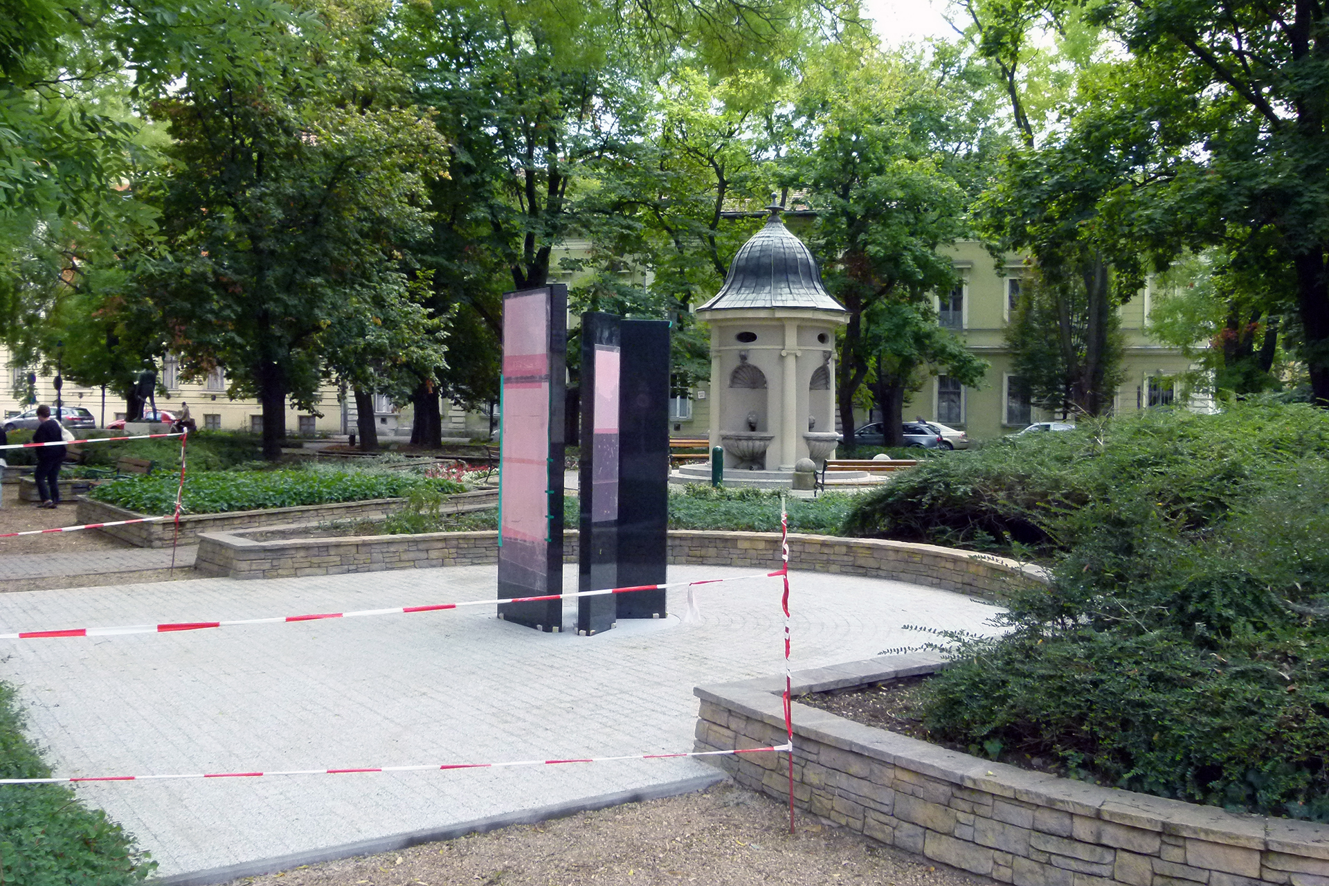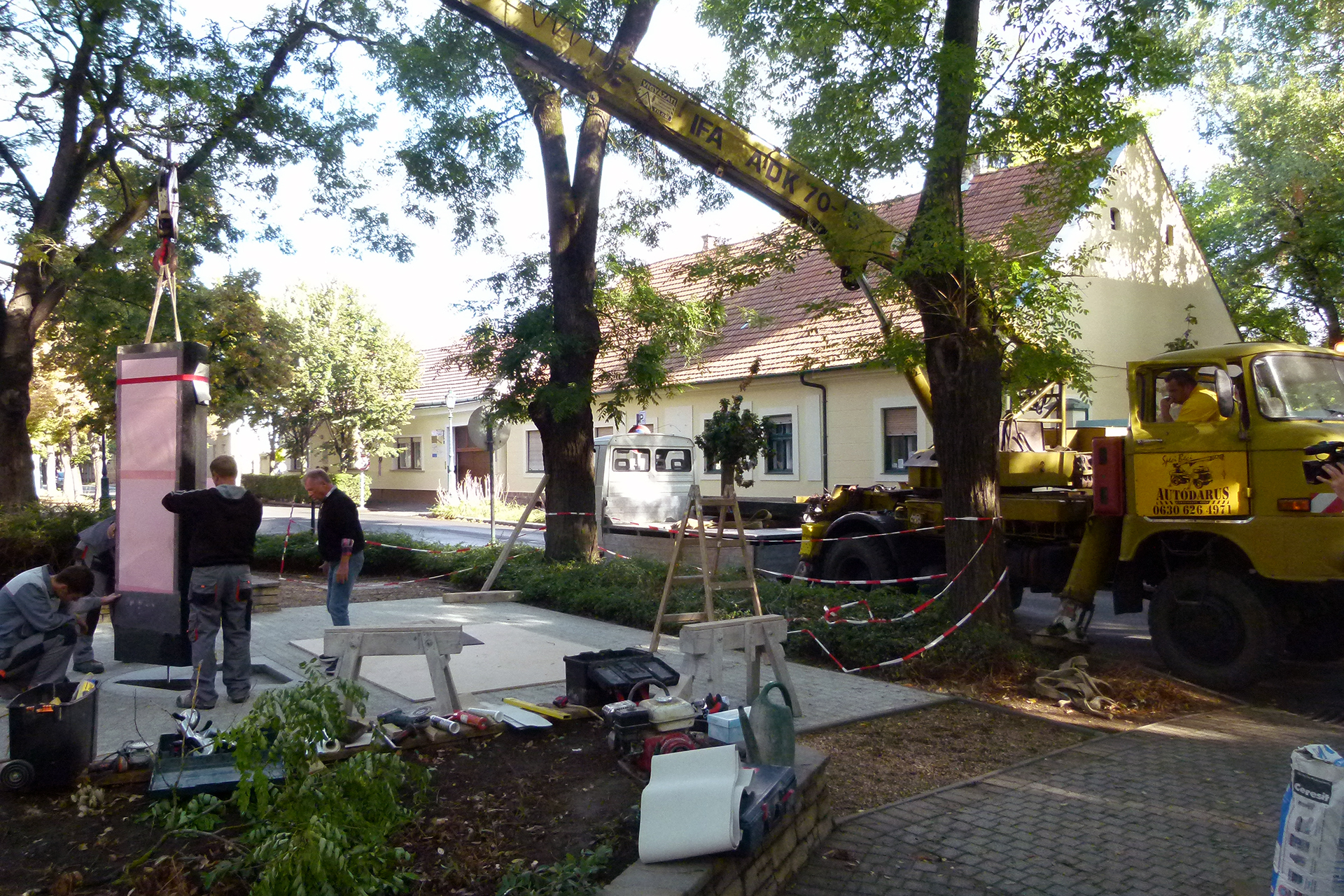 A Petőfi téren emelődaru segítségével állították az előre elkészített talapzatba a darabokat, amelyeket gondosan rögzítettek. A felületekre vésett feliratok egyelőre még nem láthatók, de azt tudjuk, hogy Janson SSK betűtípussal írták őket, amely típust a legendás református betűmetsző és nyomdász, Misztótfalusi Kis Miklós tervezte Amszterdamban az 1600-as évek végén. A betűtípus az évforduló történetiségét hangsúlyozza.