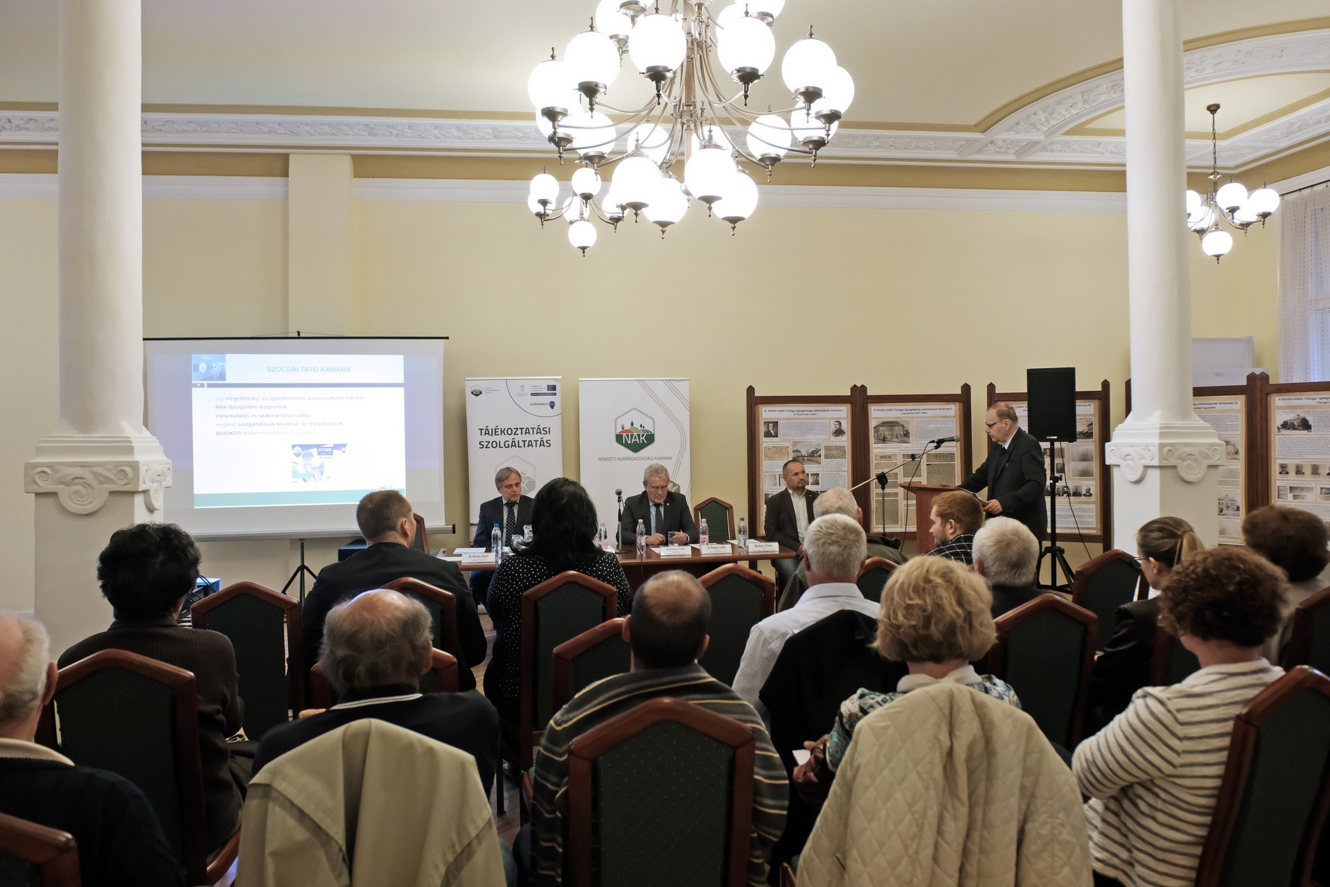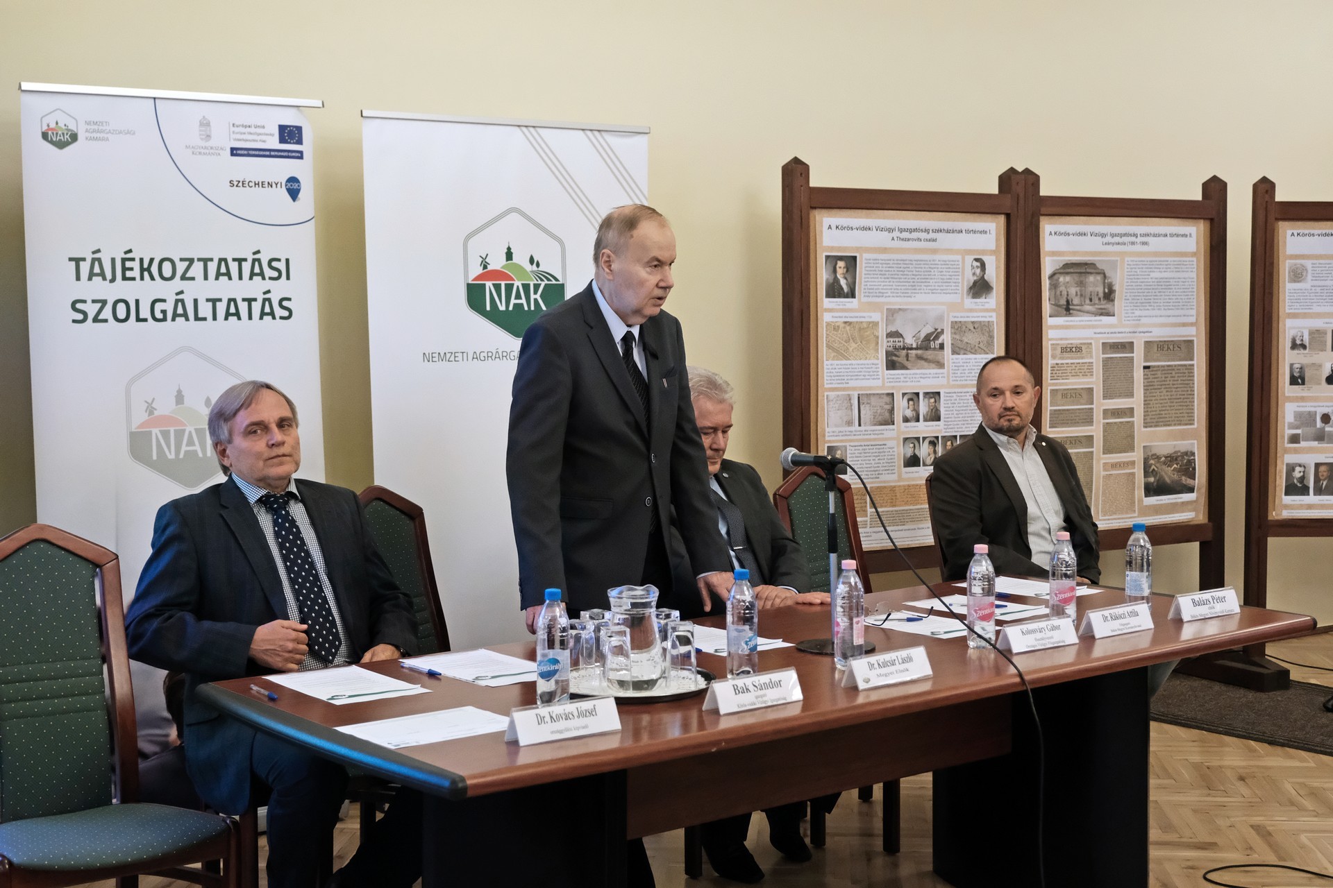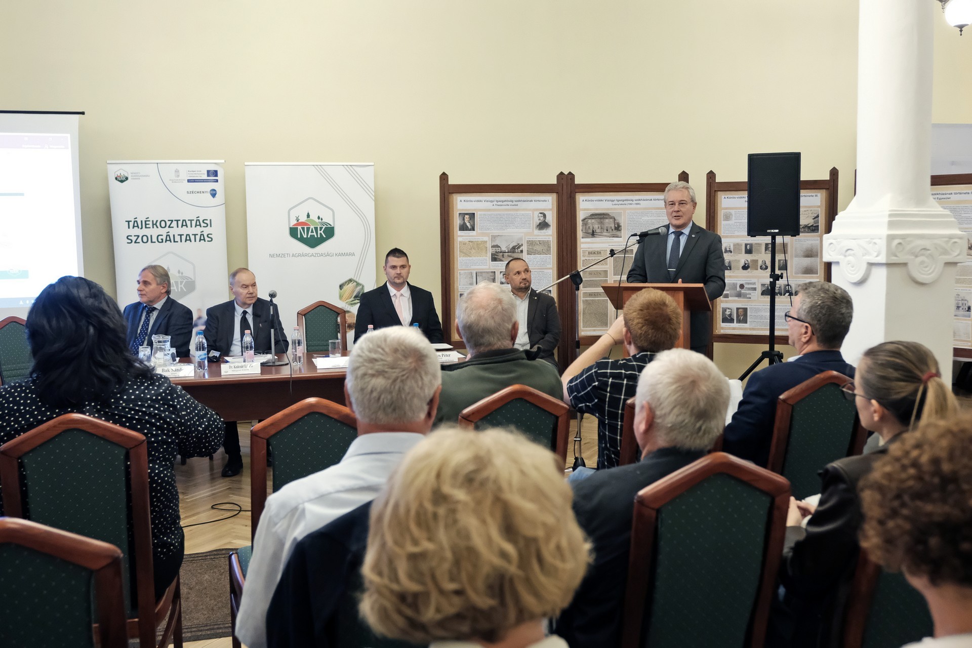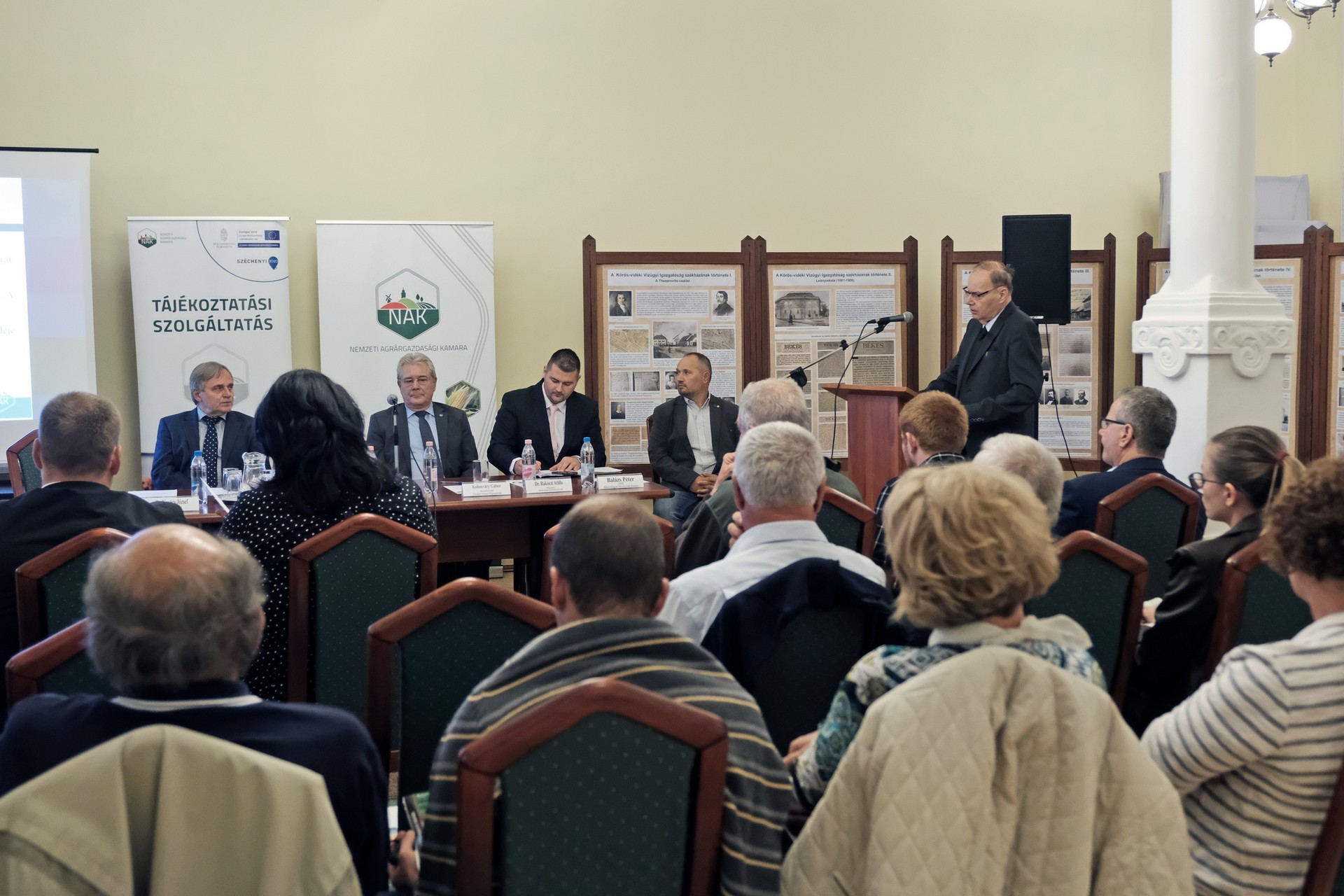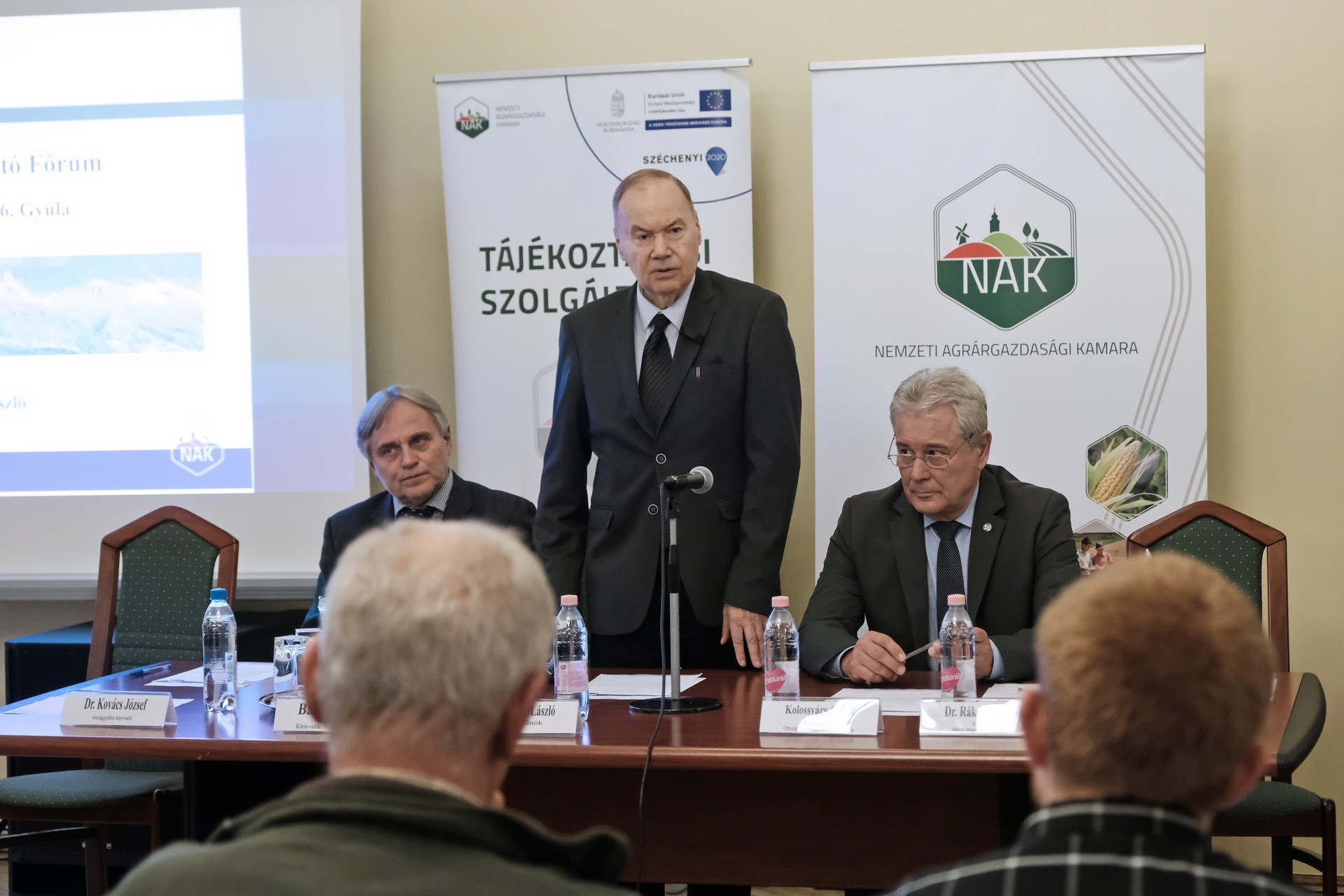 A NAK Békés megyei elnöke ismertette számunkra a délután programját. Az elnöki tájékoztató mellett Kolossváry Gábor, az Országos Vízügyi Főigazgatóság belvízvédelmi és öntözési főosztályának vezetője tartott előadást. Dr. Rákóczi Attila, a Békés Megyei Kormányhivatal főigazgatója a vidékfejlesztési program költségvetéséből finanszírozott támogatások igénybevételről tartott tájékoztatót, dr. Takács Árpád, a Békés Megyei Kormányhivatalt vezető kormánymegbízott pedig az agráriumot érintő kormányzati programról számolt be.