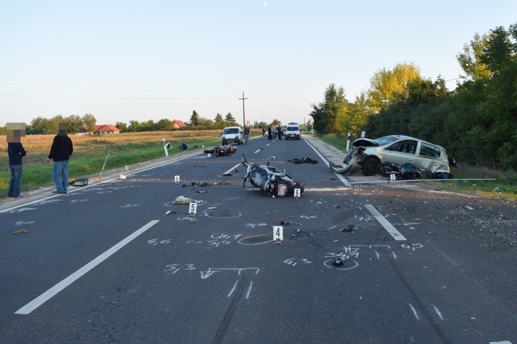 Békéscsaba külterületén 14 óra 20 perckor egy balra kanyarodó személygépkocsi összeütközött a neki szemből érkező motorkerékpárral. A személygépkocsinak ezután nekiütközött az első után közlekedő két motorkerékpár. A sorban negyedik motor vezetője azért, hogy az ütközést elkerülje, balra kormányozta járművét, lement az útpadkára, és elesett. A balesetben a személygépkocsi és az egyik motorkerékpár vezetője könnyű, míg három motorkerékpár vezetője és az egyik motor utasa súlyos sérülést szenvedett. A baleset körülményeit és a felelősség kérdését a Békéscsabai Rendőrkapitányság vizsgálja.