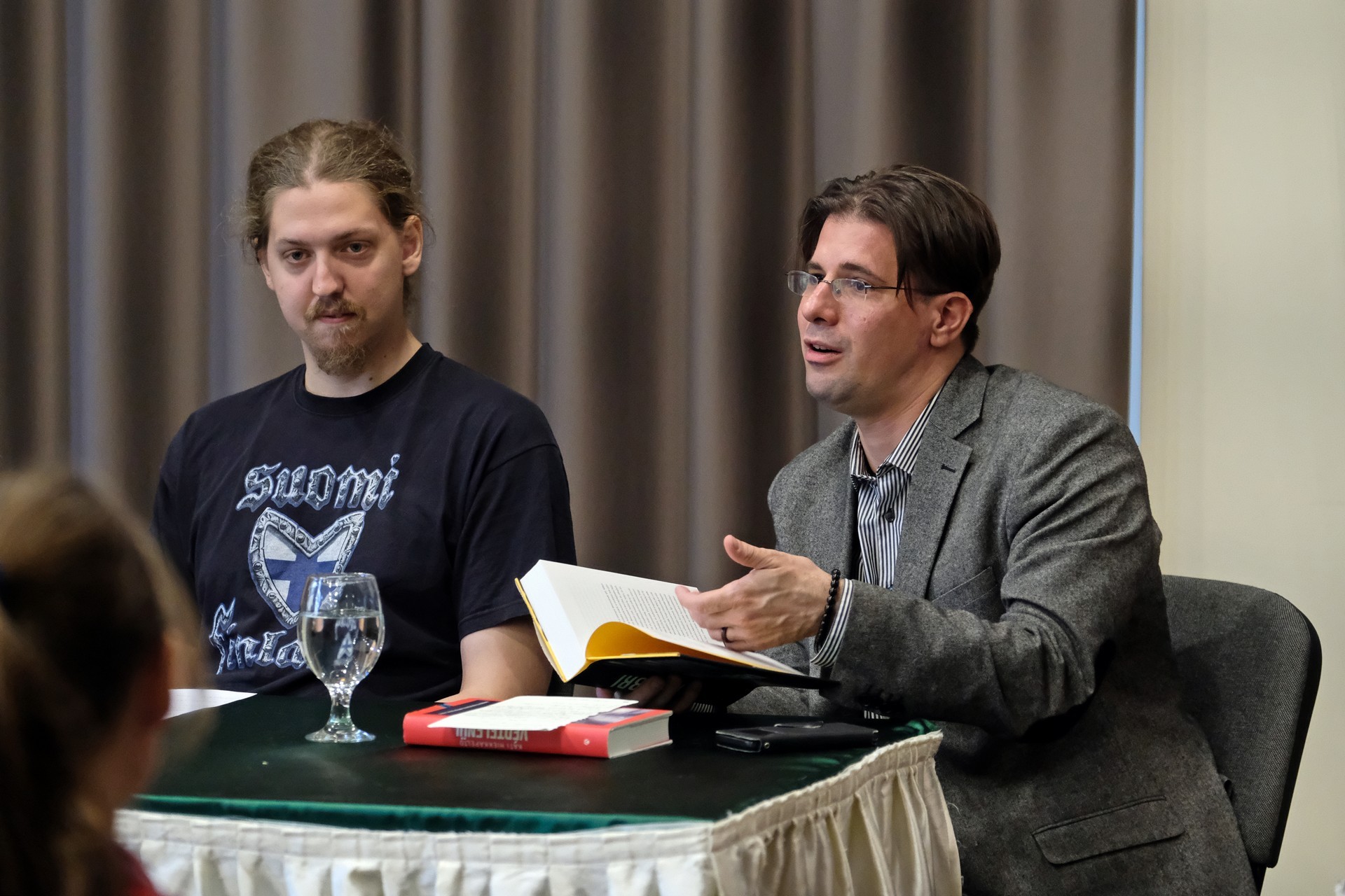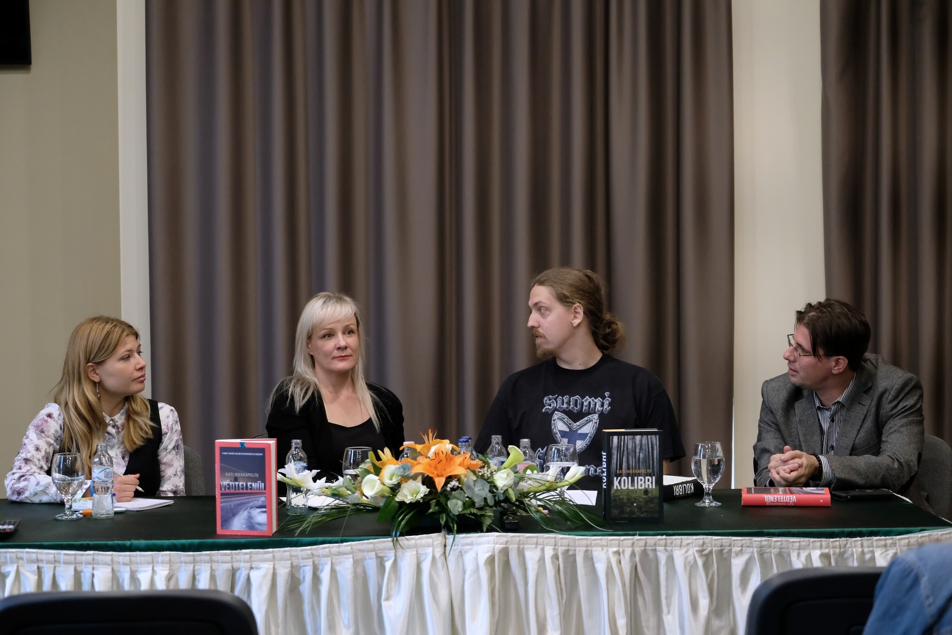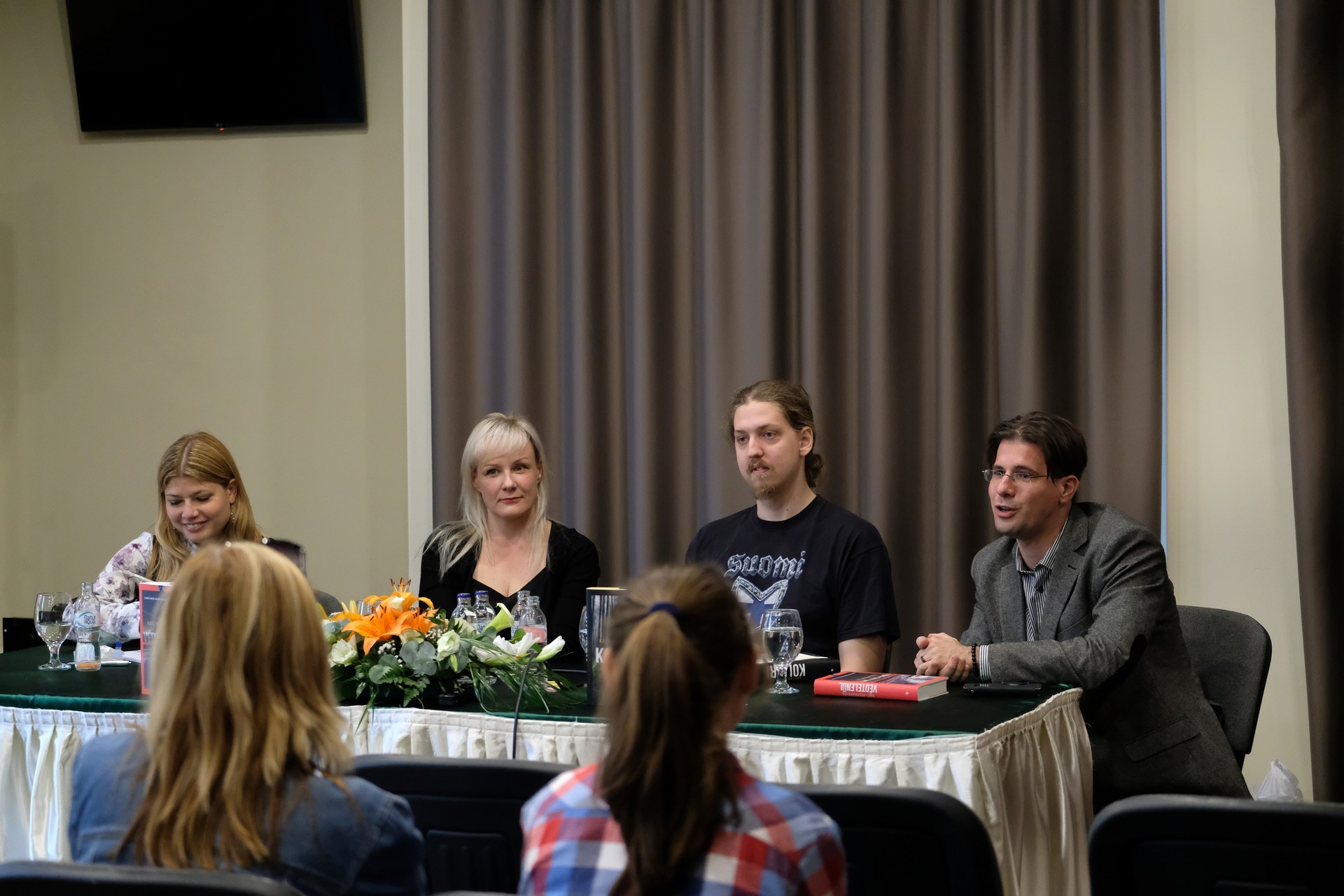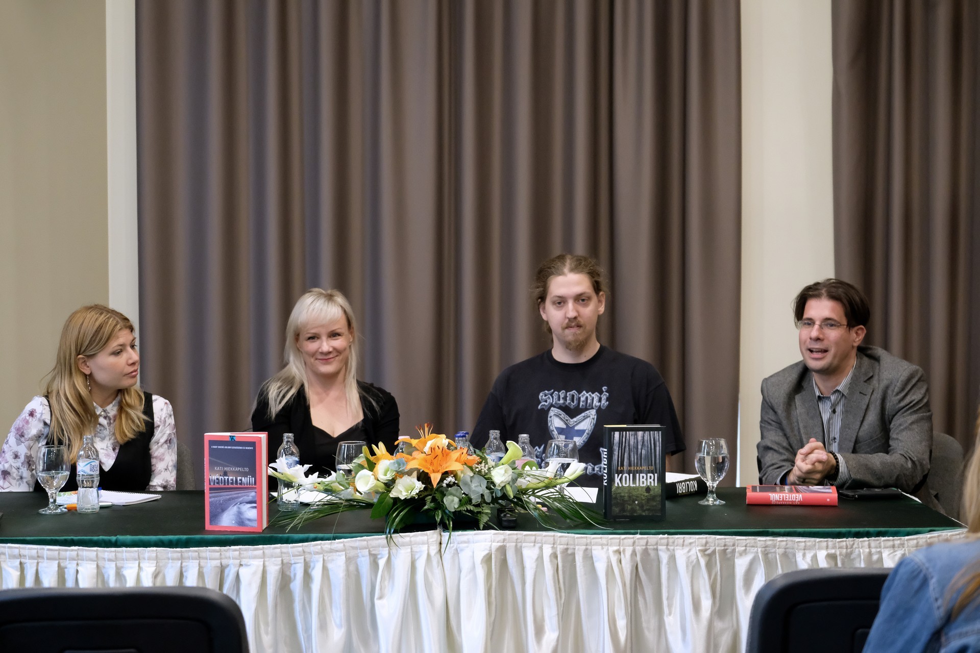 Beszélgetőtársai az íróakadémia hallgatói, Pál Dániel Levente és Csikár Norbert Adrián voltak. Kellemes agytorna volt, hogy Kati Hiekkapelto angolul válaszolt a magyar moderátori kérdésekre, de természetesen volt lehetőségem anyanyelvén is kérdezni tőle. A magyar olvasóközönségnek nemcsak a legfrissebb könyv lett meglepetés, hanem az is, hogy az írónő egészen kitűnően beszél magyarul. Kiderült ugyanis, hogy korábbi férje vajdasági magyar volt, két gyermekük is született. Nem véletlen tehát, hogy a Gyulán is bemutatott regényeinek egy vajdasági magyar származású nyomozónő a főhőse. Fekete Anna kalandjait követhetjük nyomon mind a Kolibri, mind a Védtelenül kötetekben. Környezete viszont tipikusan finn: erdők, tavak, kevés ember, sok sötét, elborult világlátás, igazi skandináv dark side.