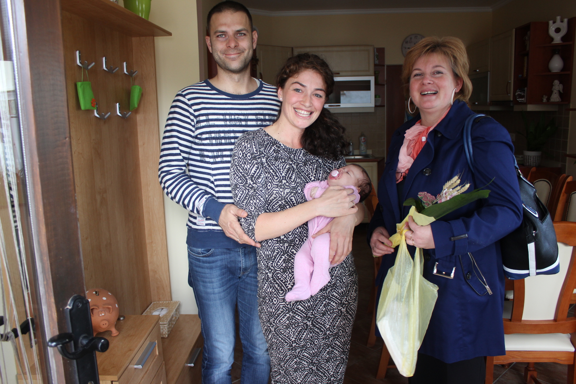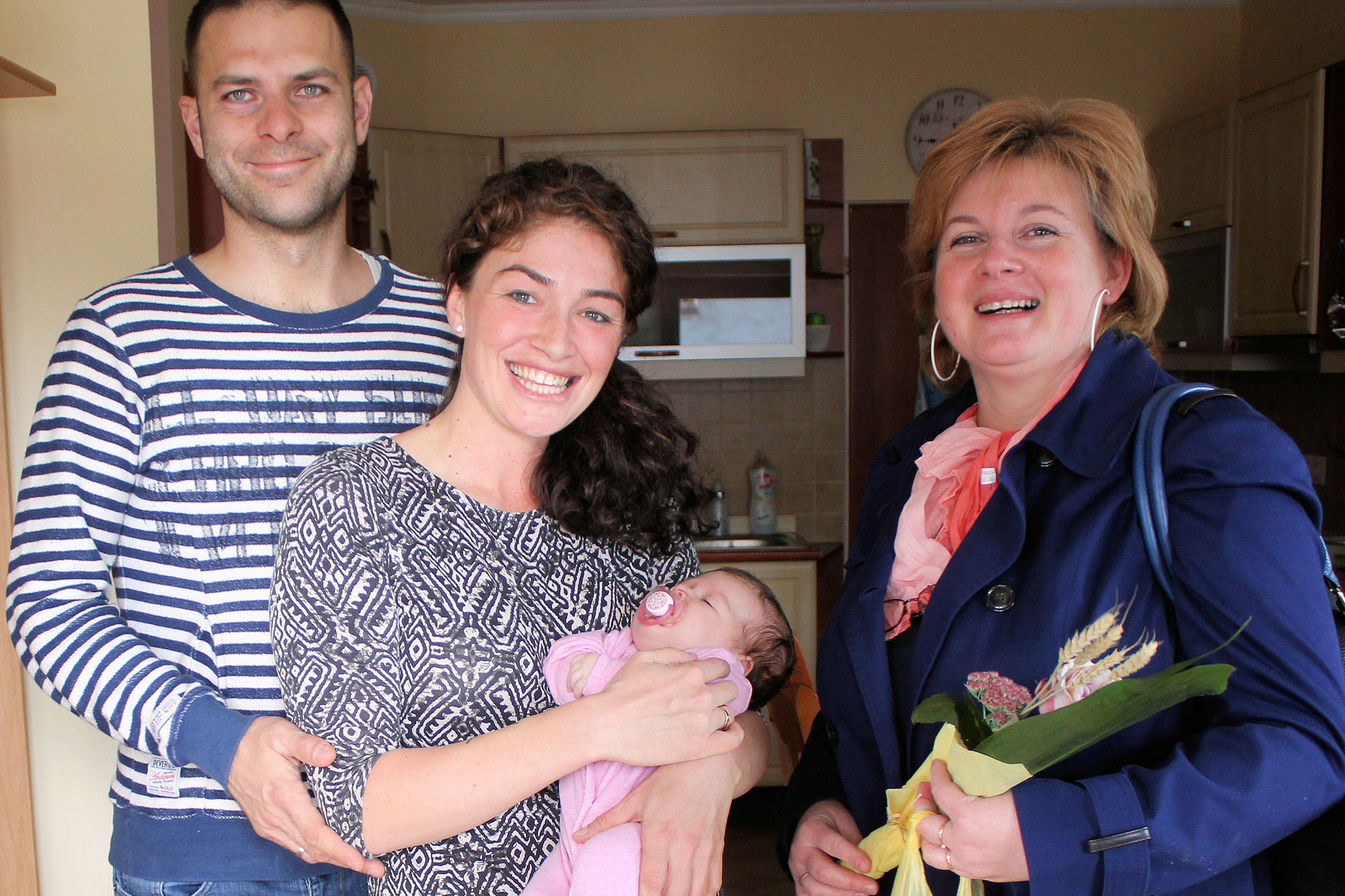 A köszöntésen az apróság mellett édesanyja és édeapja is részt vett, akik átvették az újszülött ajándékait: a névre szóló, egyedileg hímzett babaruhát, a virágcsokrot és Póka György egyik festményét.