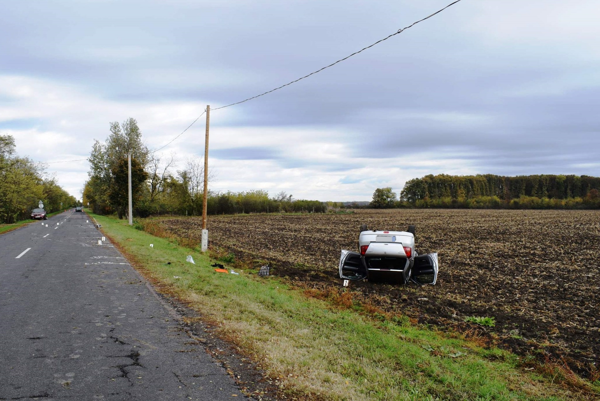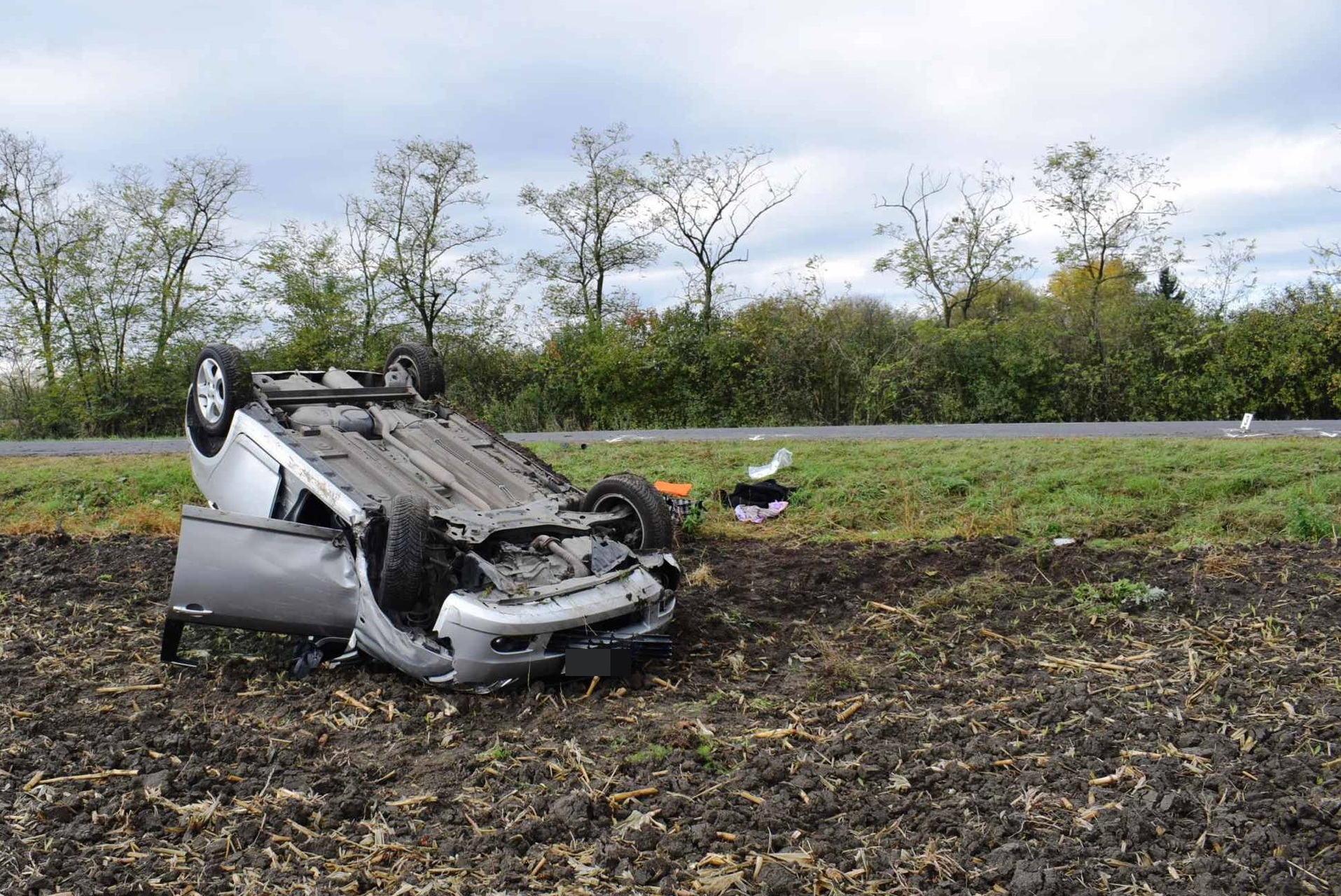 Békéscsaba külterületén 9 óra 15 perc körül egy személygépkocsi áttért a menetiránya szerinti baloldalra, ahol összeütközött egy másik személyautóval, majd felborult.