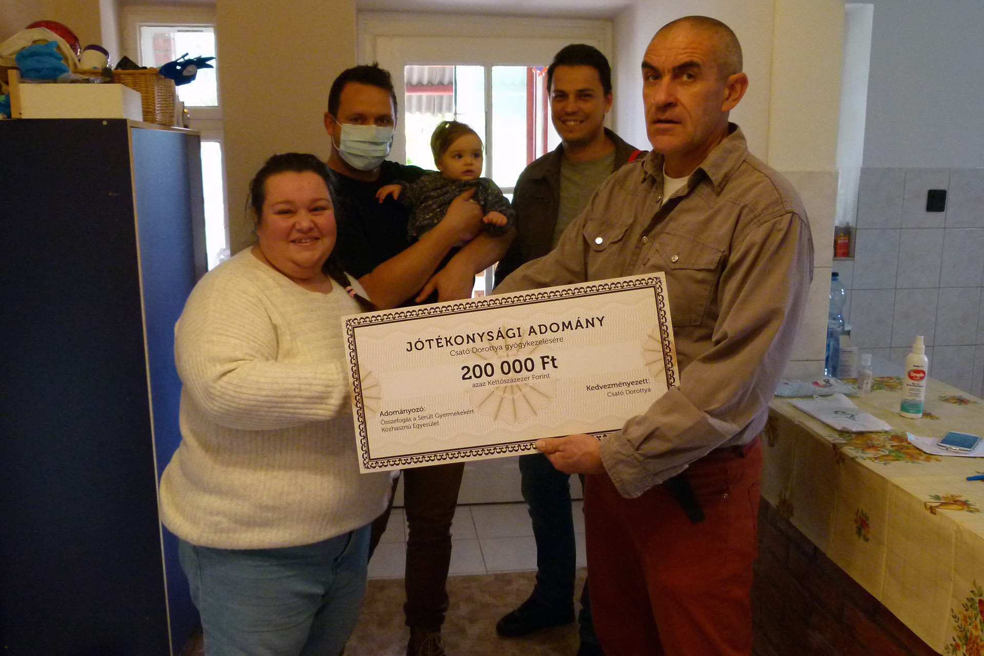 Csató Dorottyánál héthetesen diagnosztizálták a máján jelentkező tumort, amelyet kemoterápiás kezelések után, műtéti úton távolítottak el szervezetéből. A mosolygós csöppségnek azonban további gyógykezelésre és rehabilitációra van szüksége, amelyet az összefogásból származó adomány is segíteni fog. A rengeteg megpróbáltatáson átment apróság rendkívüli türelemmel viseli a mindennapos harcot, így az átadáskor is kacagva köszöntötte vendégeit.