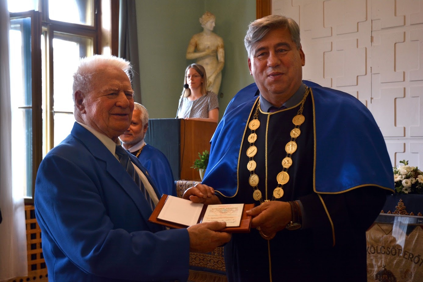 A Budapesten élő Gyulaiak Baráti Körének egyik alapító tagja nemrégiben a Testnevelési Egyetem jubileumi diplomaosztóján Mocsai Lajos rektortól átvehette vasdiplomáját, hiszen 65 éve végzett a nagyhírű intézményben a MÖSZ korábbi főtitkára.