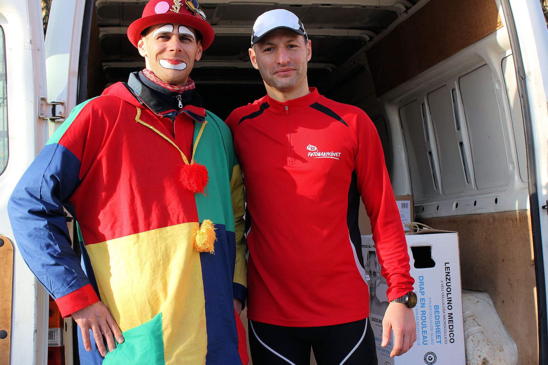 Adományokat gyűjt az orosházi SOS Gyermekfalu lakóinak Andor bohóc és Csíkos Dániel gyulai futónagykövet.