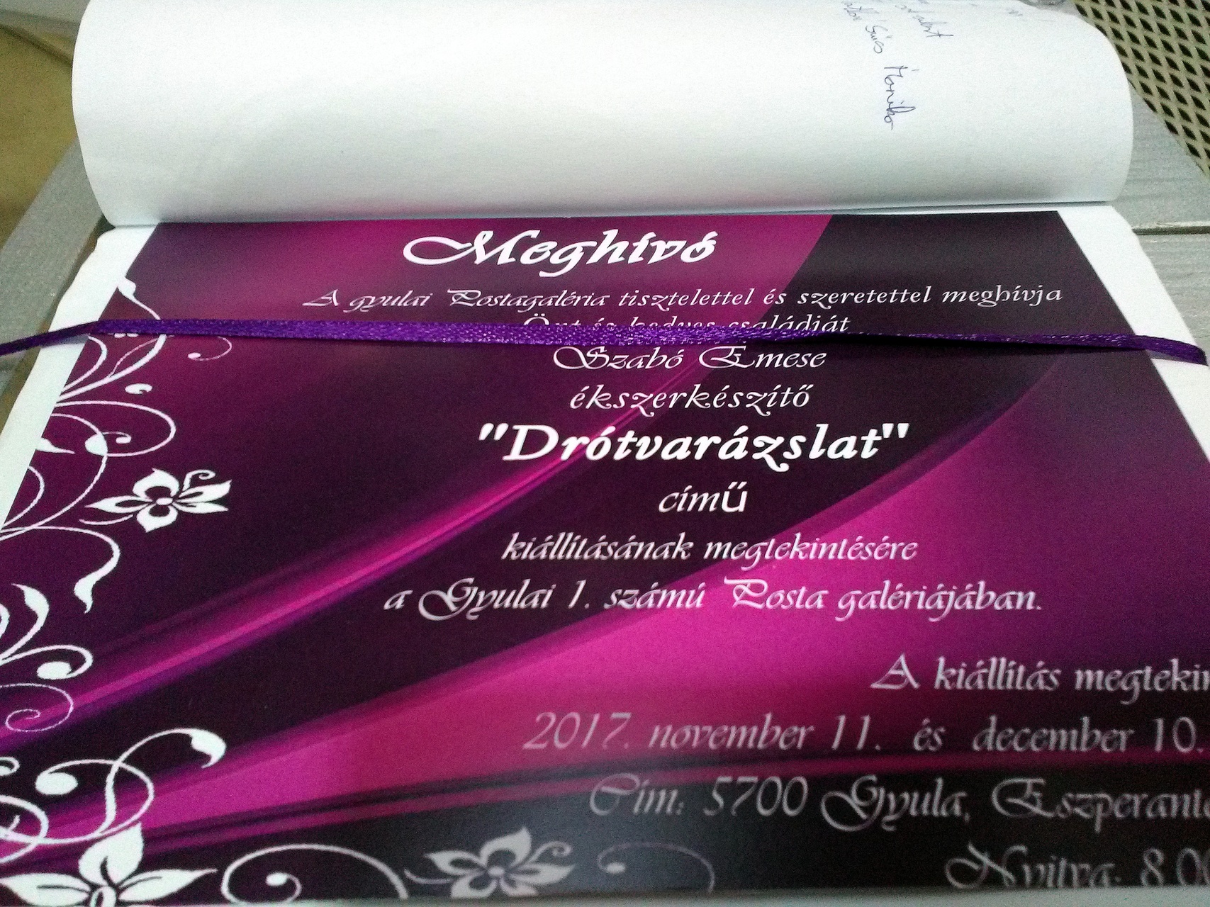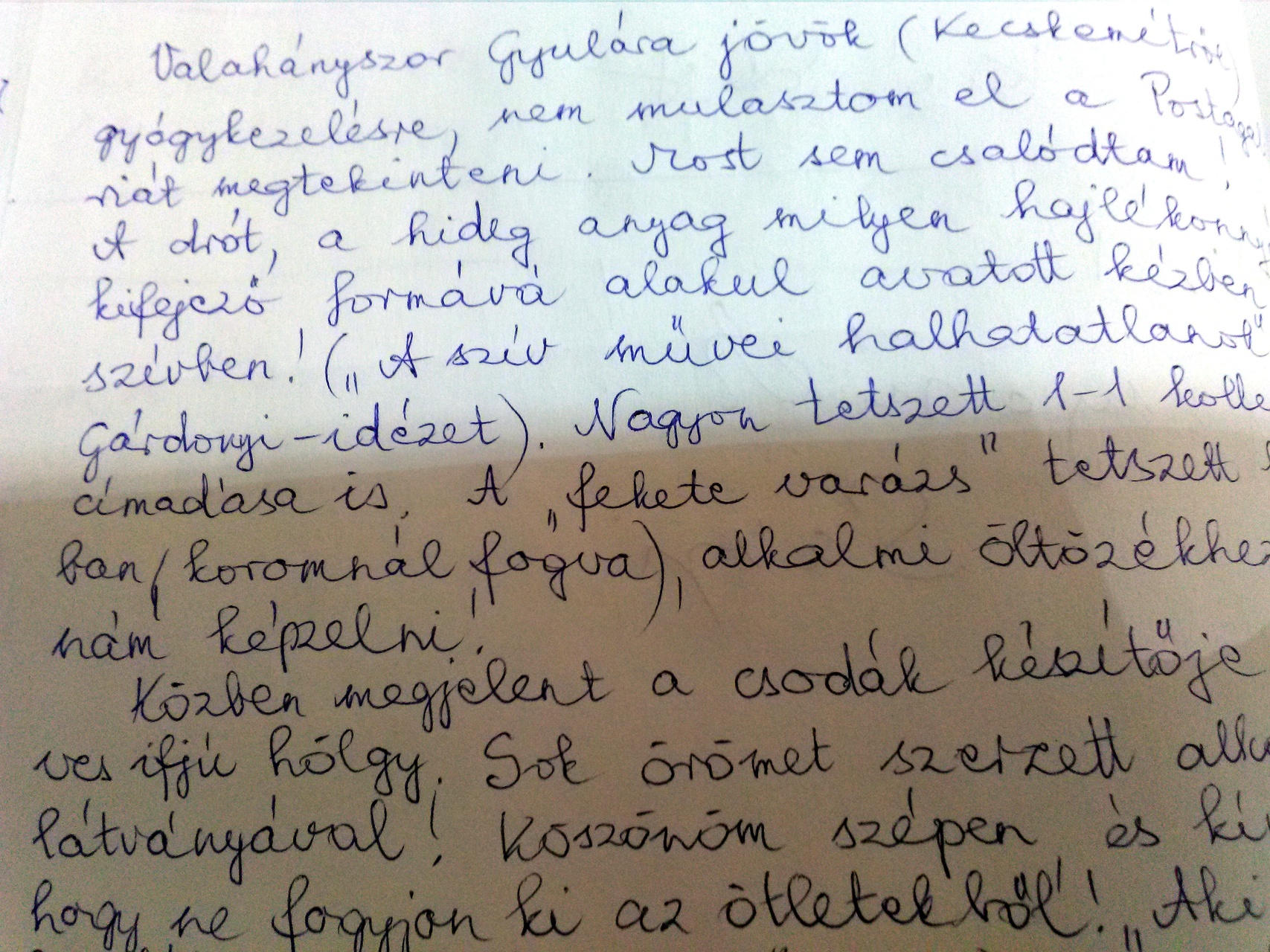 – Valahányszor Gyulára jövök (Kecskemétről) gyógykezelésre, nem mulasztom el a Postagalériát megtekinteni. Most sem csalódtam! A drót, a hideg anyag milyen hajlékony, kifejező formává alakul avatott kézben, szívben! („A szív művei halhatatlanok!” – Gárdonyi-idézet) – olvastuk a gyulai Postagaléria vendégkönyvében. Aztán körülnéztünk.