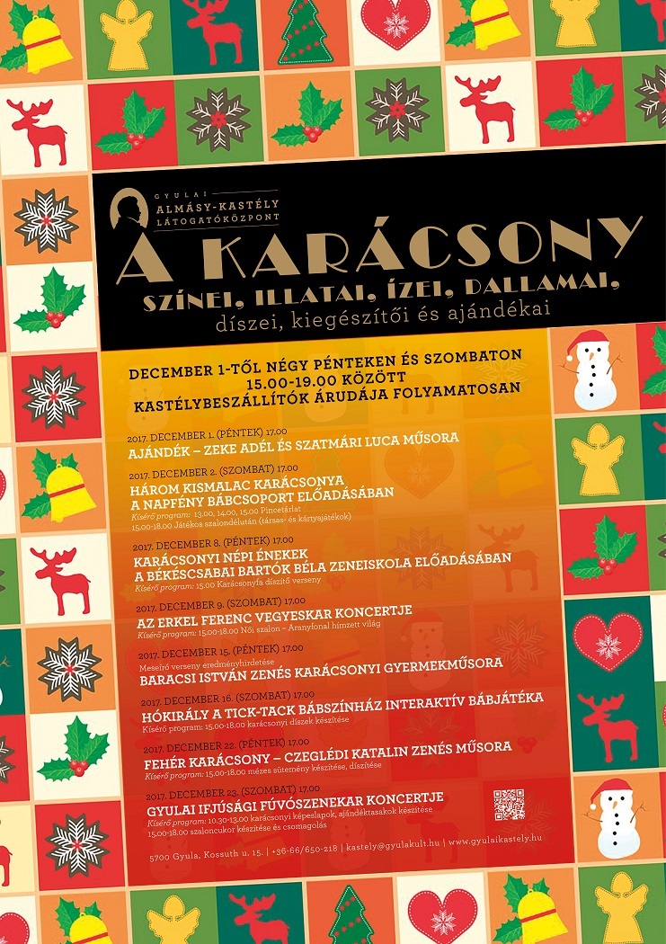 December 22-én Czeglédi Katalin Fehér karácsony című műsora, 23-án pedig a Gyulai Ifjúsági Fúvószenekar koncertje zárja a programsorozatot. A gyerekek karácsonyi képeslapokat, ajándéktasakokat és szaloncukrot is készíthetnek.
