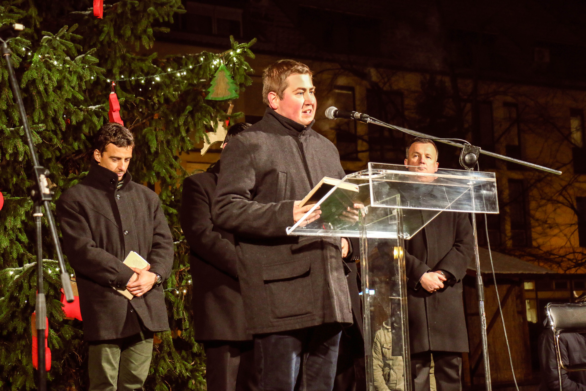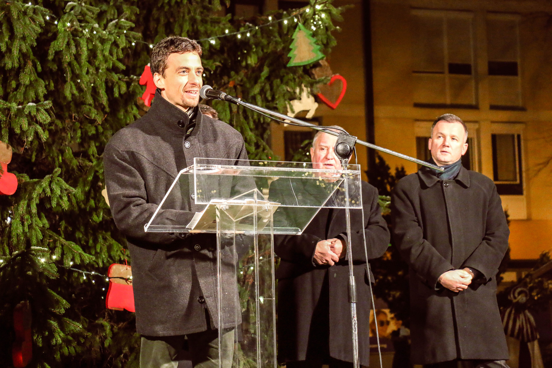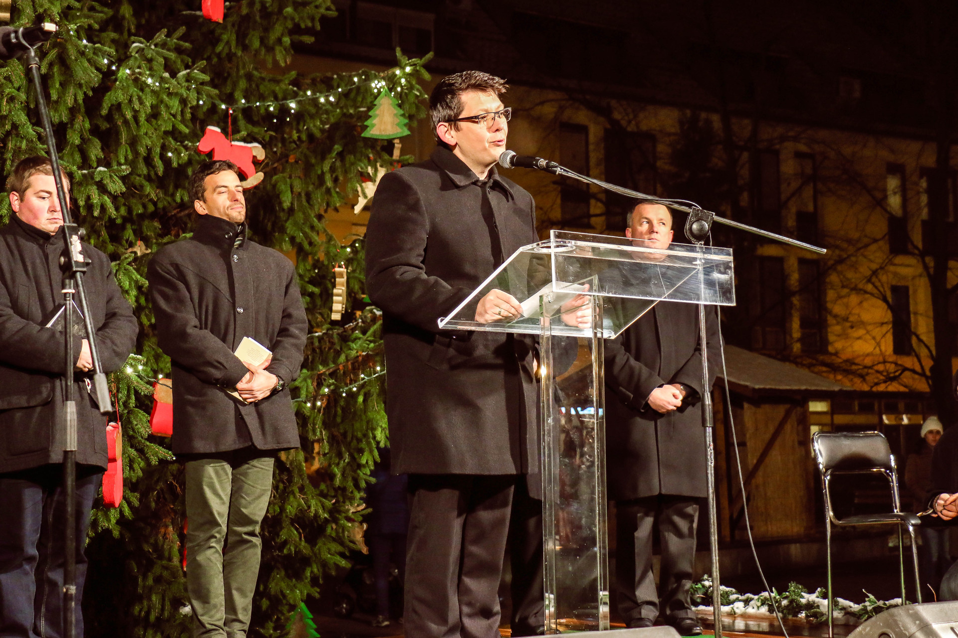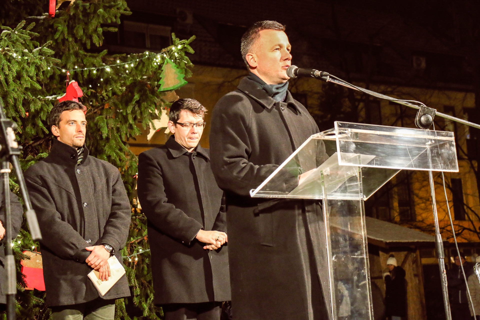 A város Adventi koszorúján Görgényi ERnő polgármester gyújtotta meg az első gyertyát