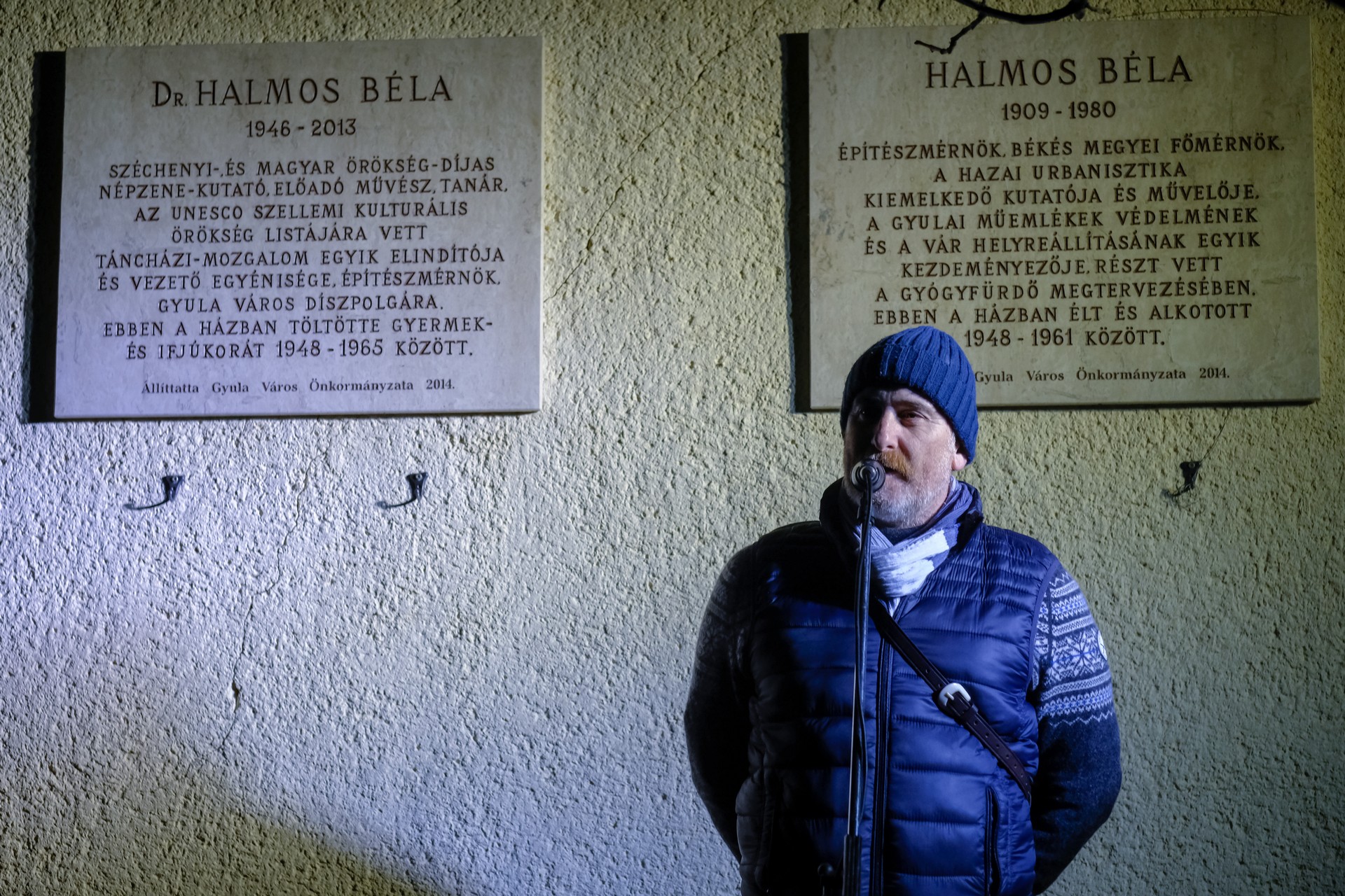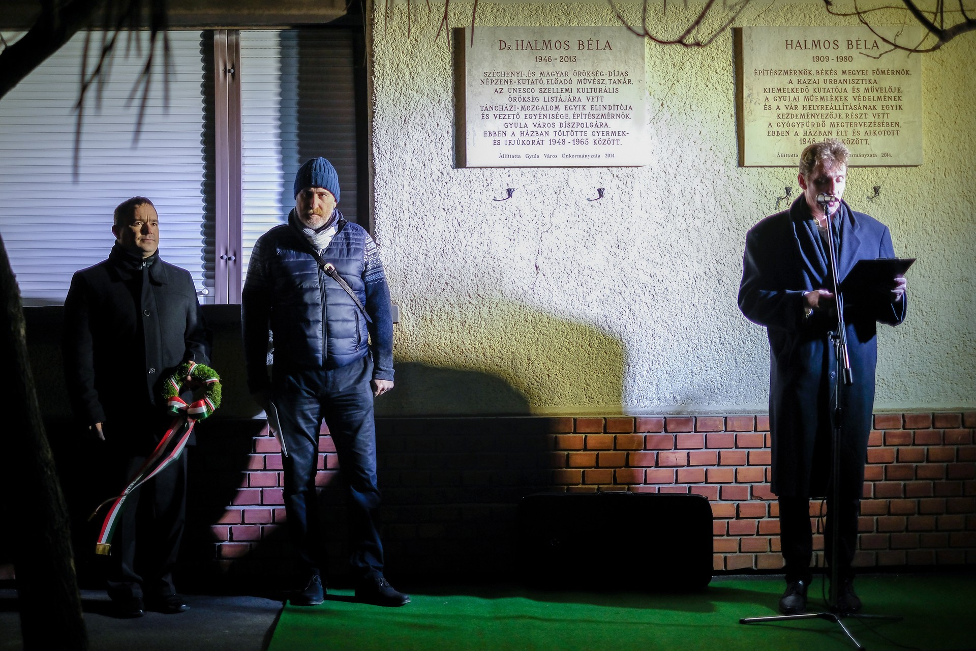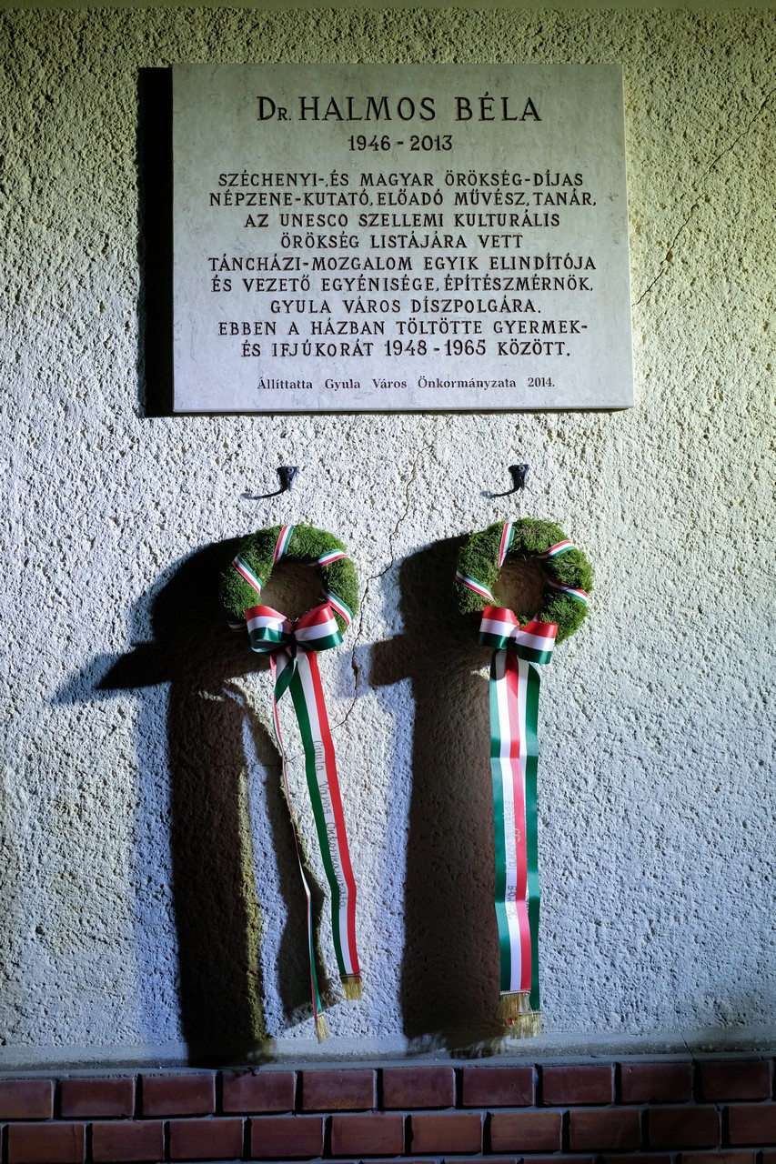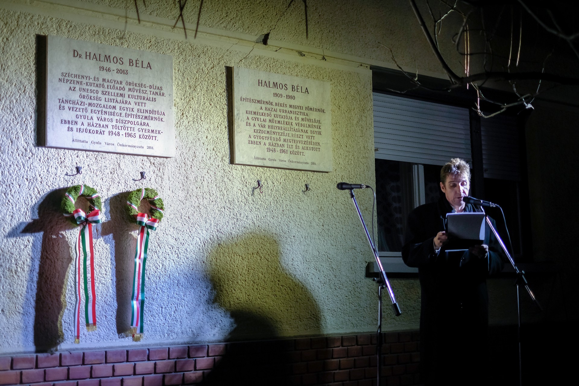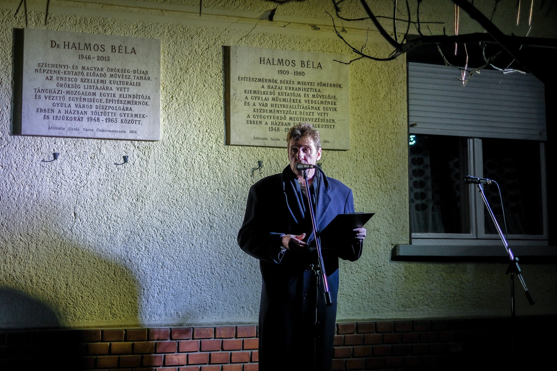 Az emléktáblánál néptáncosok és -zenészek körében tisztelegtek Halmos Béla munkássága előtt. Az ünnepségen elhangzott: a szombathelyi születésű népzenész ezer szállal kötődött Gyulához. Részt vett a hangszeres népzenei és táncházmozgalom elindításában, továbbá alapító tagja volt a Sebő-együttesnek. 1990-ben a Kalamajka zenekar prímása lett. Tanított a Zeneakadémián, tudományos főmunkatársa volt a Magyar Művelődési Intézetnek, megszervezte a hangszeresnépzene-kutató csoportot, és létrehozta a táncházarchívumot.