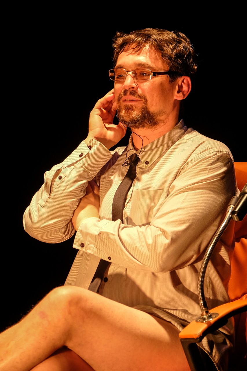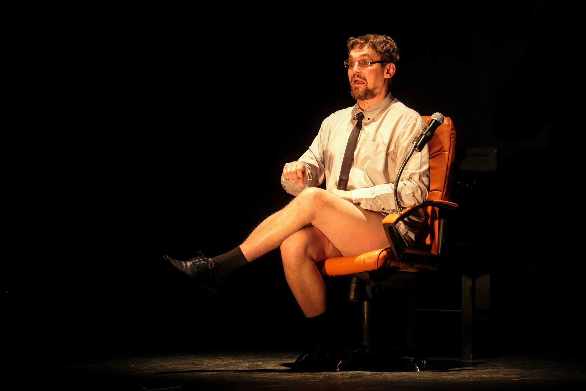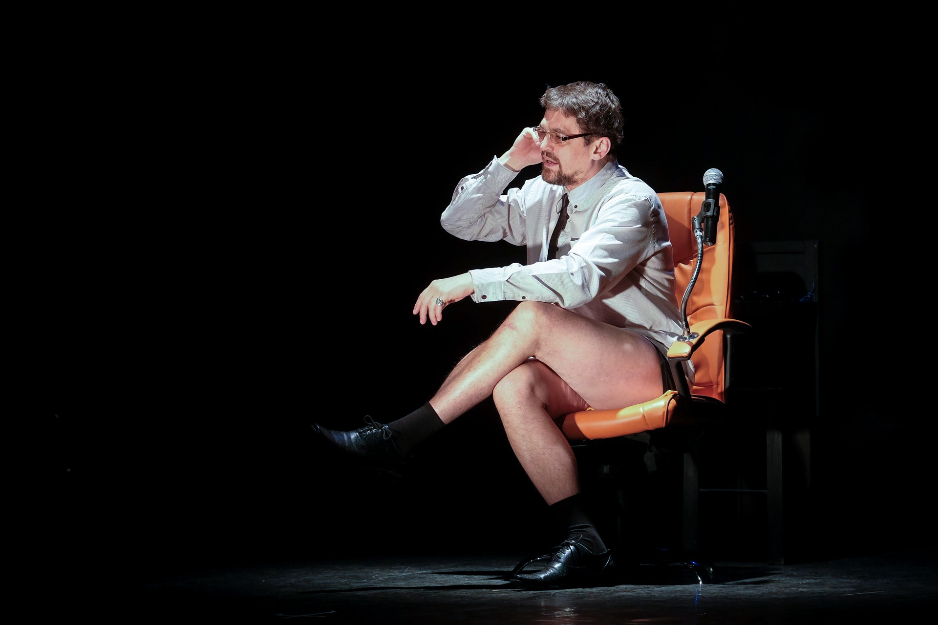 Az viszont kétségtelen, hogy a mai ifjúságot már semmivel sem lehet meglepni, sem belőni, sem kilőni, így azzal sem, ha a színház intézményében egyetlen szál bugyiban játsszák el neki a darabot. Ilyen tekintetben, mondhatnók, nemhogy újszerűen, inkább visszafogottan jelenítették meg előtte a 21. századi ember perlekedését, háborúskodását Istennel. Harsányi Attilát ugyanis nem csak fehérneműben nézegethettük egy teljes órán át. Volt még rajta egy ing is, meg egy zokni, meg egy nyakkendő, és időnként a napszemüvegét is felvette, hogy hitelesebb legyen az alakítása. Az Y generáció ezen jóízűen nevetett, az idősebb korosztály pedig nem tudta, mit kezdjen vele: méltányolja, kacagja ki, vagy inkább forduljon el.