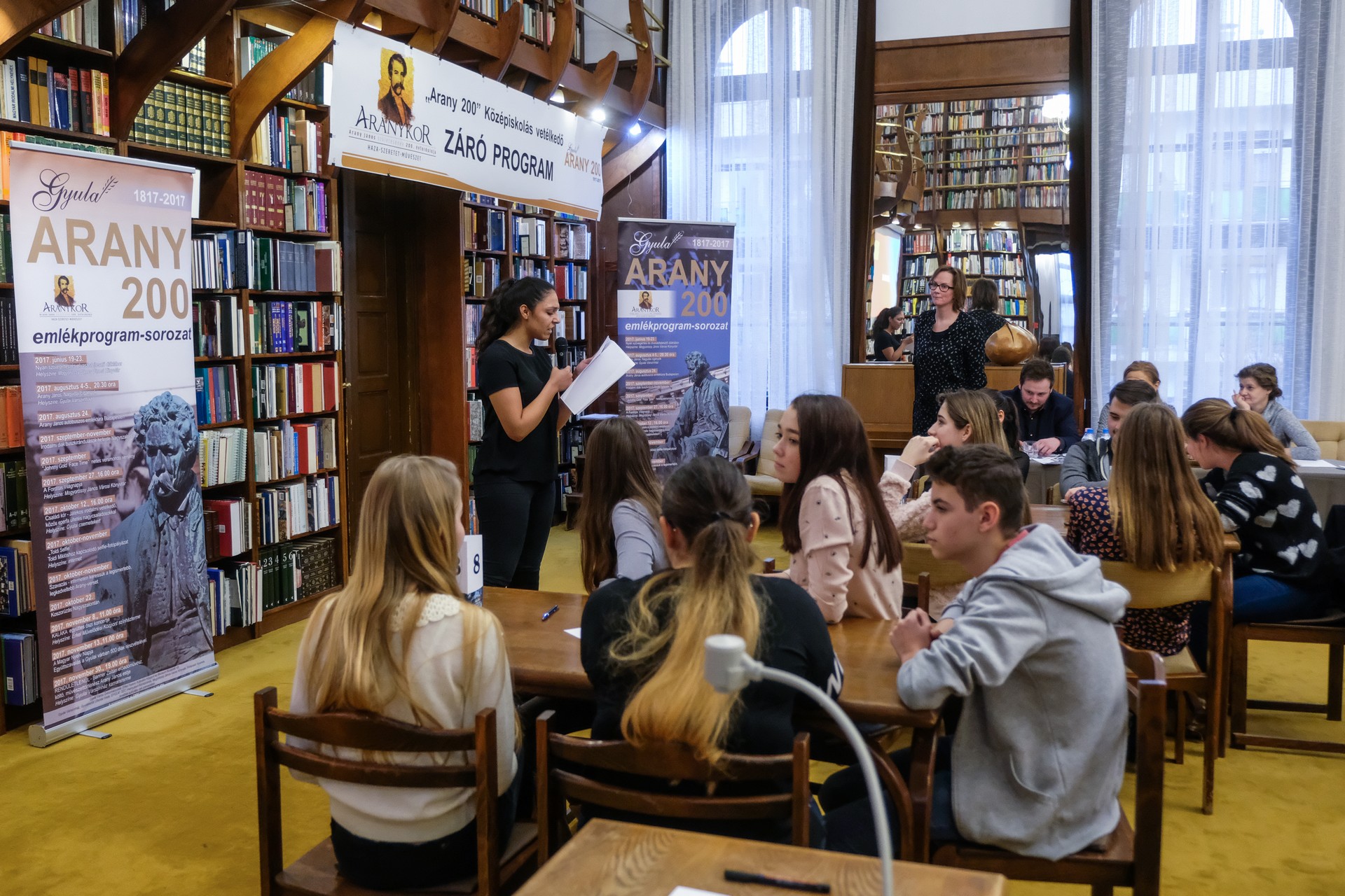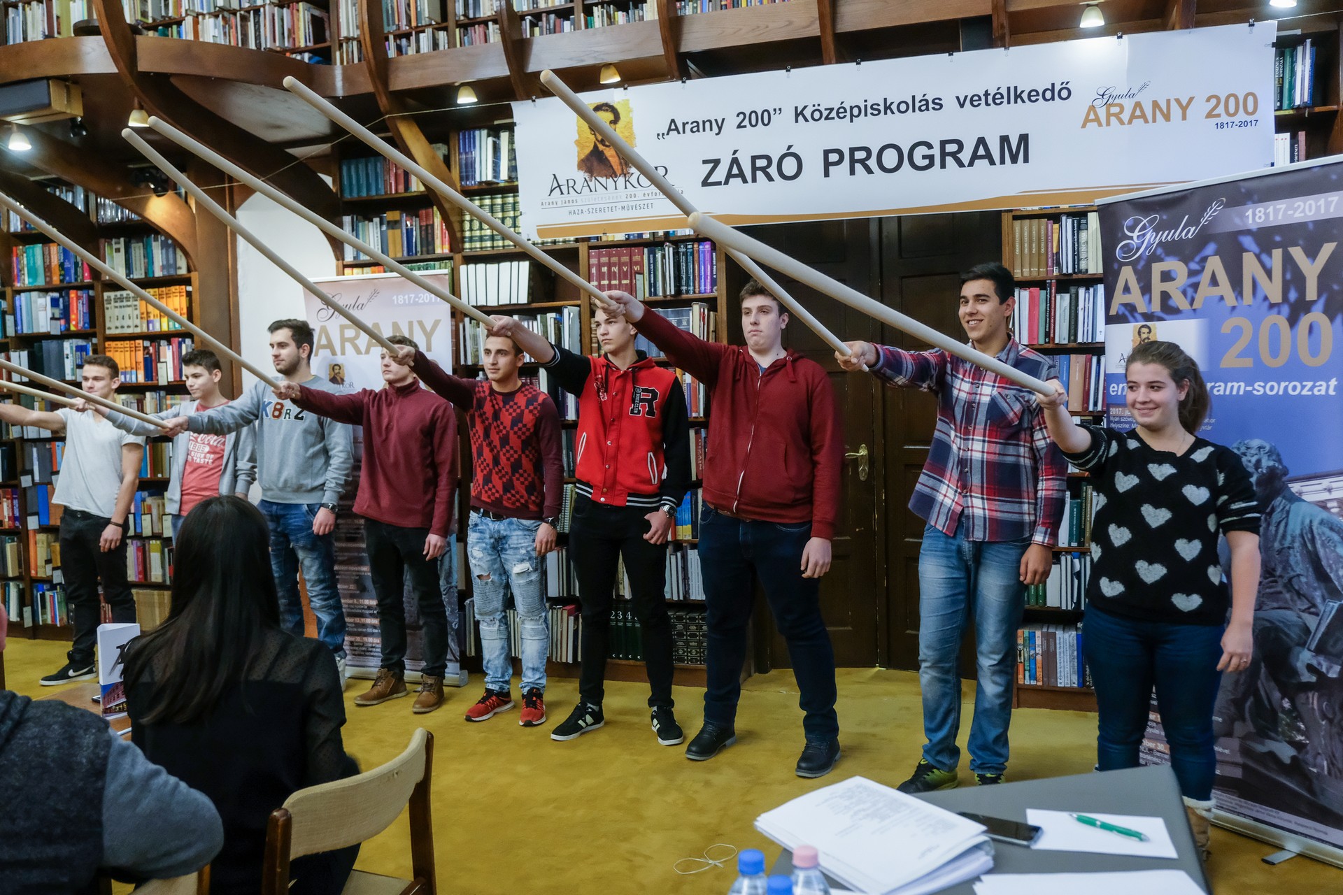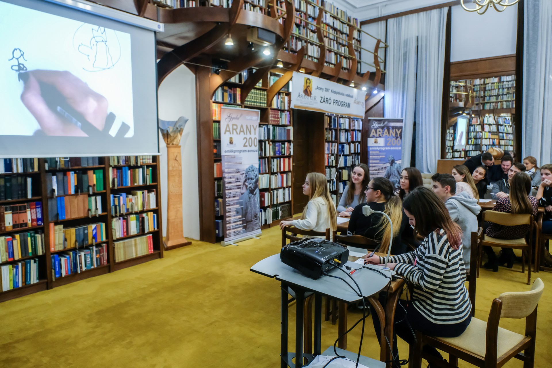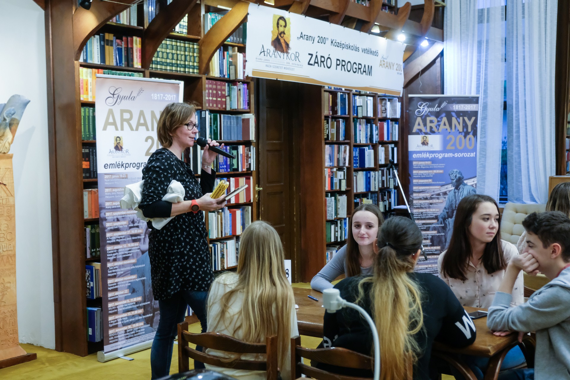 Dézsi János köszöntője után kezdetét vette az Arany János emlékére hirdetett vetélkedő, amelyen azok jártak jól, akik ügyesen tudtak improvizálni, a kreatív megoldásokban is jeleskedtek, és akár rappelni is hajlandók voltak. Schriffert-Tóth Eszter könyvtáros szórakoztató kihívásokat talált ki a fiataloknak, feladat volt például Arany János verseinek lerajzolása és a Fülemile című vers átírása különböző, ma népszerű stílusokra.