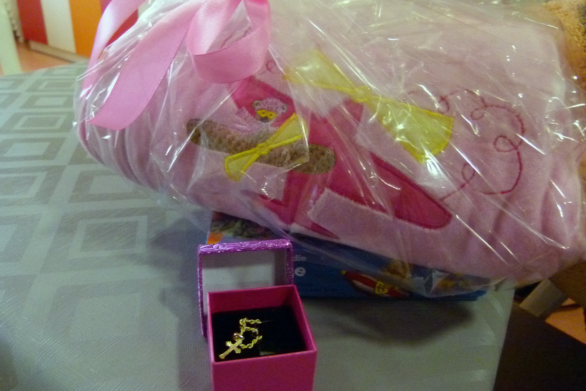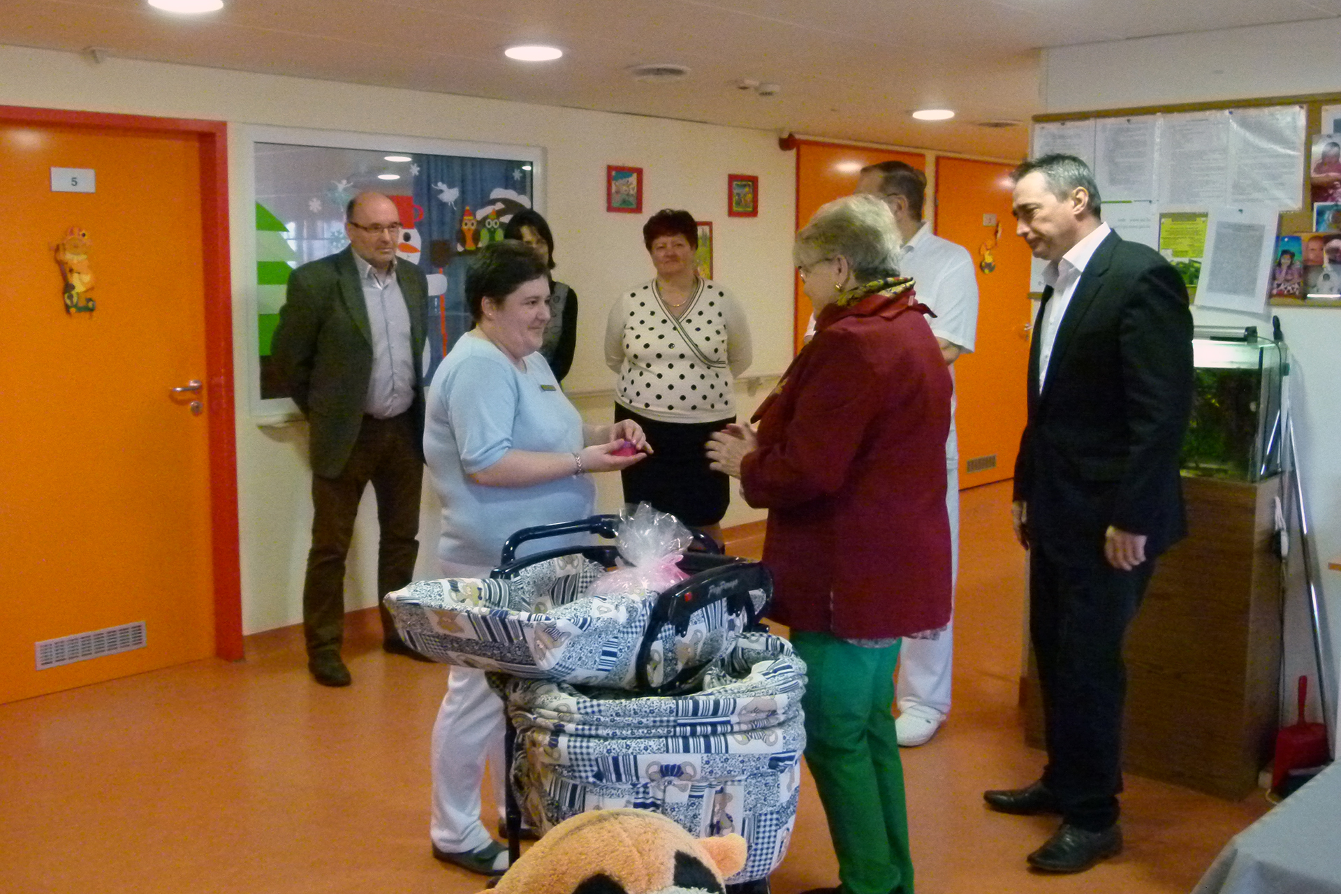 Mikus Éva, Franz Köstner és Bagosi Sándor babakocsival, ruhával és ajándékokkal kedveskedett a Réthy Fruzsina névre keresztelt kislánynak. Bagosi Sándor, a nemrég Sikeres Gyulai kitüntetést kapott fürdővárosi vállalkozó egy különleges nyakláncot is átnyújtott Fruzsinak.
