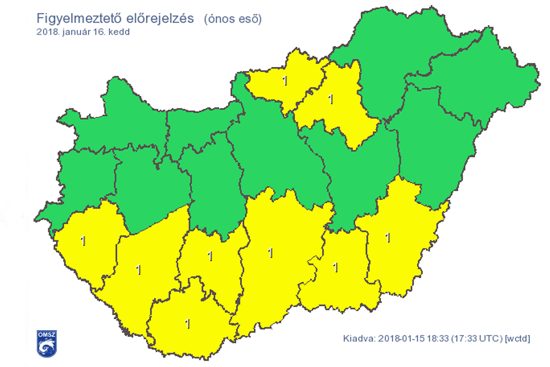 Térségünk mellett Baranya, Bács-Kiskun, Csongrád, Heves, Nógrád, Somogy, Tolna és Zala megyére adtak ki figyelmeztető előrejelzést.