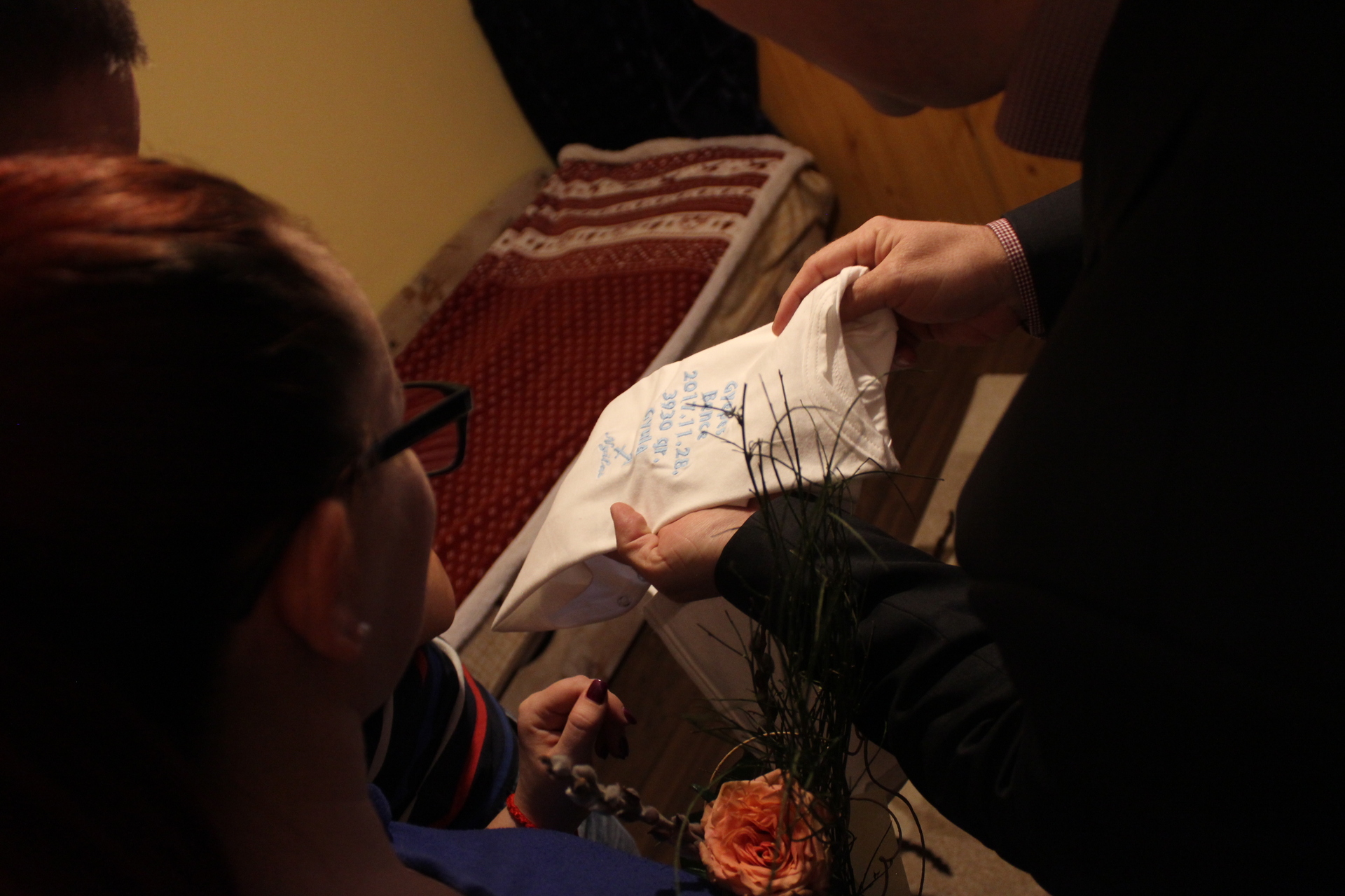 A szokásokhoz híven egy csokor virágot, egy Póka György-festményt és egy egyedileg hímzett gyermekruhát kapott a család.