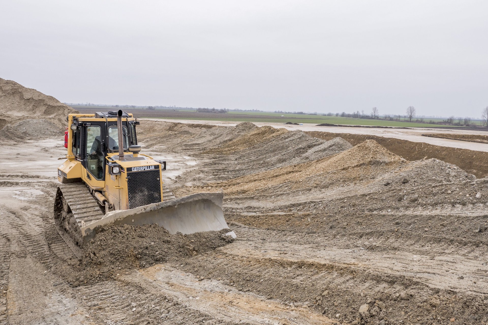Munkagép dolgozik az épülő M44-es gyorsforgalmi út nyomvonalán Csabacsűd közelében