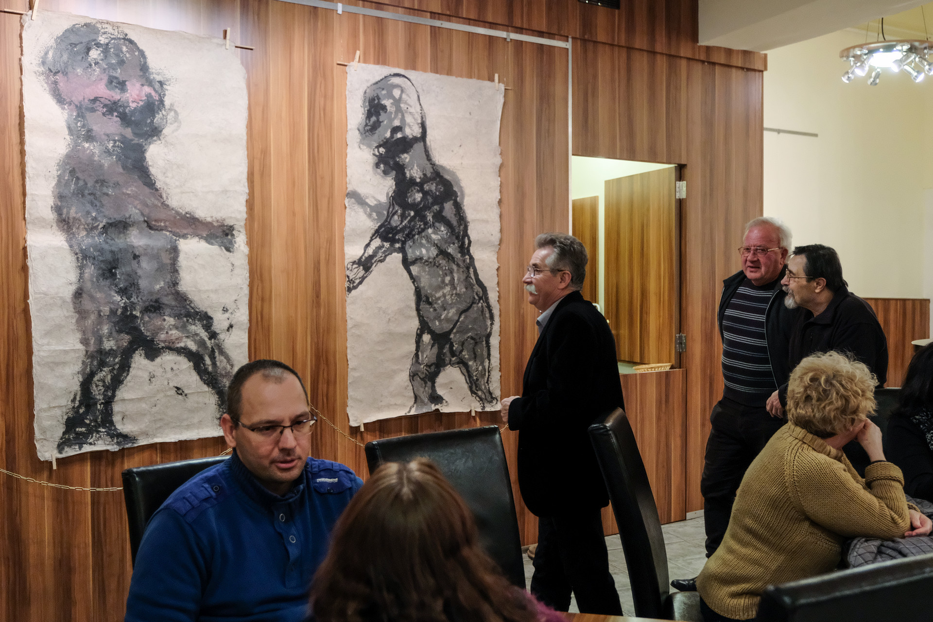 A méltató súlyos szavai helyénvalónak bizonyultak, hisz Gyarmati Gabriella művészettörténész Gaál József megrendítően erős munkái közül válogatta ki a tárlat anyagát. Ennek kapcsán Zalán Tibor megnyitóbeszédében kiemelte, az arányaikban végletekig eltorzított Gaál-figurák a test, a hús nehezékével, a bomlás, a rothadás kínjával és szégyenével vannak megpakolva. Nem a semmiben, hanem az érzékelhető térben mozognak. Árnyékuk nincs, önmaguk a vetett árnyak, és létük sincs, csak létezésük van. Tartanak valahová, de tartásuk a bizonytalanságé, mozgásuk a semmi felé kaparászó bizonytalanság.
