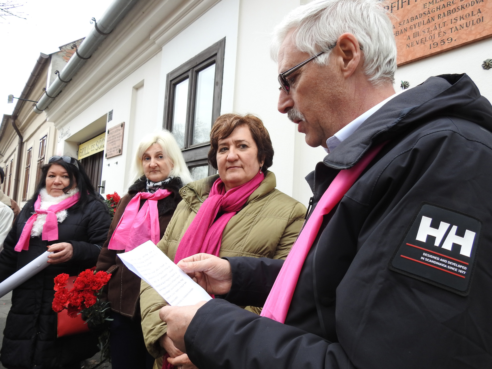 A demonstráción a Békés megyei hármas számú választókerületben induló Pluhár László is részt vett. A szocialisták és a DK közös jelöltje rövid beszédet mondott az 1848-as honvédhadnagy, Pfiffner Paulina emléktáblájánál.