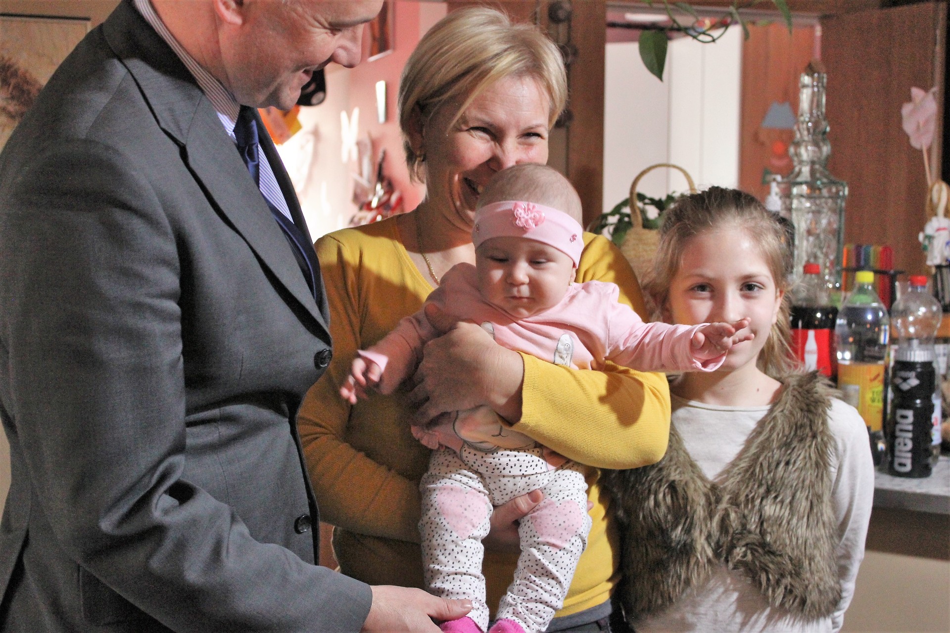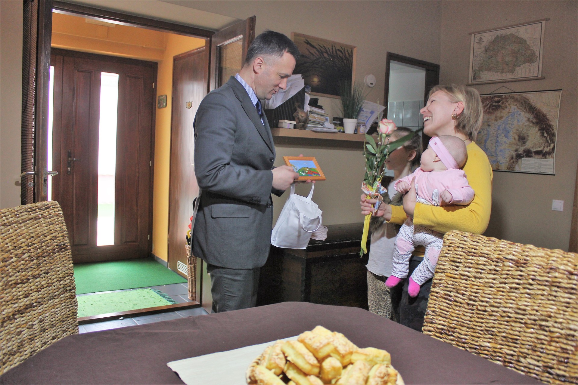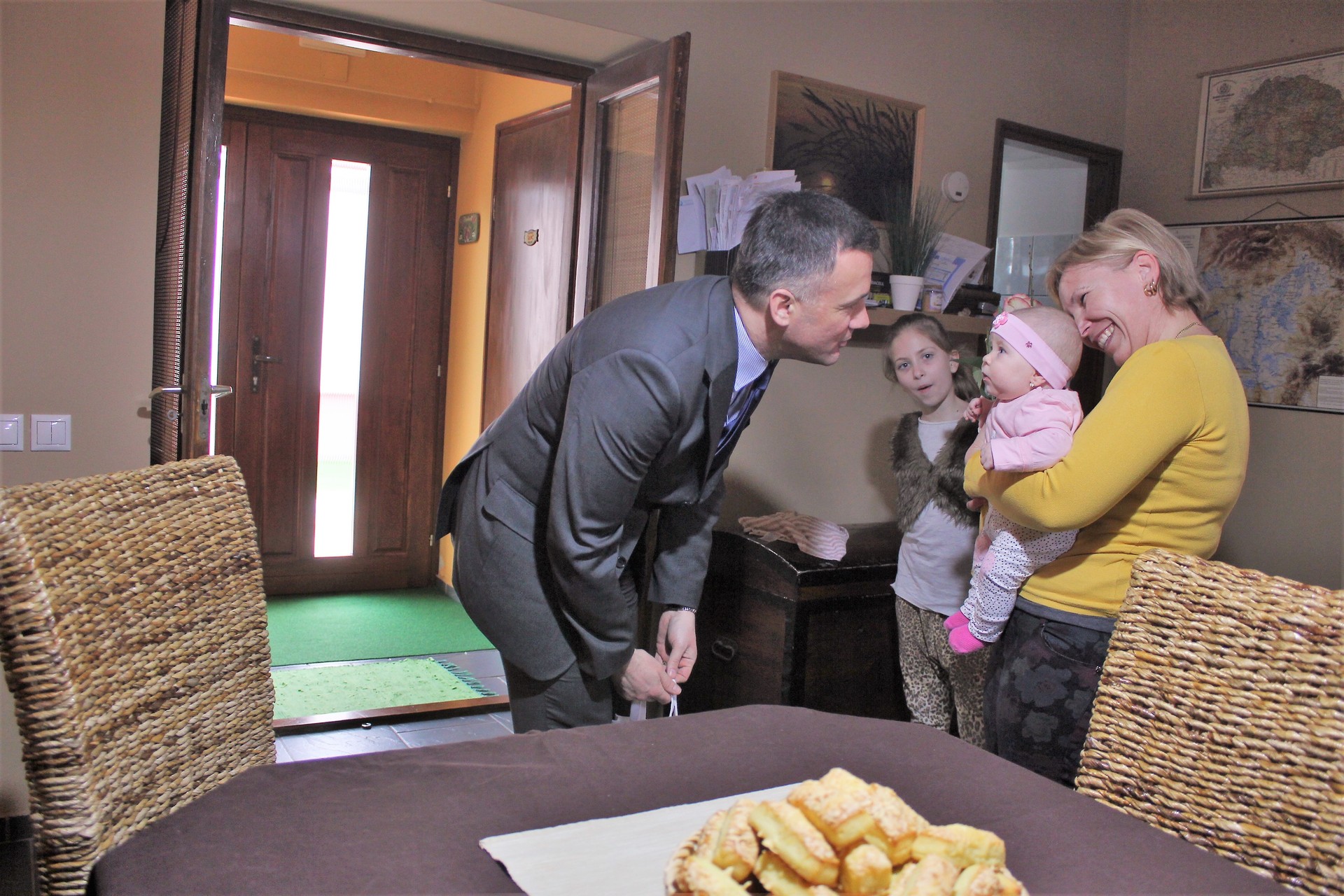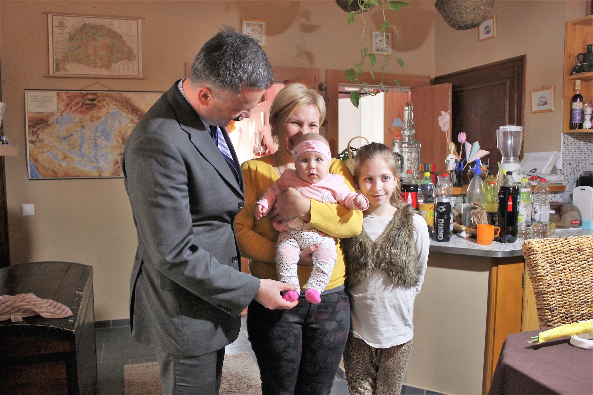 A városvezető egy Póka György-festményt, virágcsokrot és névre szóló, hímzett babaruhát vitt az apróságnak és családjának.