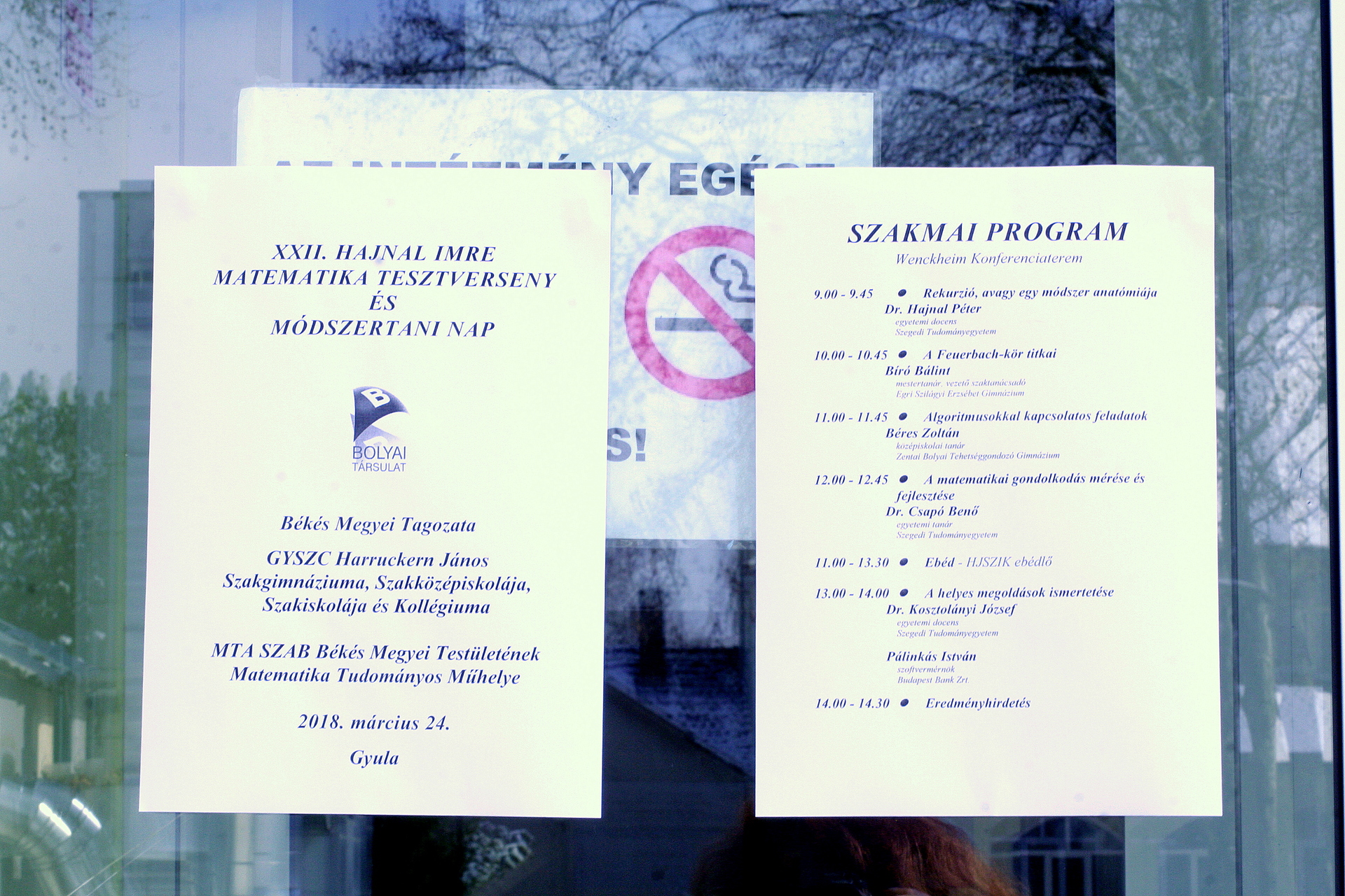 – A matematikus egy olyan ember, aki nem az élvezeteket halmozza, hanem inkább élvezi a halmazokat – zárta üzenetét a Bolyai társulat megyei elnöke, és ezzel megalapozta a megnyitót követő vetélkedő hangulatát. A diákoknak Marczis György középiskolai tanár, a BJMT Békés megyei tagozatának titkára is sok sikert kívánt.