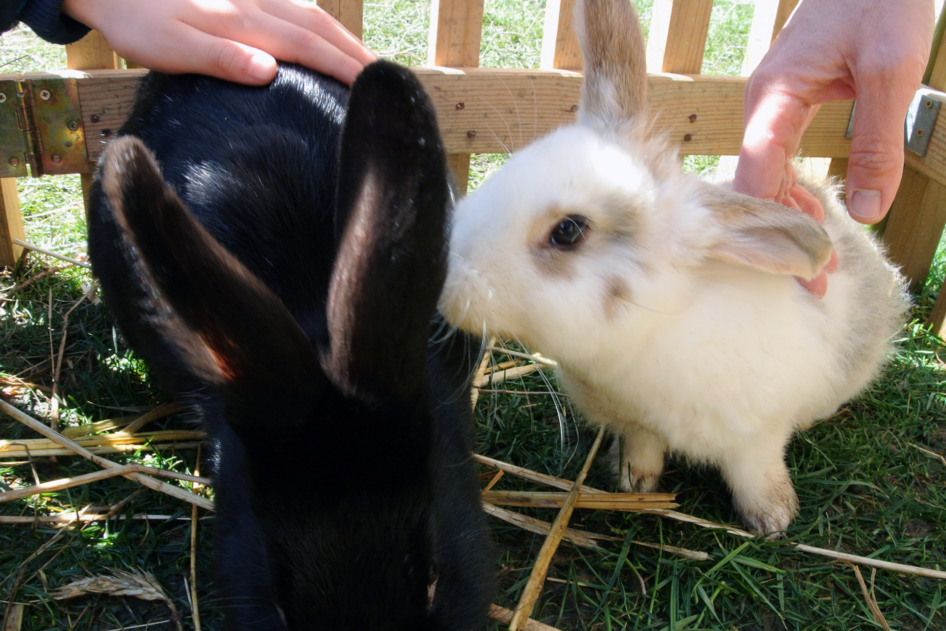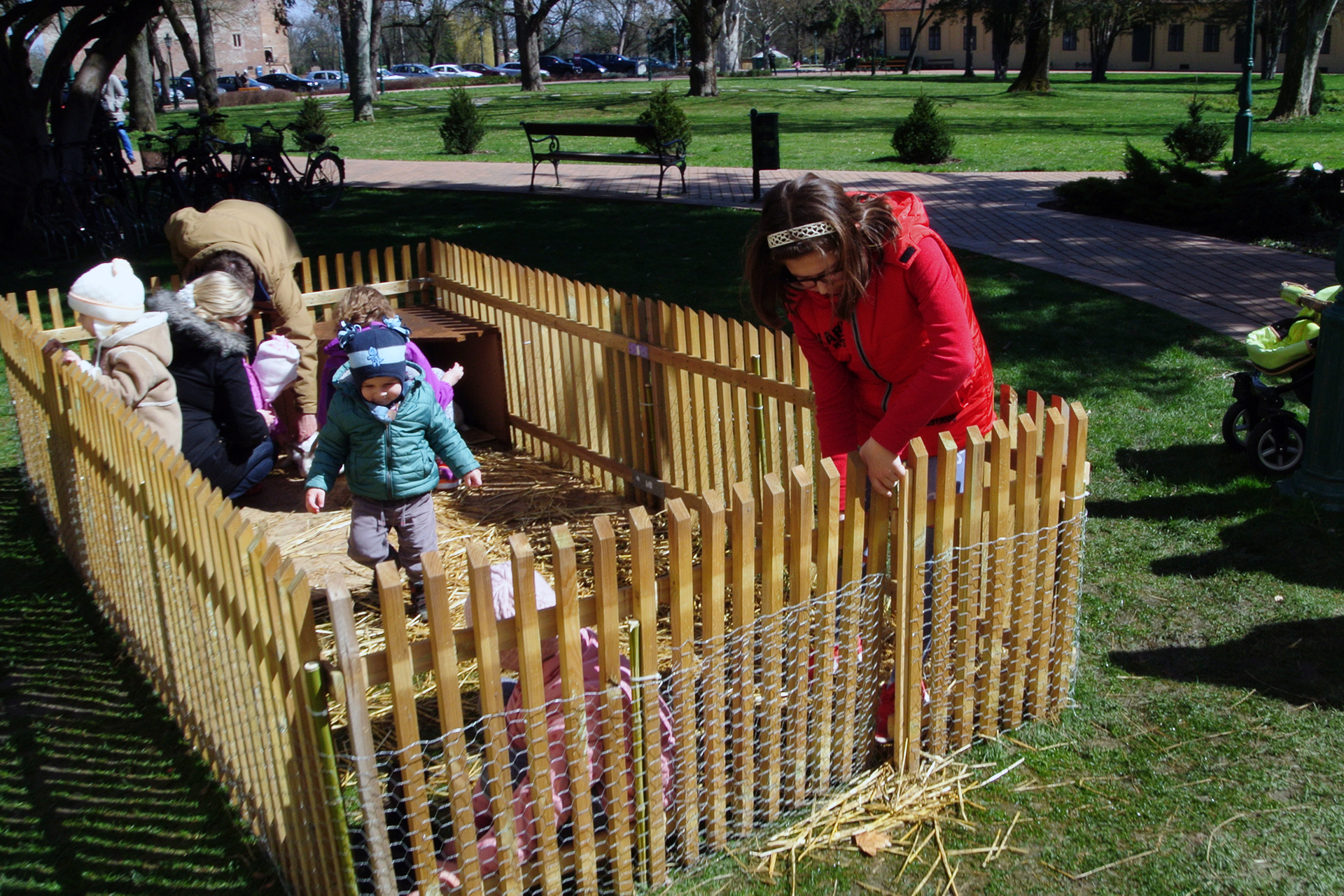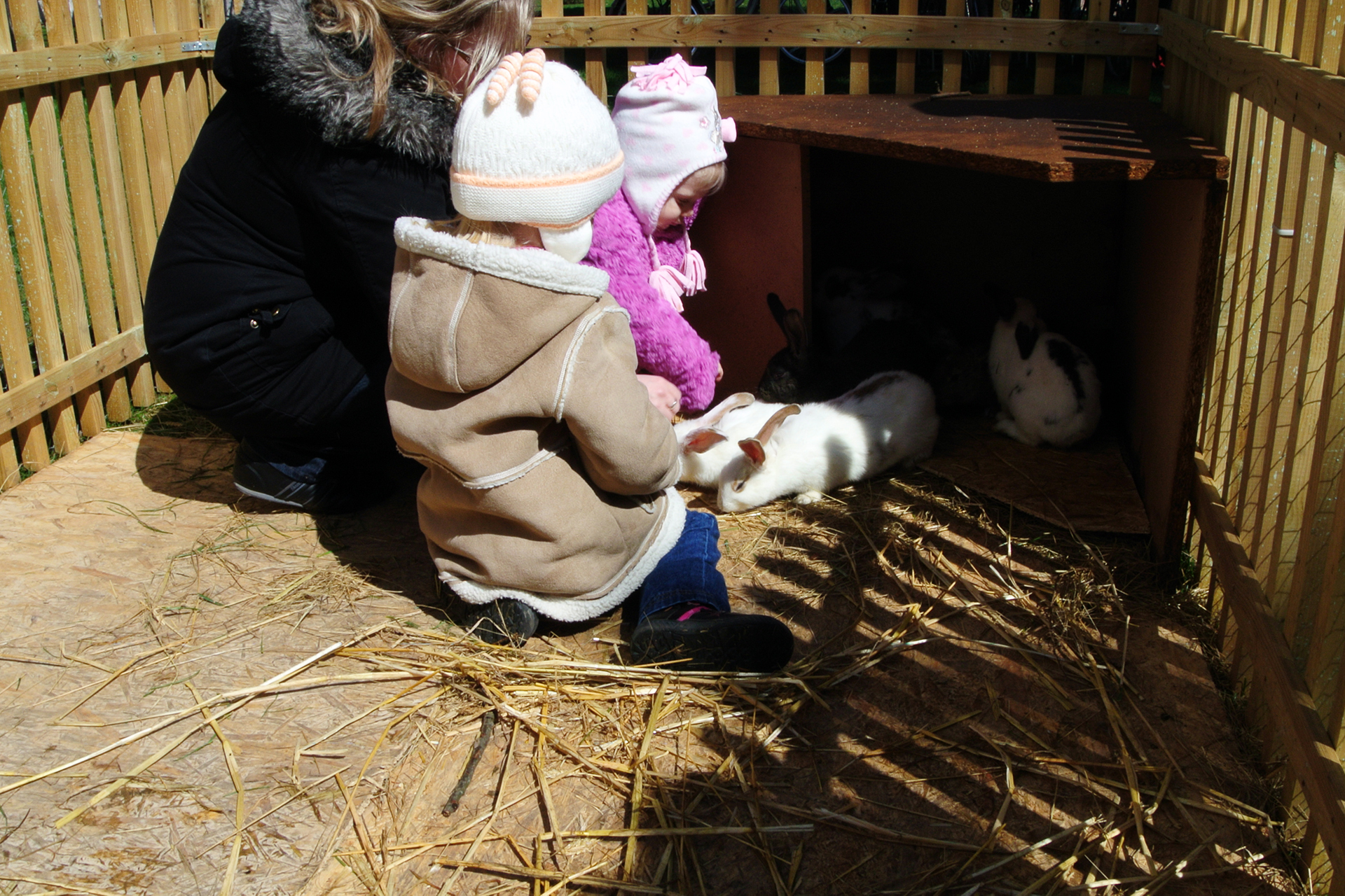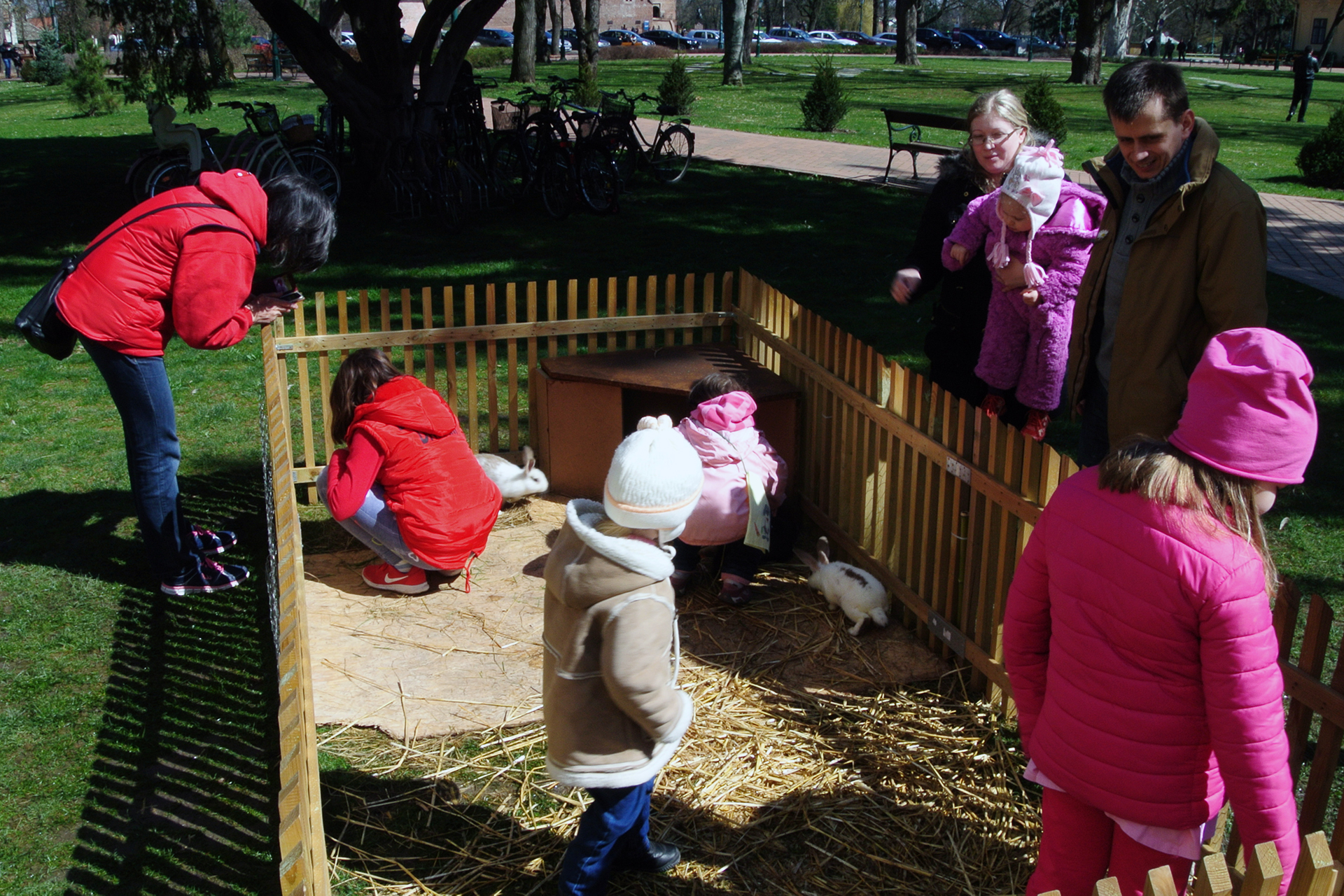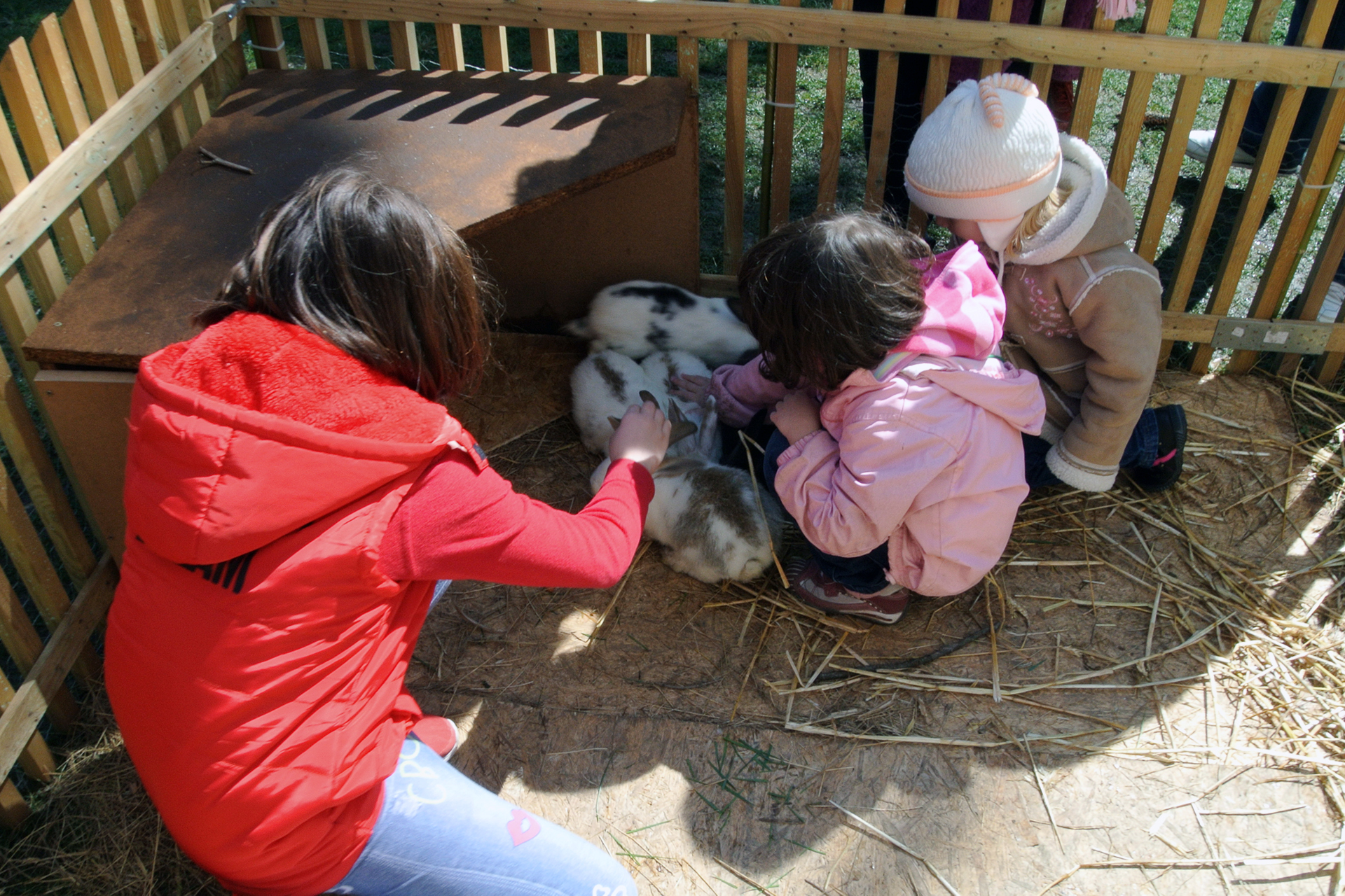 A kastély munkatársai a Török toronynál állították fel a tapsifülesek ideiglenes lakóhelyét. A fehér, fekete és tarka nyuszik sárgarépa-rágcsálás közben várják kis barátaikat.