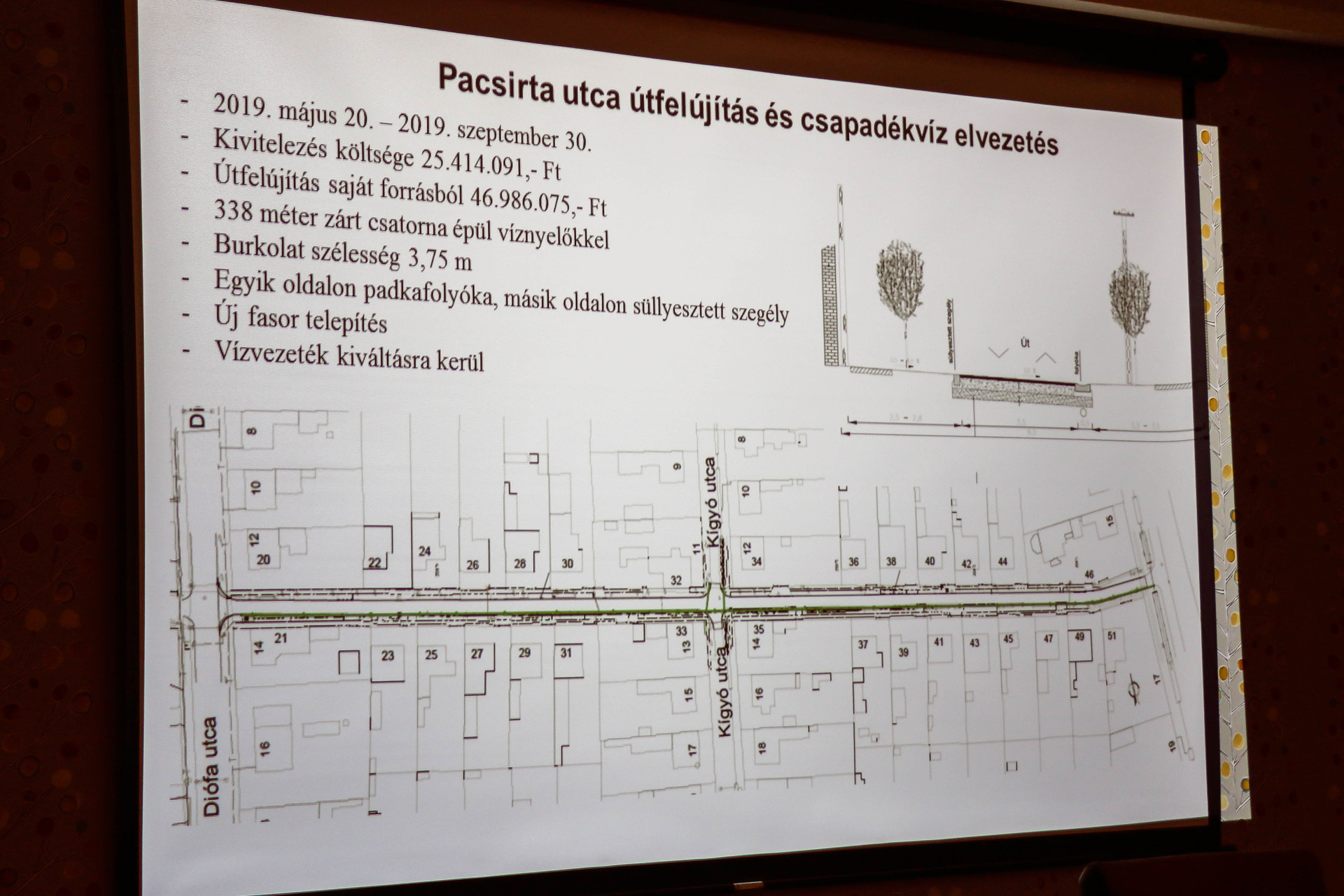 Görgényi Ernő elmondta, hogy tavaly két TOP-os pályázatot nyert az önkormányzat: az első támogatásból tizenegy helyszínen tudtak munkálatokat végezni városszerte, összesen 400 millió forintból, a második pedig 387 millió forintos támogatást jelentett, amelyből tizenkét helyszínen valósítanak meg beruházásokat, ebbe tartozik a Pacsirta utca és Tavasz utca felújítása is.