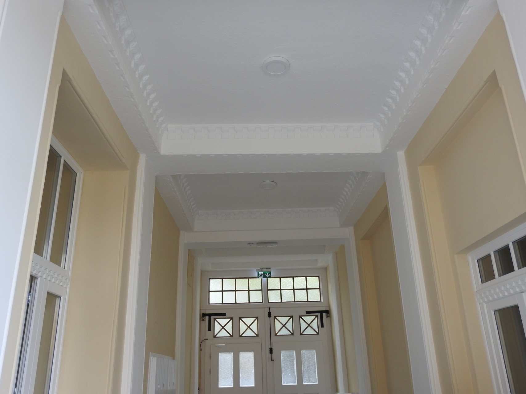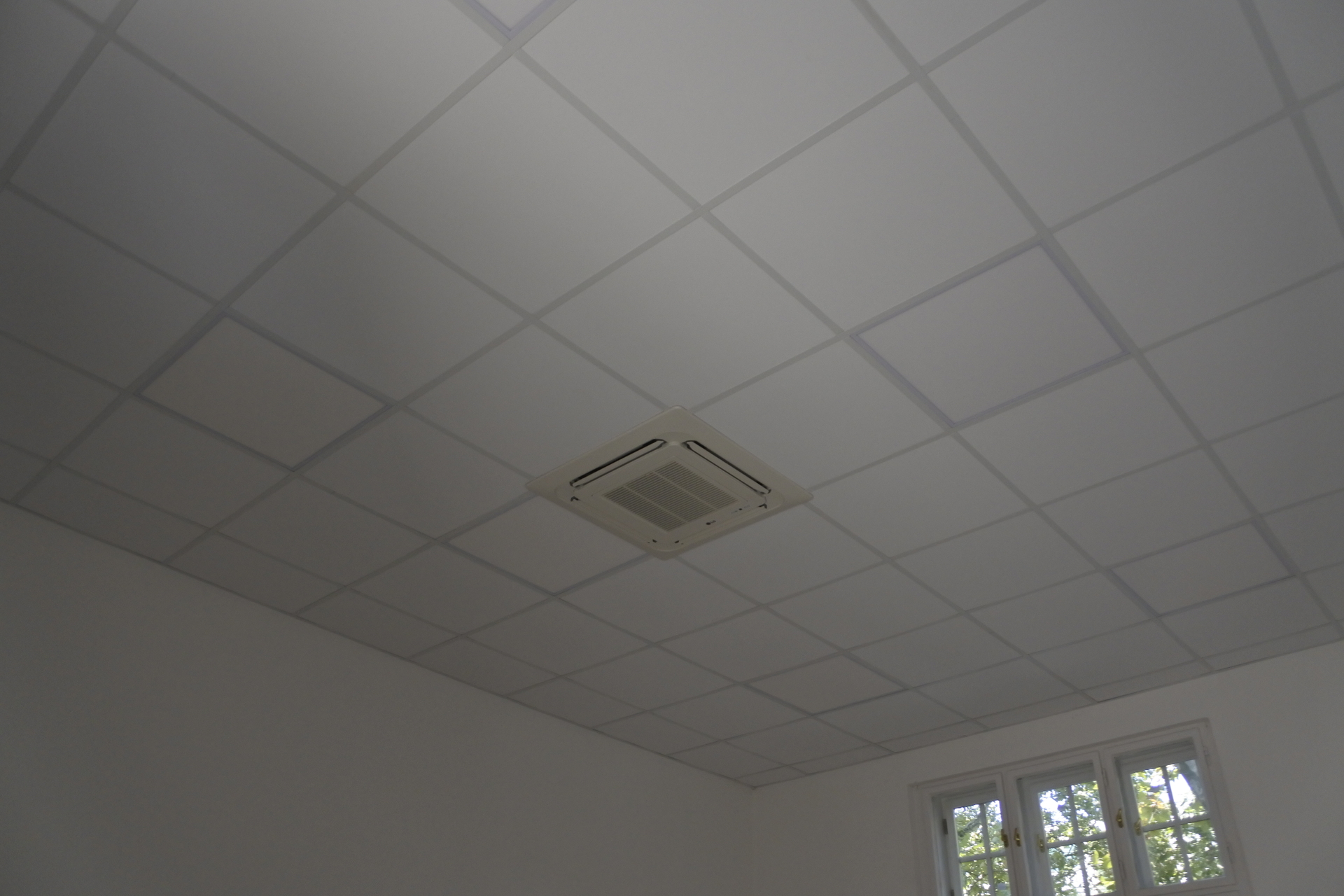 A belső terek egy részét újraburkolták, a pince és a lépcsőház kivételével a teljes mennyezeti felület hőszigetelt, kazettás álmennyezetet kapott, a falfelületeket a javítások elvégzése után újrafestették. A belső nyílászárók szintén megújultak.