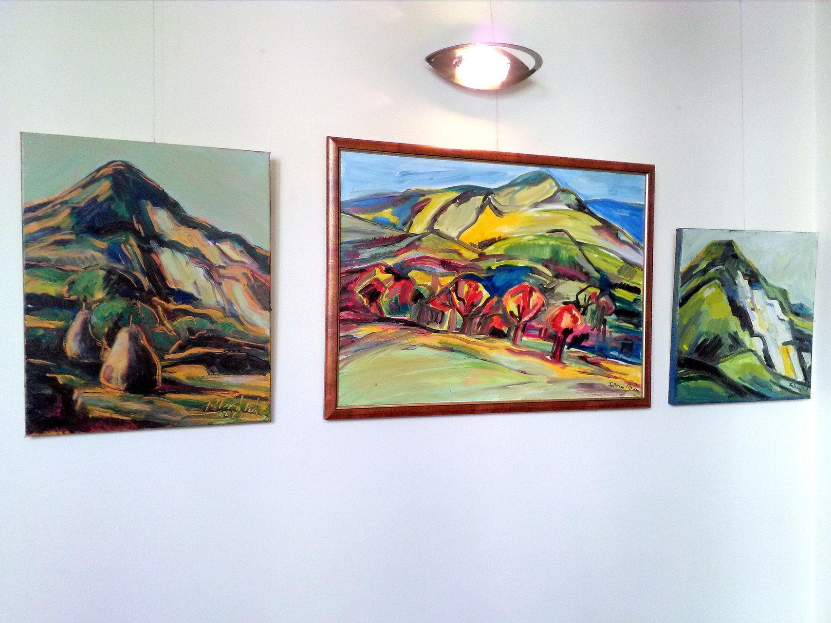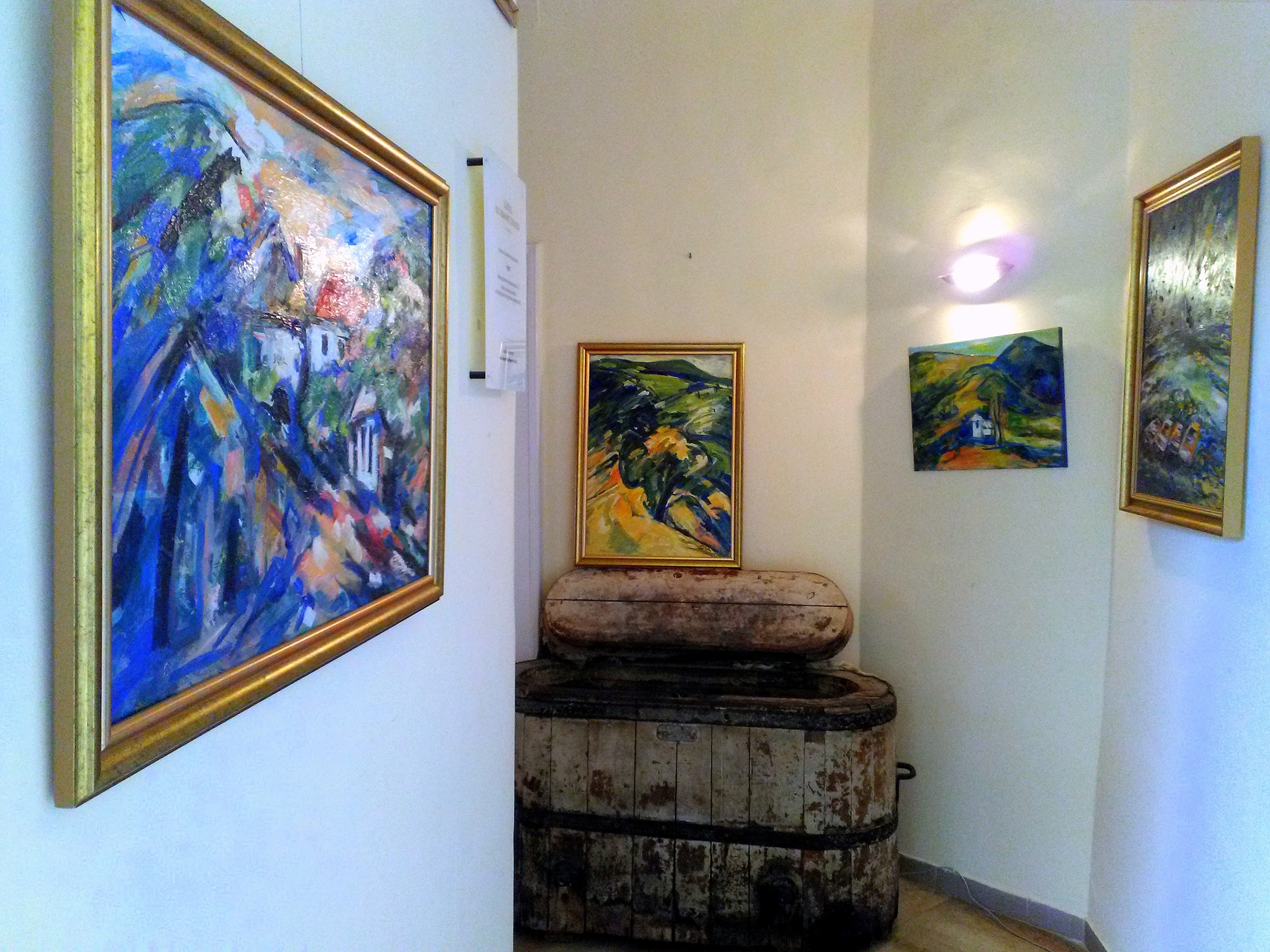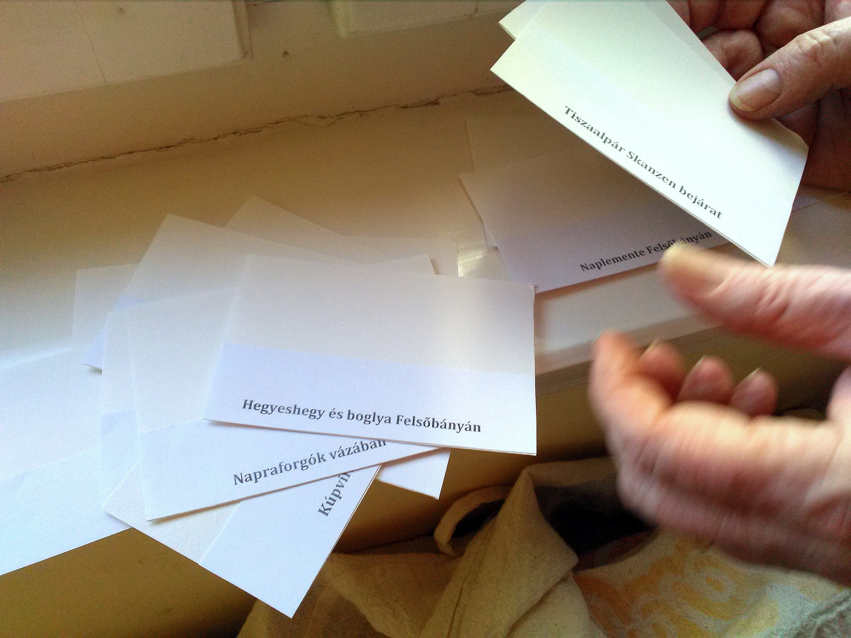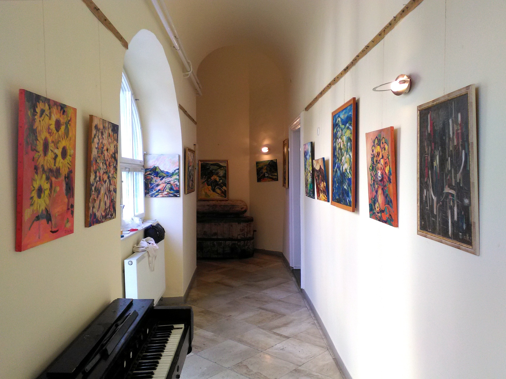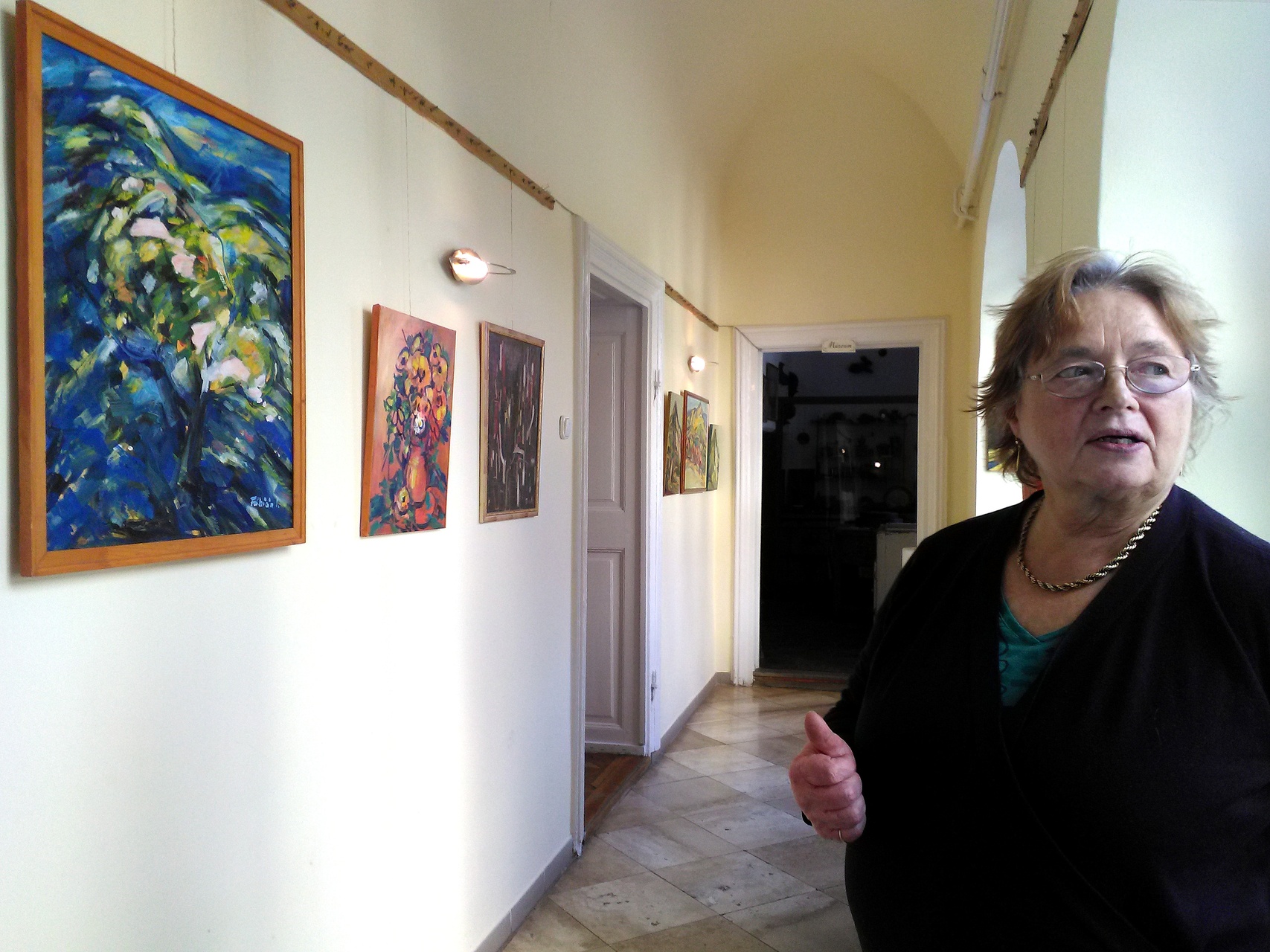 Ezúttal Fábián Irénnel találkoztunk össze itt, aki nem sokkal előttünk érkezett, de már a feliratokat rendezgette a folyosóra erőtlenül besütő nap fényében. A munka nagy részét ugyanis a festőnő előző nap már elvégezte.