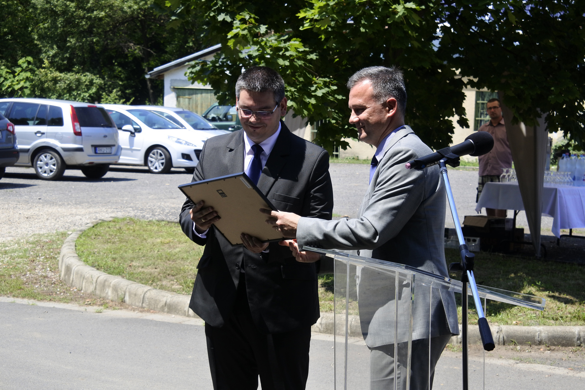 A köszöntők után emléklapokat adtak át a kivitelezésben résztvevőknek, a polgármester pedig egy emléktáblát adott át Csige Gábornak, a hivatal vezetőjének. Az ünnepség végén Csige Gábor, Görgényi Ernő, Gulyás Imre és Kovács József átvágták a napelemek előtt felállított szalagot, ezzel átadva a beruházást.