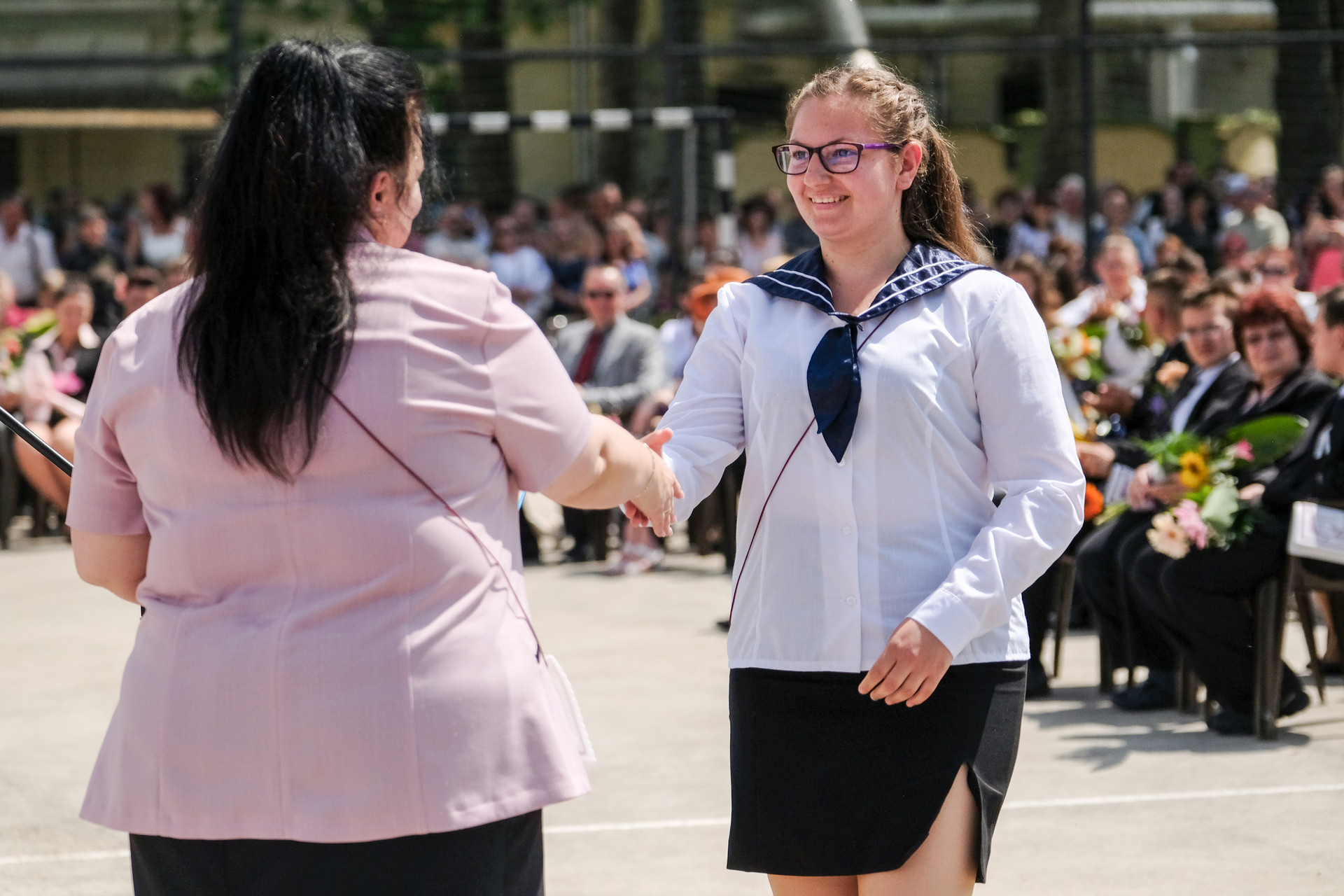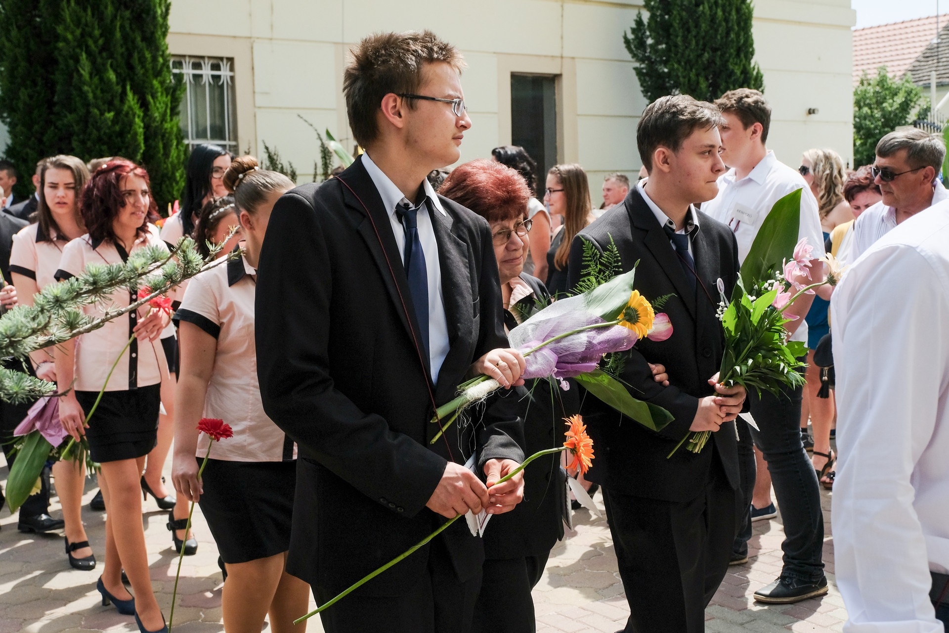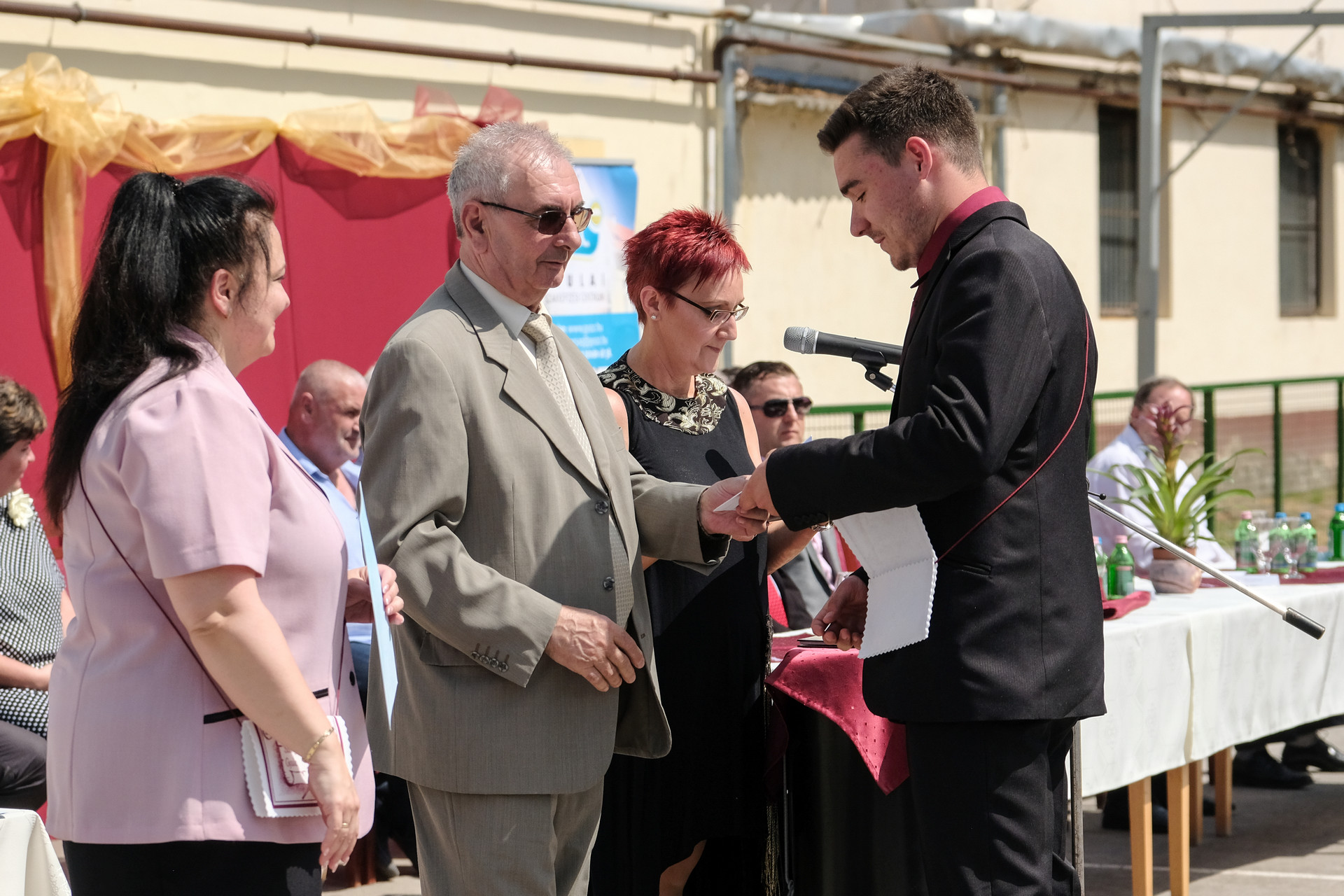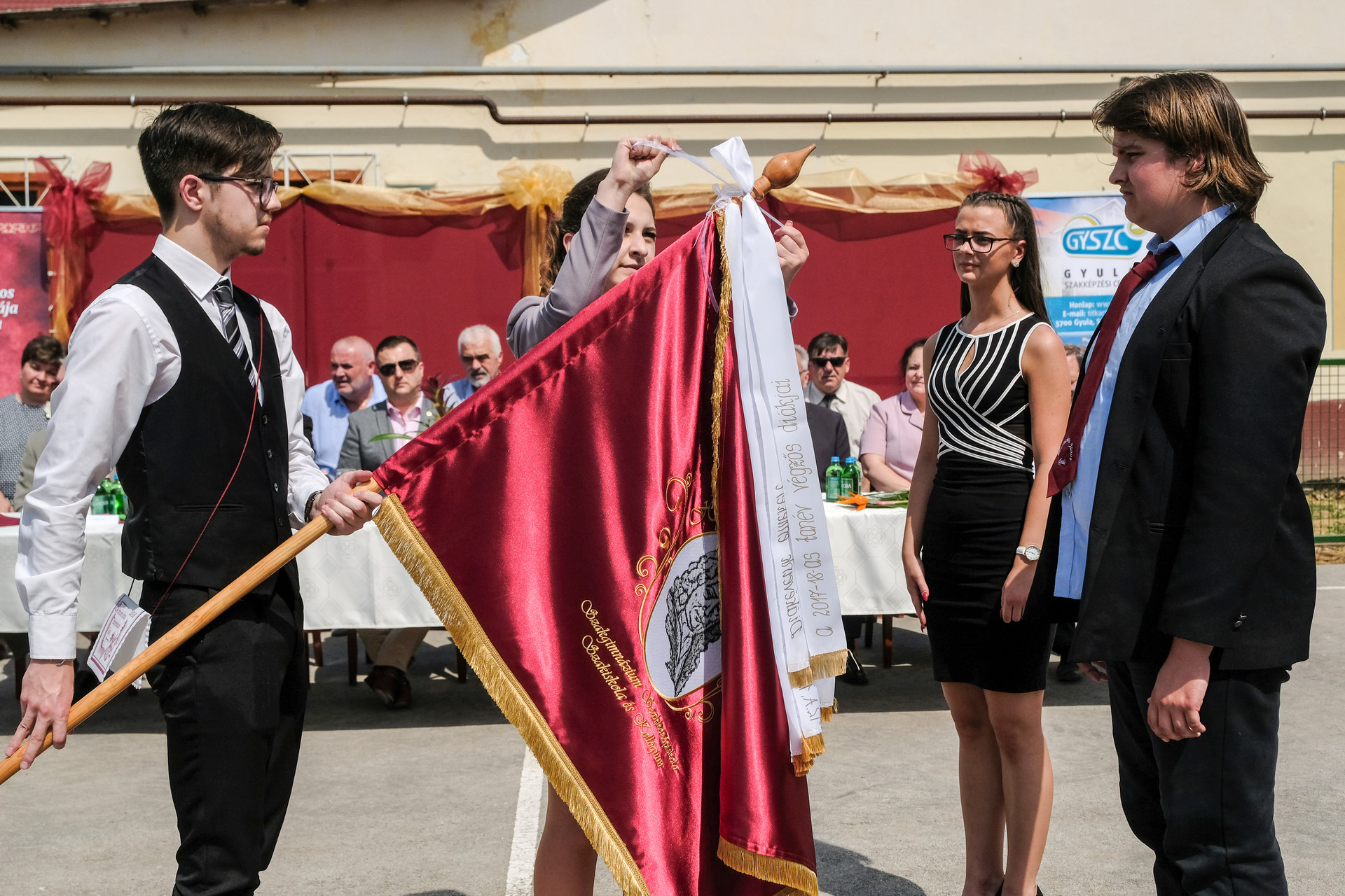 A végzősök képviseletében Kovács Alexandra és Kovács Dániel tűzte fel az ünnepi szalagokat a stafétabotot jelképező zászlóra, amit az iskola hagyományainak megfelelően a két diák ünnepélyesen nyújtott át az utánuk következő generációnak.