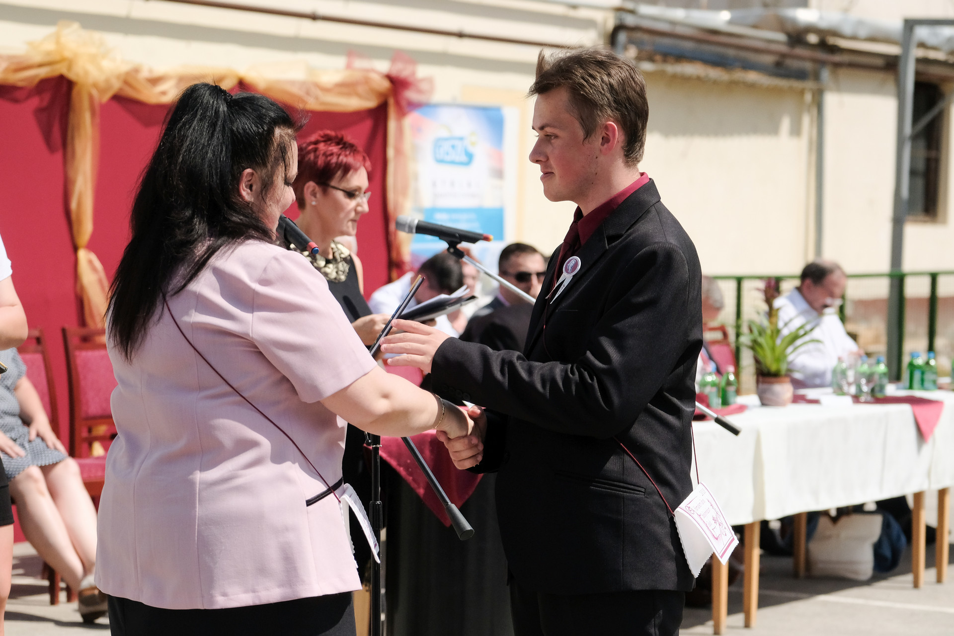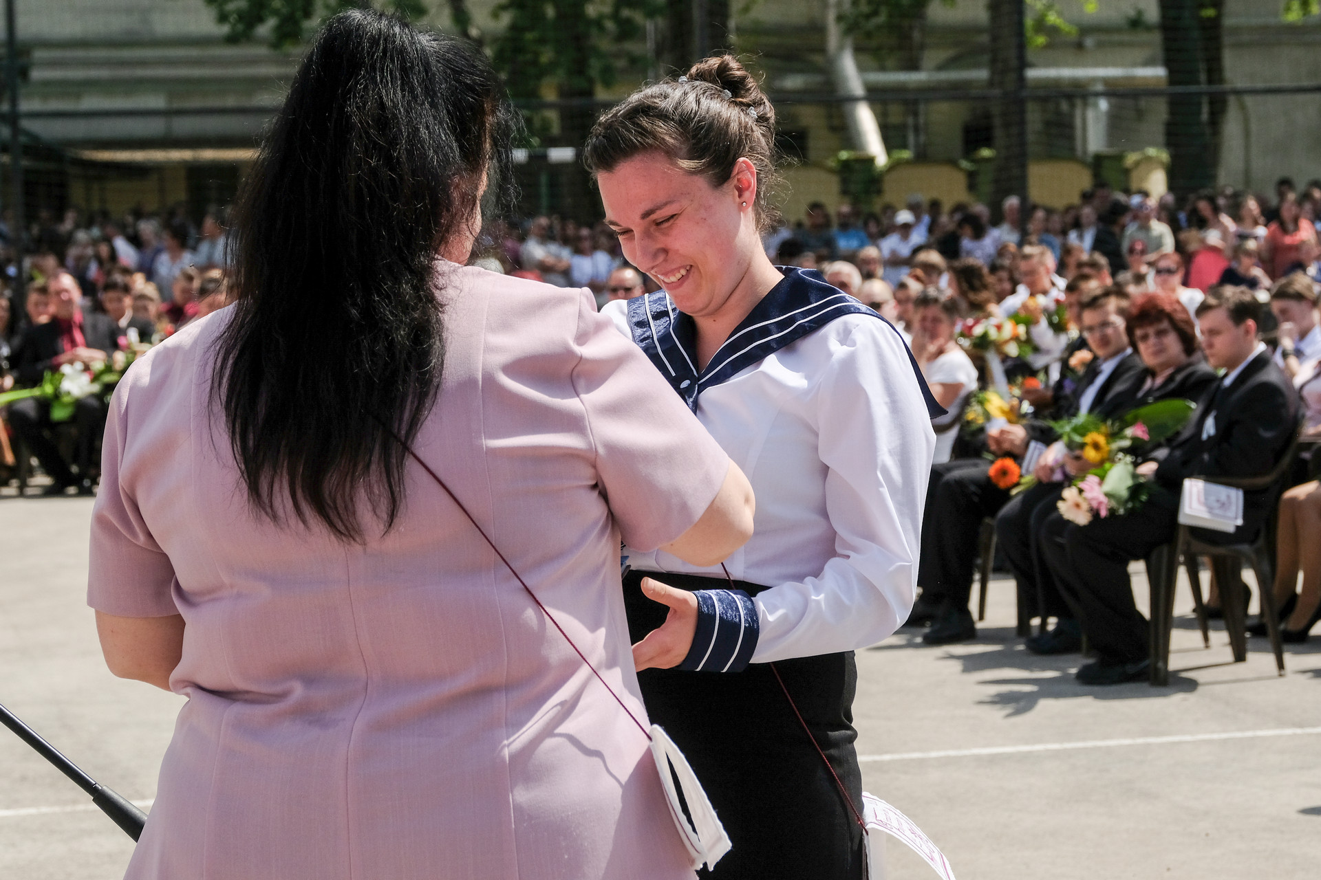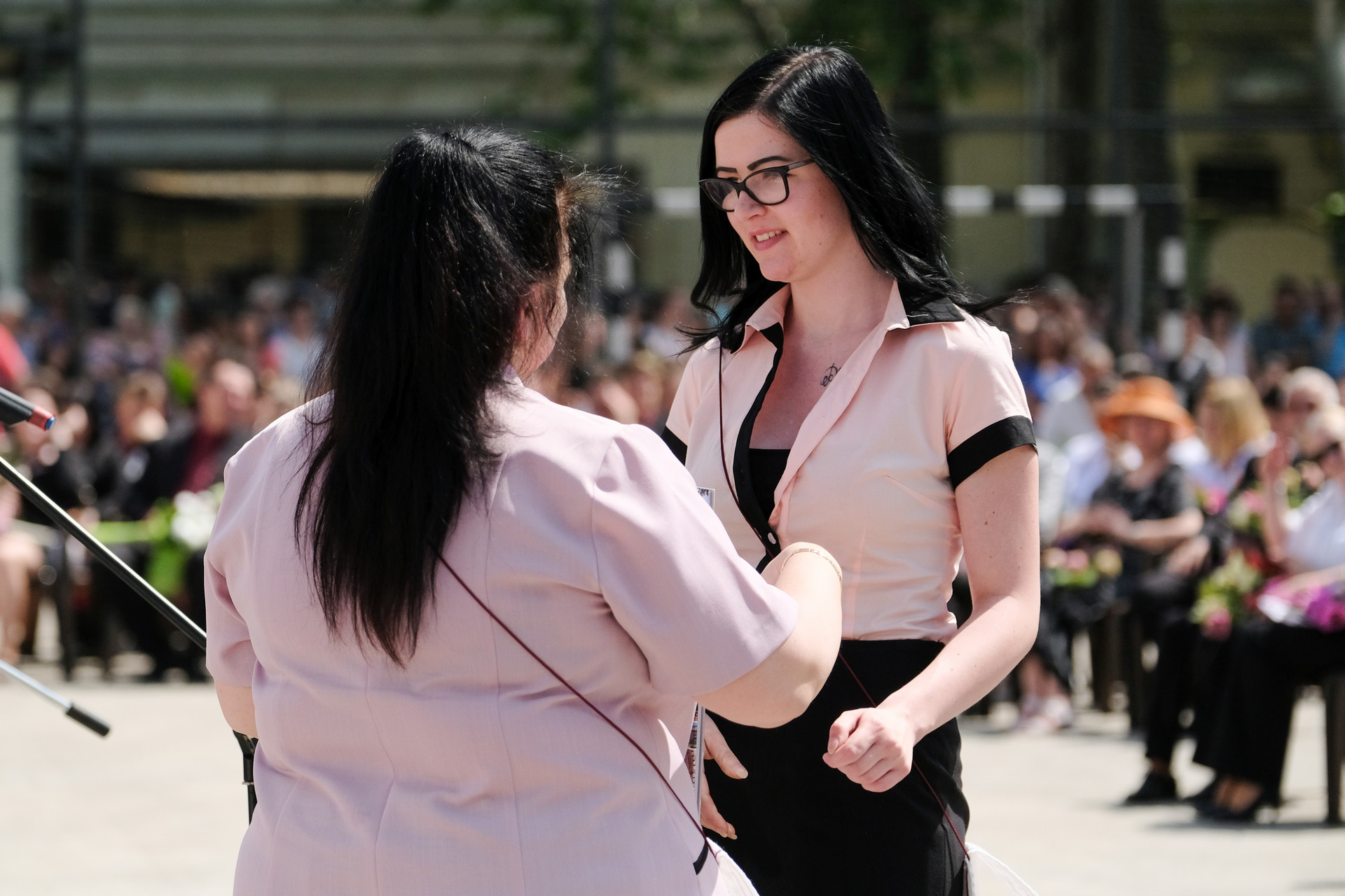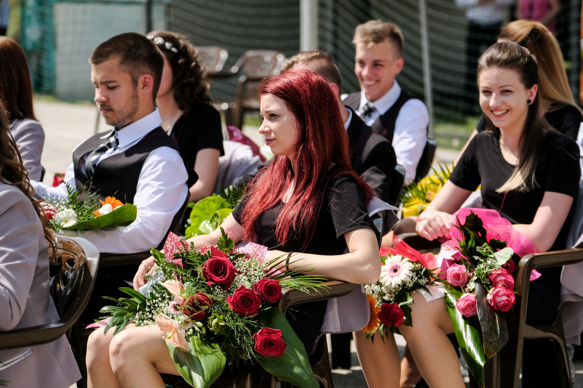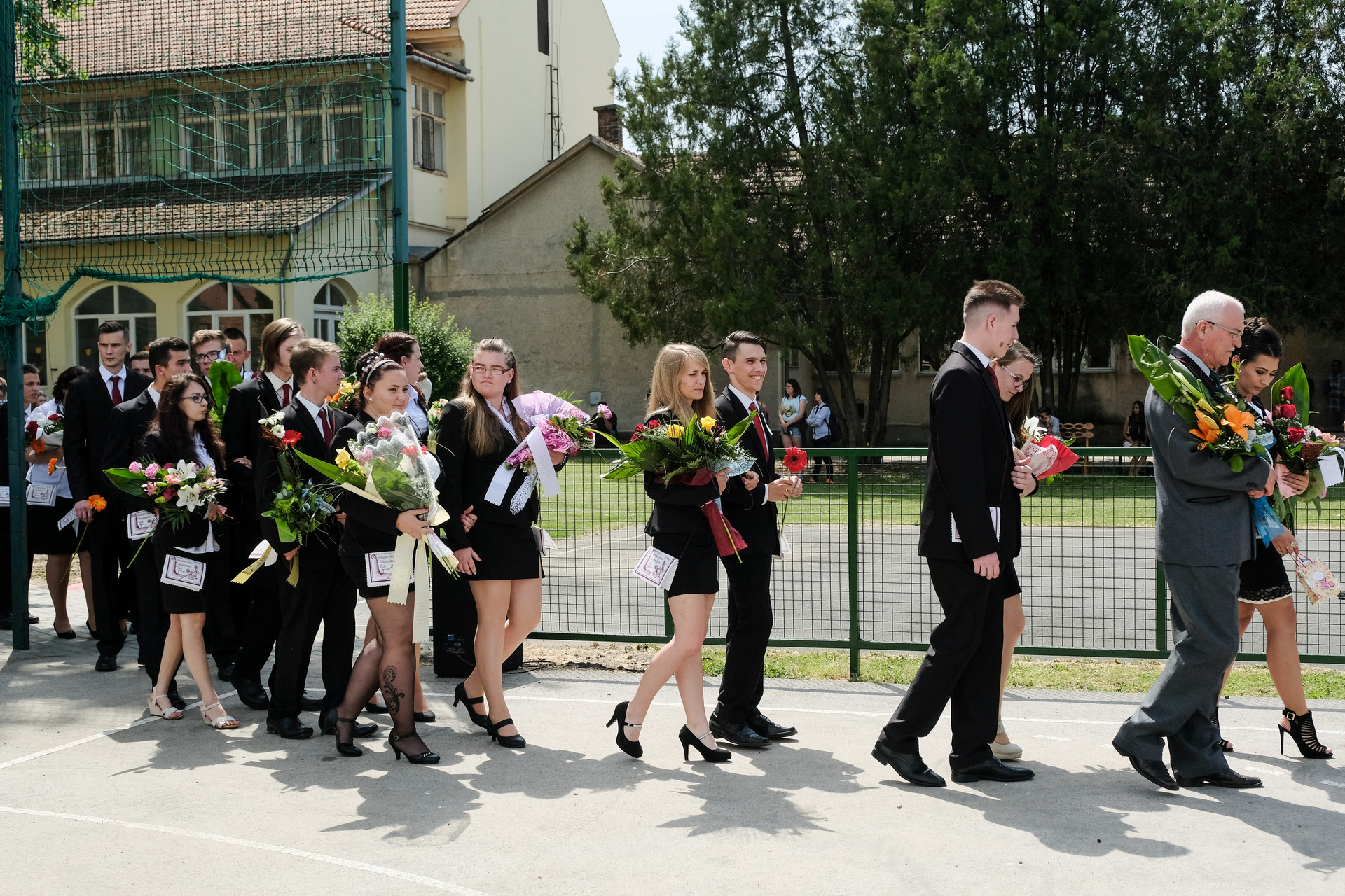 A végzősök képviseletében Kovács Alexandra és Kovács Dániel tűzte fel az ünnepi szalagokat a stafétabotot jelképező zászlóra, amit az iskola hagyományainak megfelelően a két diák ünnepélyesen nyújtott át az utánuk következő generációnak.