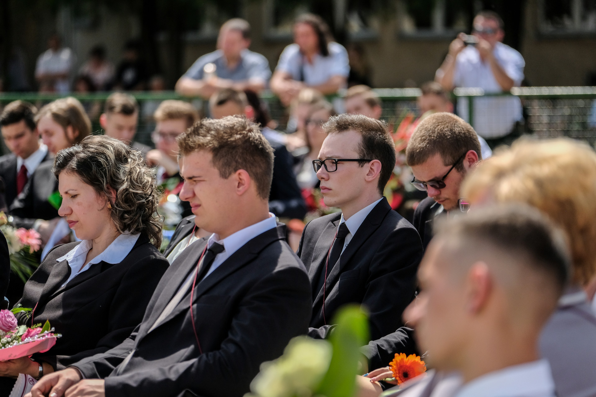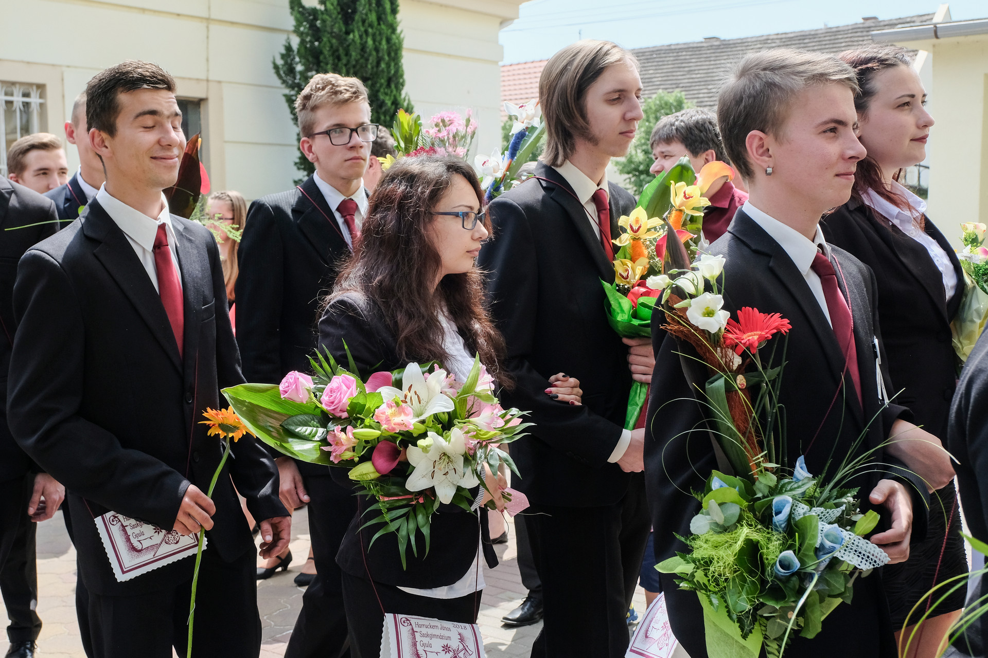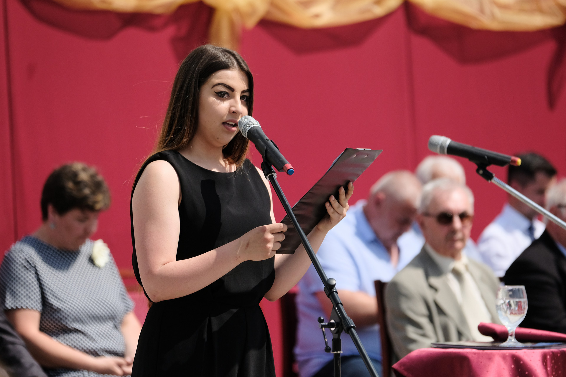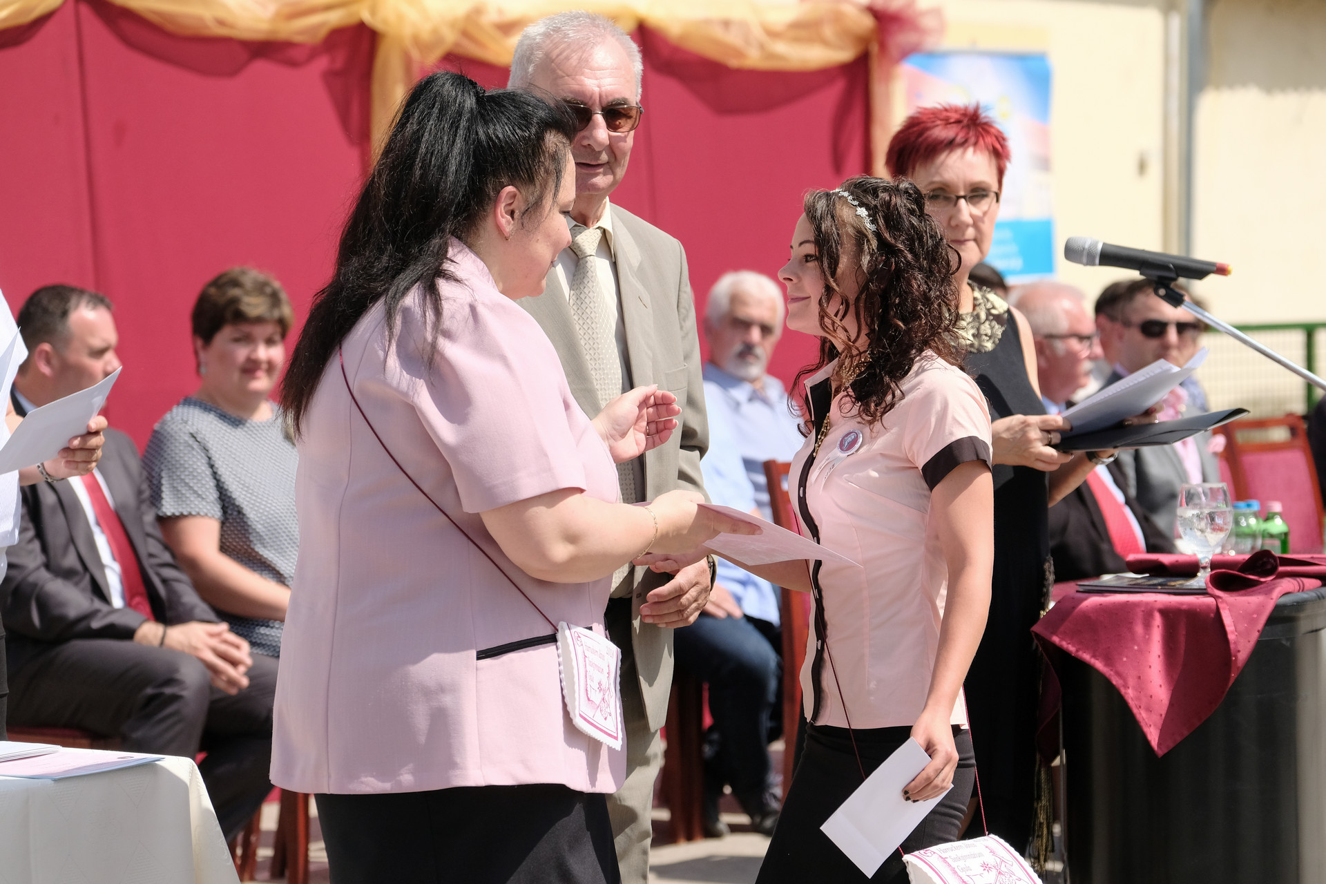 A végzősök képviseletében Kovács Alexandra és Kovács Dániel tűzte fel az ünnepi szalagokat a stafétabotot jelképező zászlóra, amit az iskola hagyományainak megfelelően a két diák ünnepélyesen nyújtott át az utánuk következő generációnak.