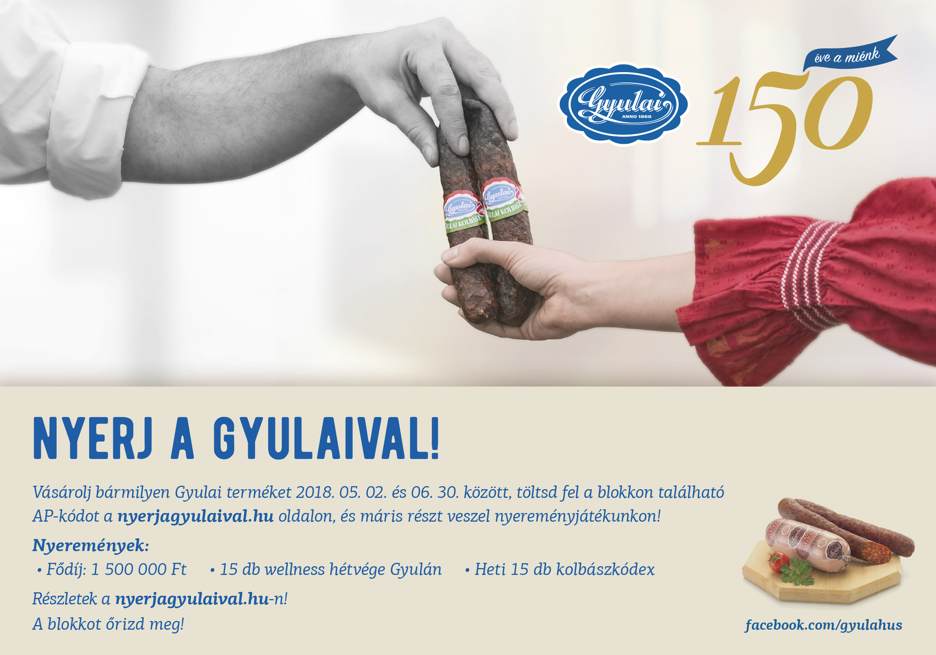 A gyulai húsipar fennállásának 150. születésnapja alkalmából eddigi legnagyobb nyereményjátékát hirdette meg országosan a Gyulahús Kft. A promóció lényege, hogy a cég által forgalmazott termékek vásárlása után jár egy AP-kód, amit fel kell tölteni a nyerjagyulaival.hu weboldalra. A nyereményakció 2018. május 2–2018. június 30. között tart.