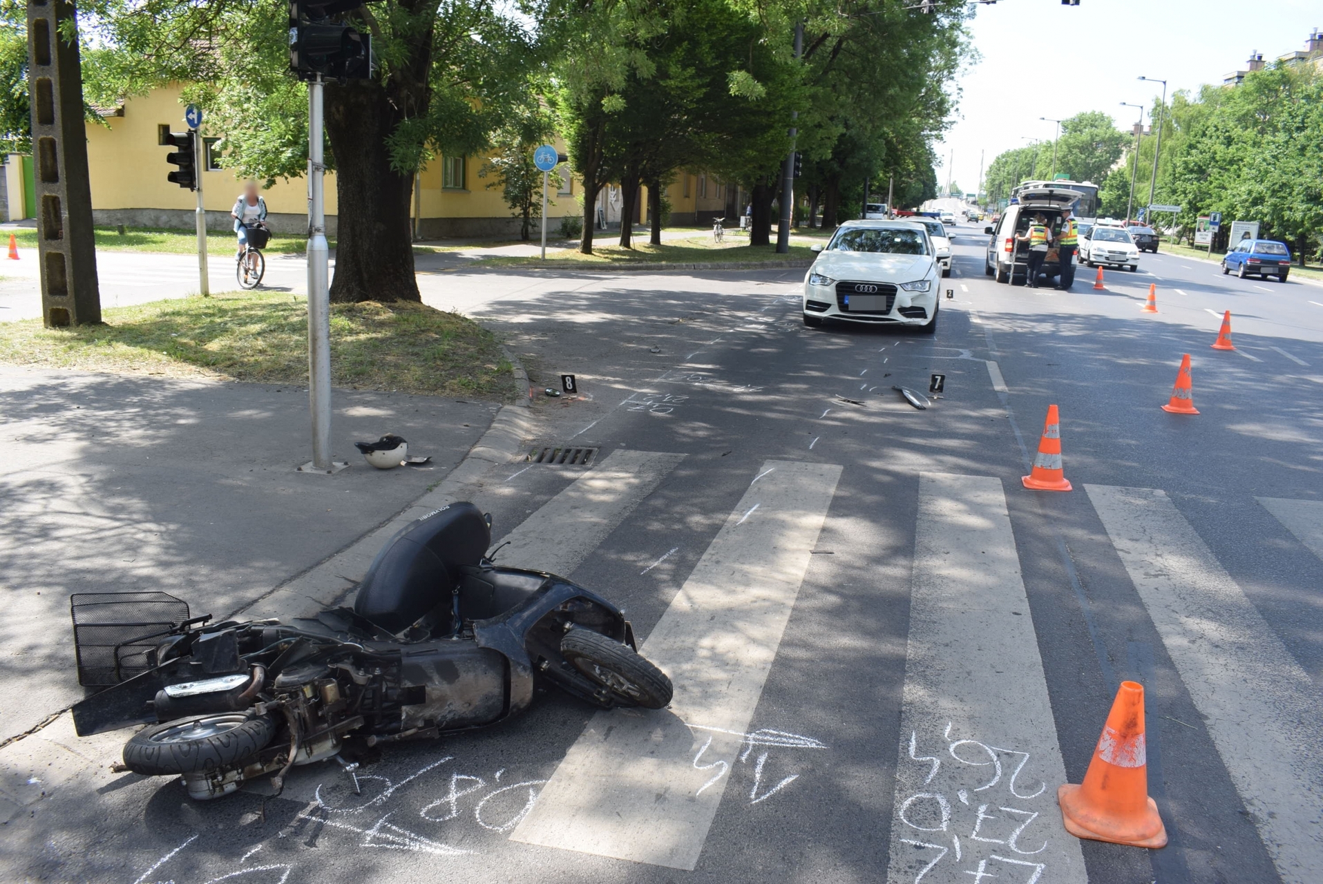 Békéscsabán, a Bartók Béla út és a Tulipán utca kereszteződésében május 8-án 10 óra 15 perc körül egy segédmotoros-kerékpárral közlekedő férfi a forgalomirányító jelzőlámpa tilos jelzése ellenére hajtott be a kereszteződésbe, ahol összeütközött egy személyautóval. A balesetben a motoros súlyosan megsérült.