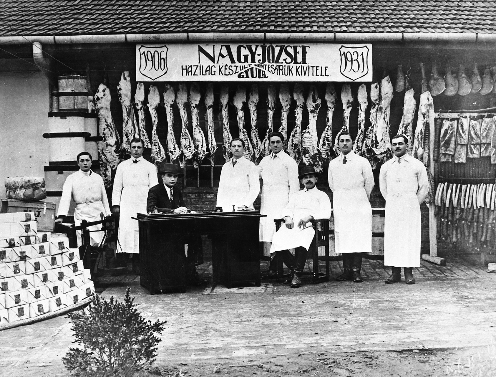 A gyulai húsipar történetét ismertető sorozatunk második részében olyan hentesdinasztiához érkeztünk, amely, ha nem is egyedülálló, de ritkaság városunkban. Kevesen büszkélkedhetnek ugyanis azzal, hogy családjuk három generációjának élete felöleli a gyulai húsipar szinte teljes 20. századi folyamatát. A 20. század elején a fizetőképes piac – a már említett kórház és katonaság – arra buzdította Nagy Józsefet (a nagyapát – 1878–1946), hogy felsorakozzon a többi hentes mellé, s erre alapozza saját és családja életét. Feleségével, Kocziha Zsófiával (1882–1949) 1906-ban alapította vállalkozását. Gyakorlatilag minden anyagi háttér nélkül indultak, hiszen mindketten félárvák voltak, de az 1910-es évekre már nemcsak húsboltjuk, hanem hentesüzemük is működött a Bajza utca közepe táján (a mai bérházak helyén). Az üzemben vágással nem foglalkoztak. Öt gyermekük volt: Lajos, József, Jenő, Margit és Ilona; akiket jelentős anyagi segítséggel tudtak útjukra engedni. Három generáció – nagyapa, fiú és unoka – életútjáról kérdeztük Nagy Józsefet, akit otthonában kerestünk fel. Nagyapám 1931-ben áthelyezte üzletét és üzemét a Szent István és a Kulcs utca sarkán lévő telephelyre. Majd a ’30-as évek közepén kora és betegsége miatt vállalkozása irányítását átadta édesapámnak, ifjabb Nagy Józsefnek. Ő új lendületet hozott a cégbe. A családi vállalkozás 1933-tól rendszeresen jelen volt és kiállított az ipari vásárokon, a vágáson kívül mindennel foglalkoztak, mindent feldolgoztak, s mindent el is adtak, hiszen apám vezérelve a minőség és a vevő kiszolgálása volt. A kiváló minőségű vastag- és vékonykolbász mellett füstölt, sózott teaszalonnát, disznósajtot értékesítettek, saját ammóniás hűtőrendszerük jeget állított elő, s szappant is főztek, csúcsidőszakban 20–30 emberrel dolgoztak folyamatosan. Az ebéd családias légkörben zajlott, nagymamám főzött a dolgozókra is – emlékezett Nagy József.