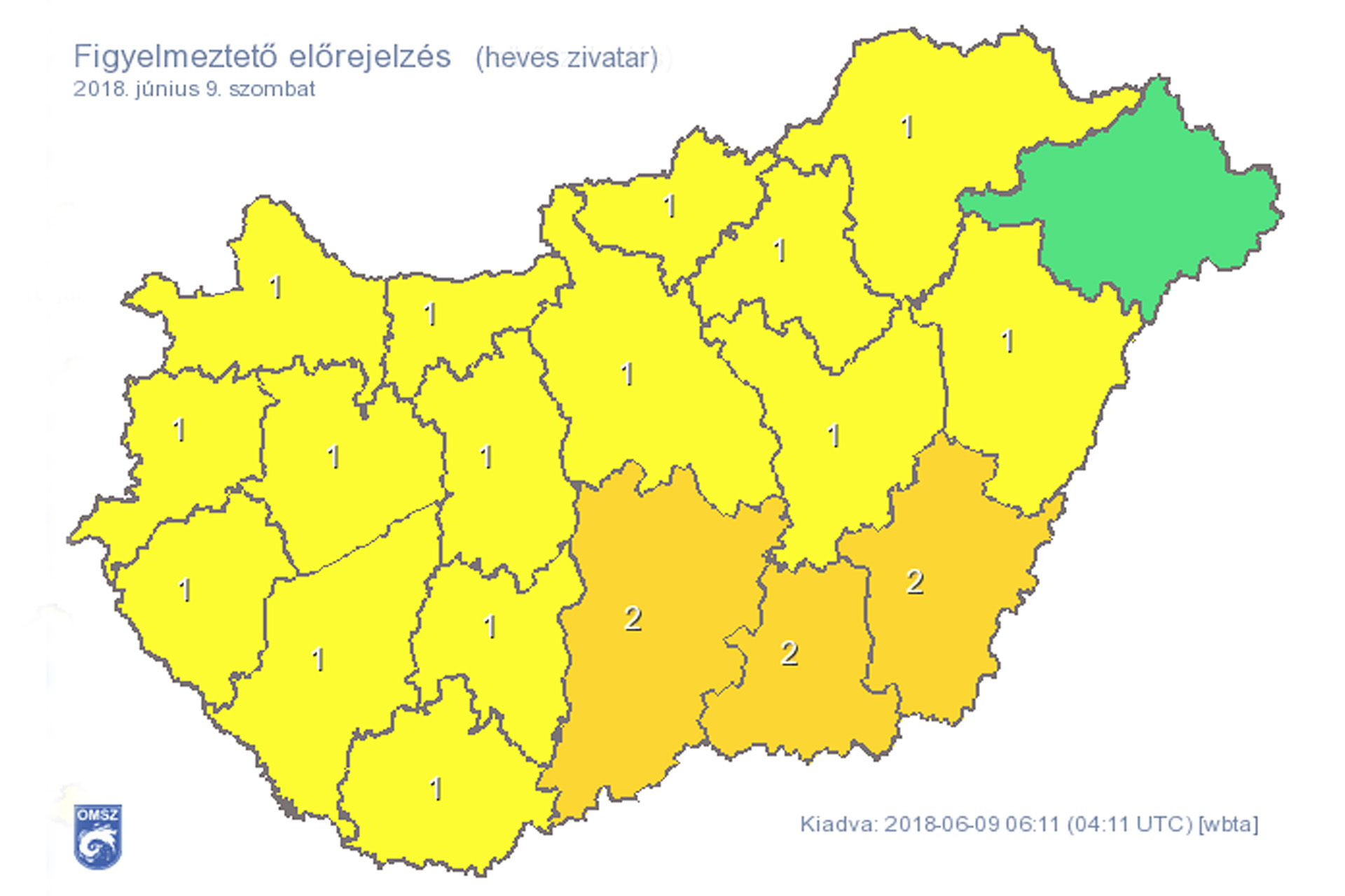 Az Országos Meteorológiai Szolgálat figyelmeztető előrejelzése szerint napközben és este dél, illetve délkelet felől több hullámban várható zivatar.