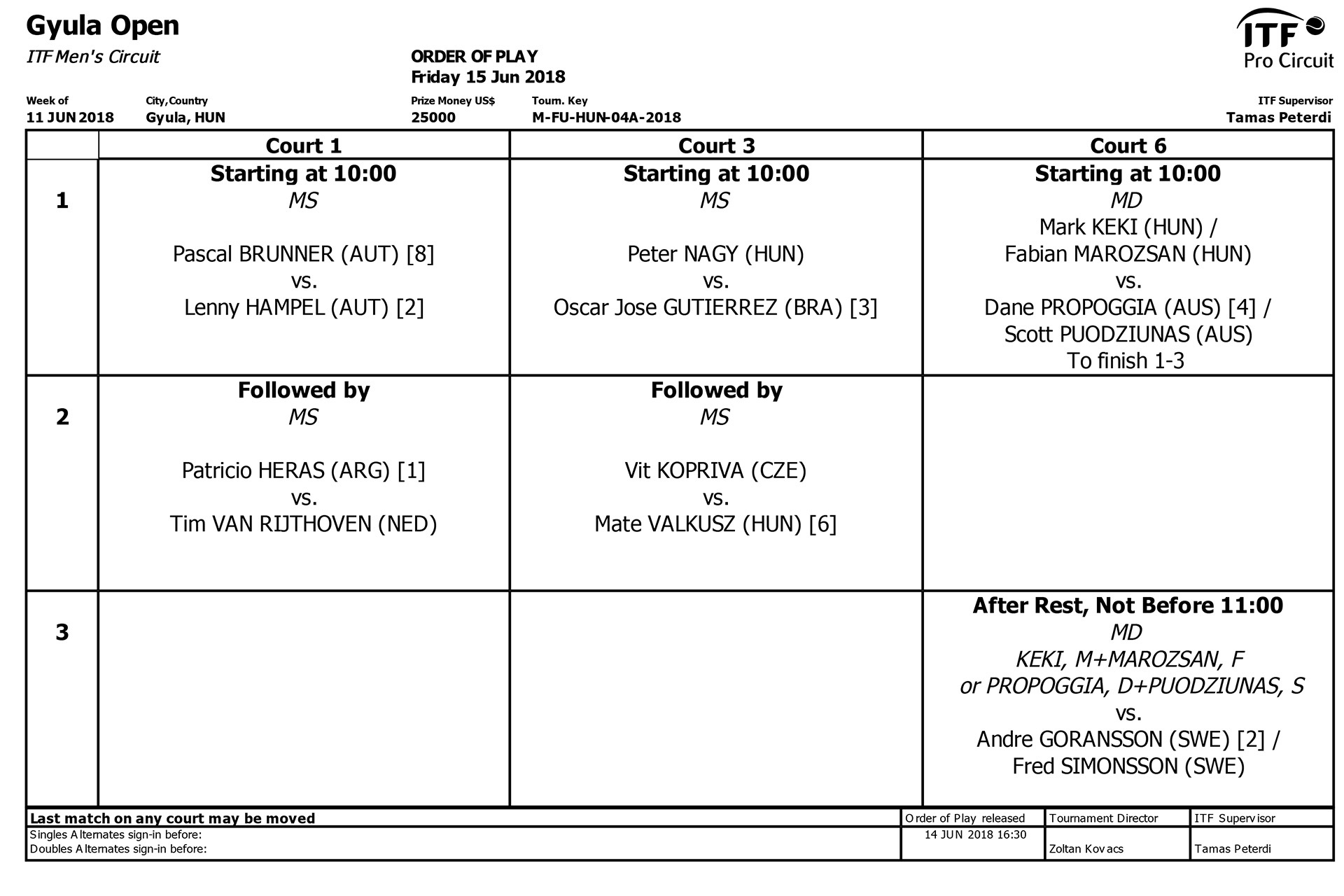 A gyulai Id. Christián László Sporttelep pályáin zajló 25 ezer dolláros profi teniszverseny csütörtöki játéknapján a főtábla küzdelmeit rendezik meg. A Gyula Open párharcaiban továbbra is érdekeltek a hazai versenyzők. Valkusz Máté cseh ellenféllel néz farkasszemet, rajta kívül Nagy Péternek és a Keki–Marizsán-párosnak is szurkolhatnak a látogatók.