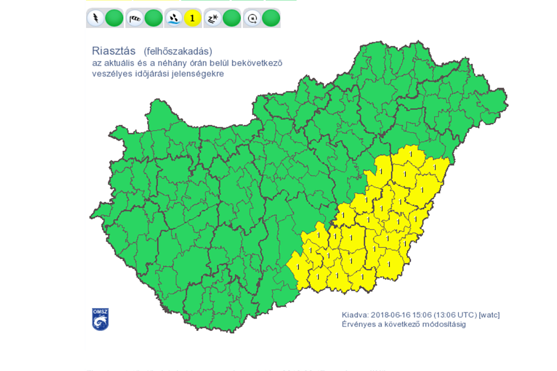 Éjjel csak kis eséllyel elvétve lehet dörgés, villámlás. Vasárnap délután, este elsősorban keleten és délen lehet helyenként zivatar. Zivatarhoz jelentős vagy nagy mennyiségű csapadék (5-20 mm), néhol esetleg felhőszakadás ( >20-30 mm), erős vagy viharos széllökés (45-75, kis eséllyel > 75 km/h) és kisebb méretű jég (többnyire < 1-2 cm-es átmérővel) társulhat – figyelmeztet friss vészjelzésében az Országos Meteorológiai Szolgálat.