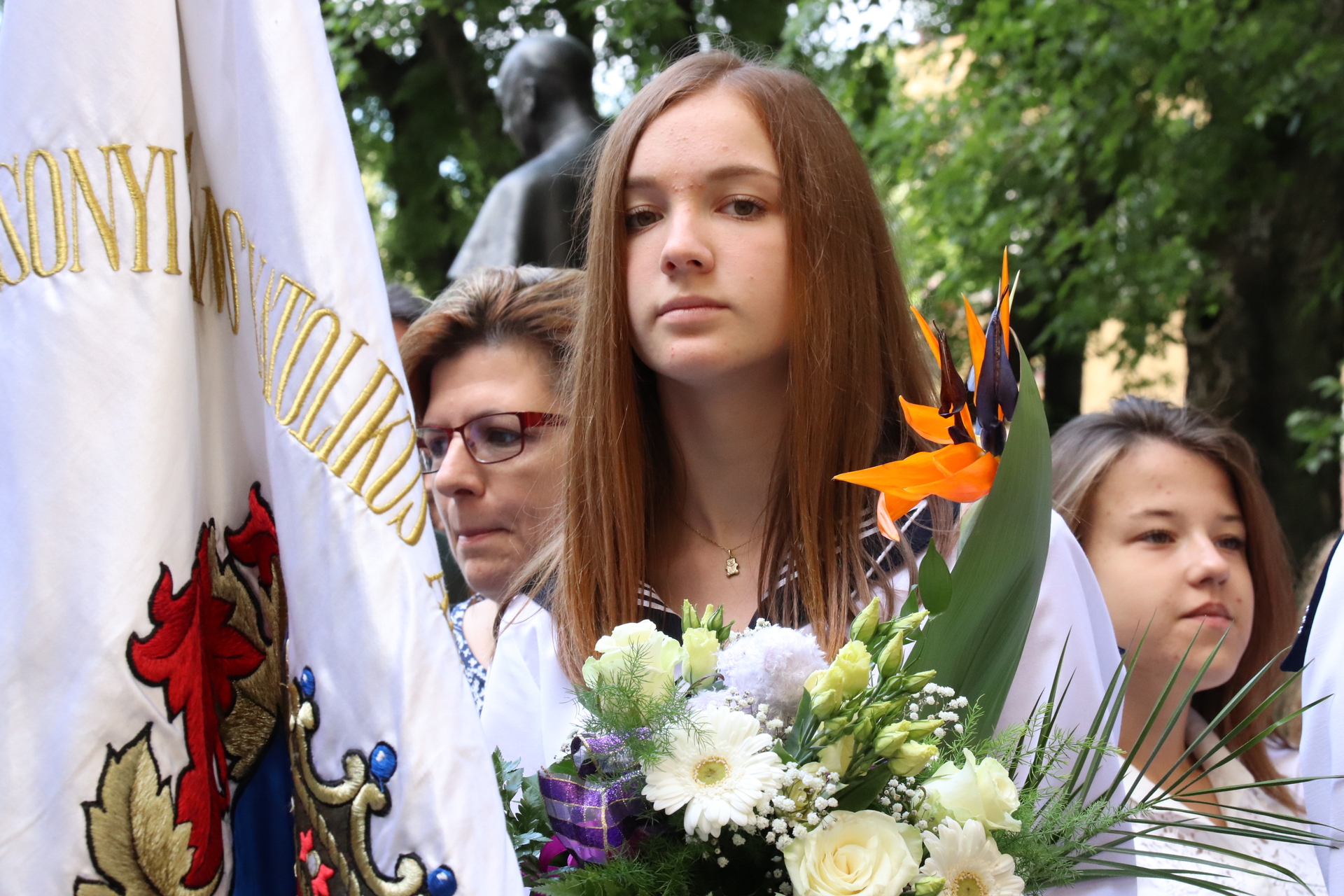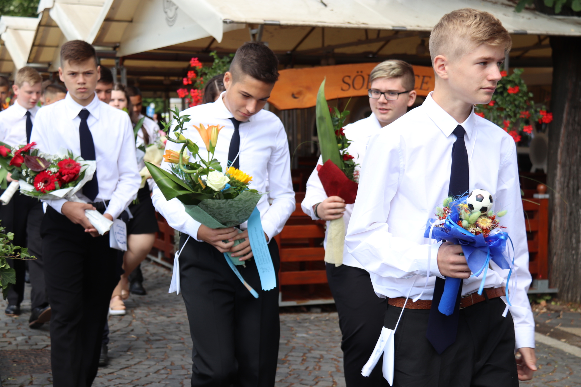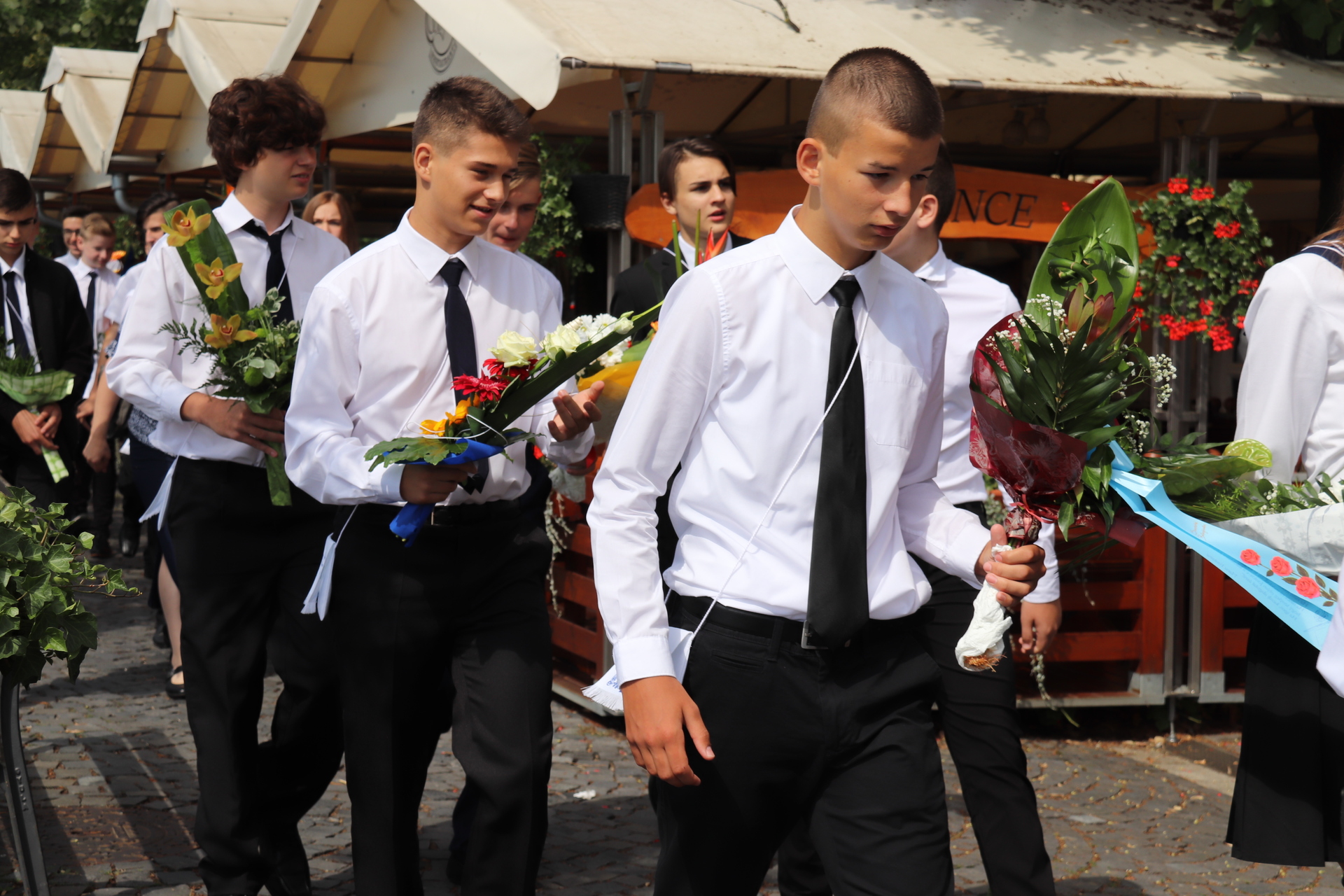 Rendkívüli osztályfőnöki órákkal indult a nyolcadikosok utolsó iskolai napja a Karácsonyi János Katolikus Általános Iskola és Gimnázium belvárosi épületében. A ballagók ezt követően indultak el batyuikkal a Nádi Boldogasszony-kegytemplomba, ahol előbb szentmisén vettek részt, majd meghallgathatták az évértékelőt, és átvették díjaikat.