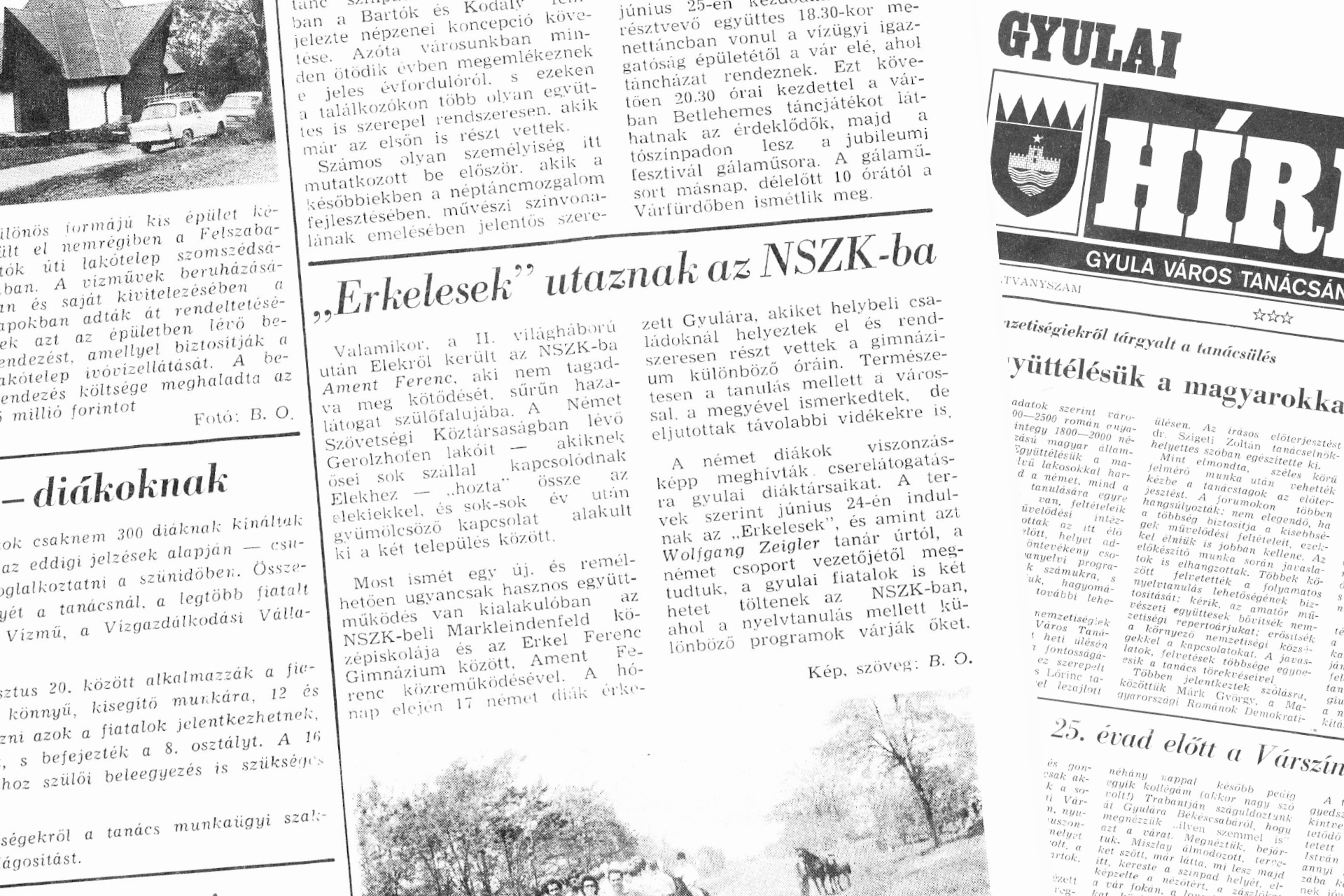 Most ismét egy új, és remélhetően ugyancsak hasznos együttműködés van kialakulóban az NSZK-beli Markleindenfeld középiskolája és az Erkel Ferenc Gimnázium között. Áment Ferenc közreműködésével. A hónap elején 17 nemet diák érkezett Gyulára, akiket helybeli családoknál helyeztek el és rendszeresen részt vettek a gimnázium különböző óráin. Természetesen a tanulás mellett a várossal, a megyével ismerkedtek, de eljutottak távolabbi vidékekre is.
