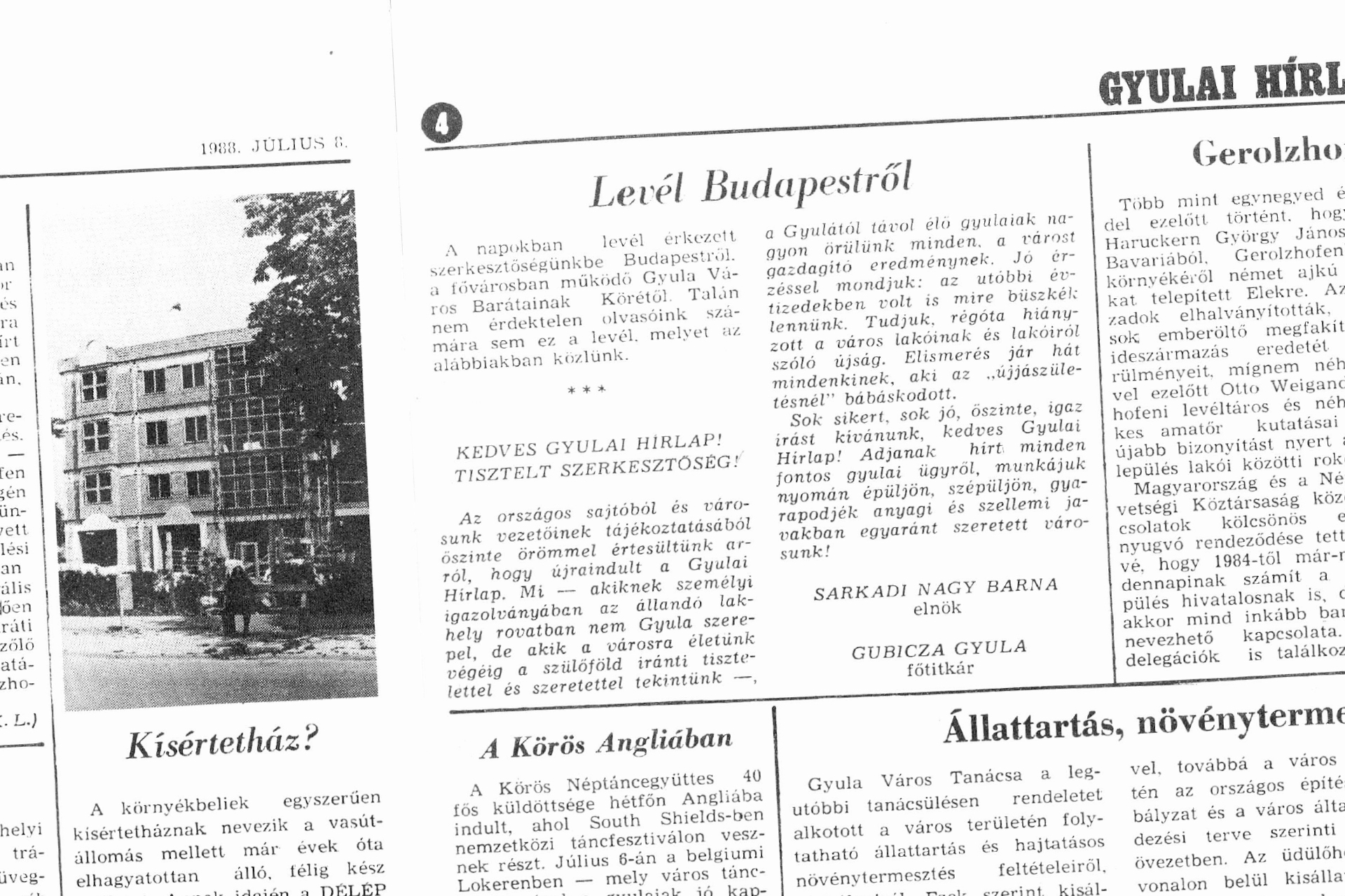 Az országos sajtóból és városunk vezetőinek tájékoztatásából őszinte örömmel értesültünk arról, hogy újraindult a Gyulai Hírlap. Mi – akiknek személyi igazolványában az állandó lakhely rovatban nem Gyula szerepel, de akik a városra életünk végéig a szülőföld iránti tisztelettel és szeretettel tekintünk –, a Gyulától távol élő gyulaiak nagyon örülünk minden, a várost gazdagító eredménynek. Jó érzéssel mondjuk: az utóbbi évtizedekben volt is mire büszkék lennünk. Tudjuk, régóta hiányzott a város lakóinak és lakóiról szóló újság. Elismerés jár hát mindenkinek, aki az „újjászületésnél” bábáskodott. Sok sikert, sok jó, őszinte, igaz írást kívánunk, kedves Gyulai Hírlap! Adjanak hírt minden fontos gyulai ügyről, munkájuk nyomán épüljön, szépüljön, gyarapodjék anyagi és szellemi javakban egyaránt szeretett városunk!