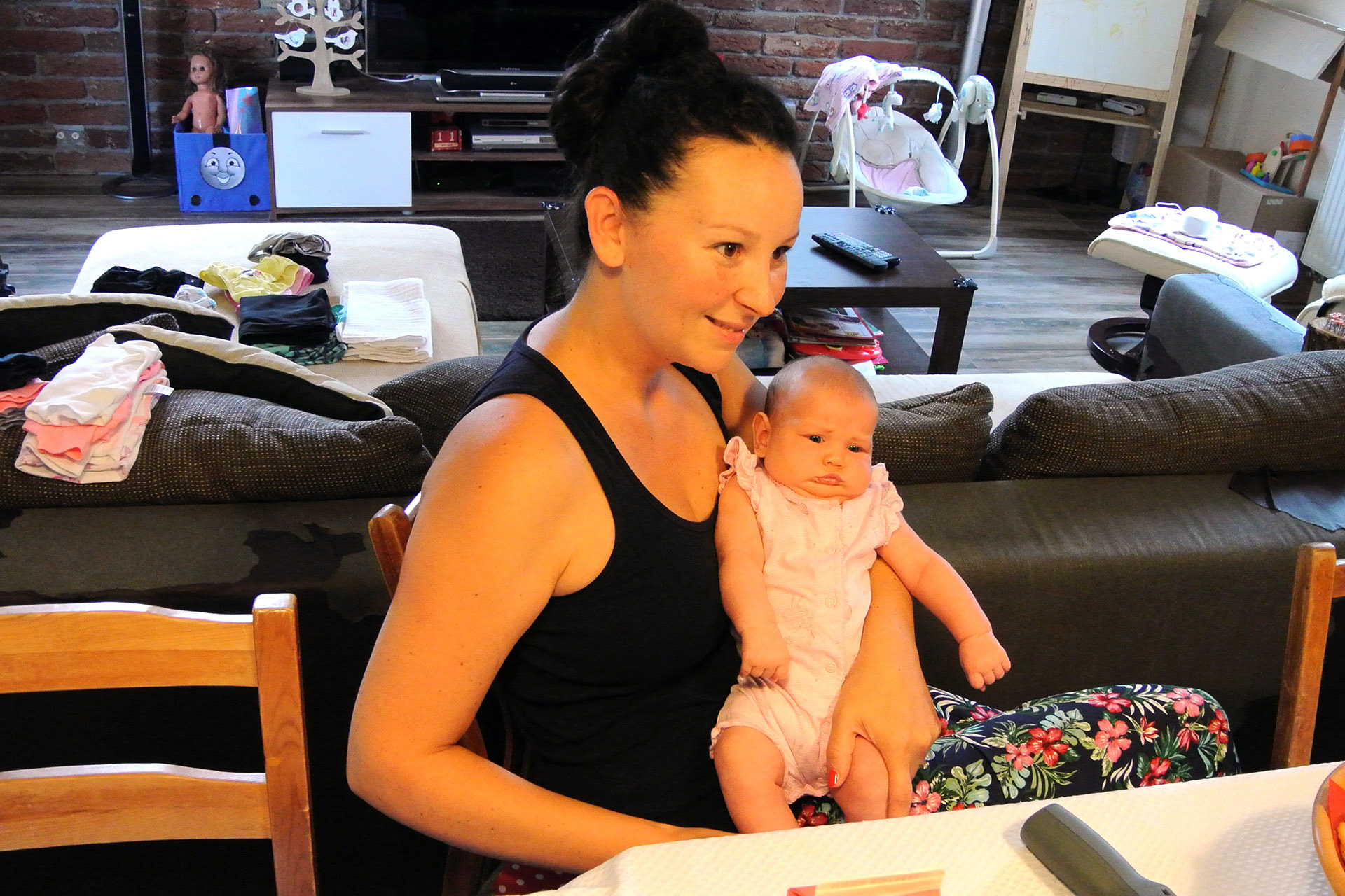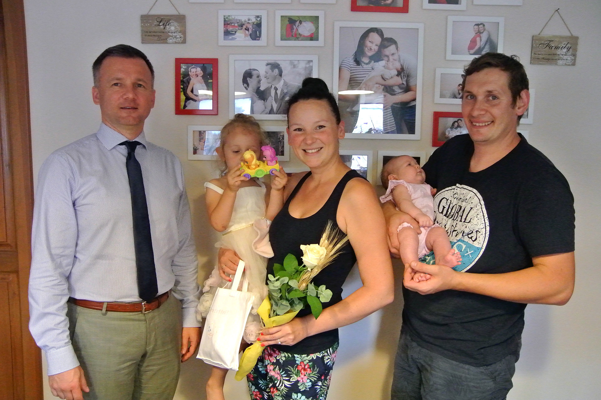 A kislány barátságos mosollyal fogadta látogatóit. A köszöntés végén az anyuka élő bejelentkezésben köszönte meg a város ajándékát.