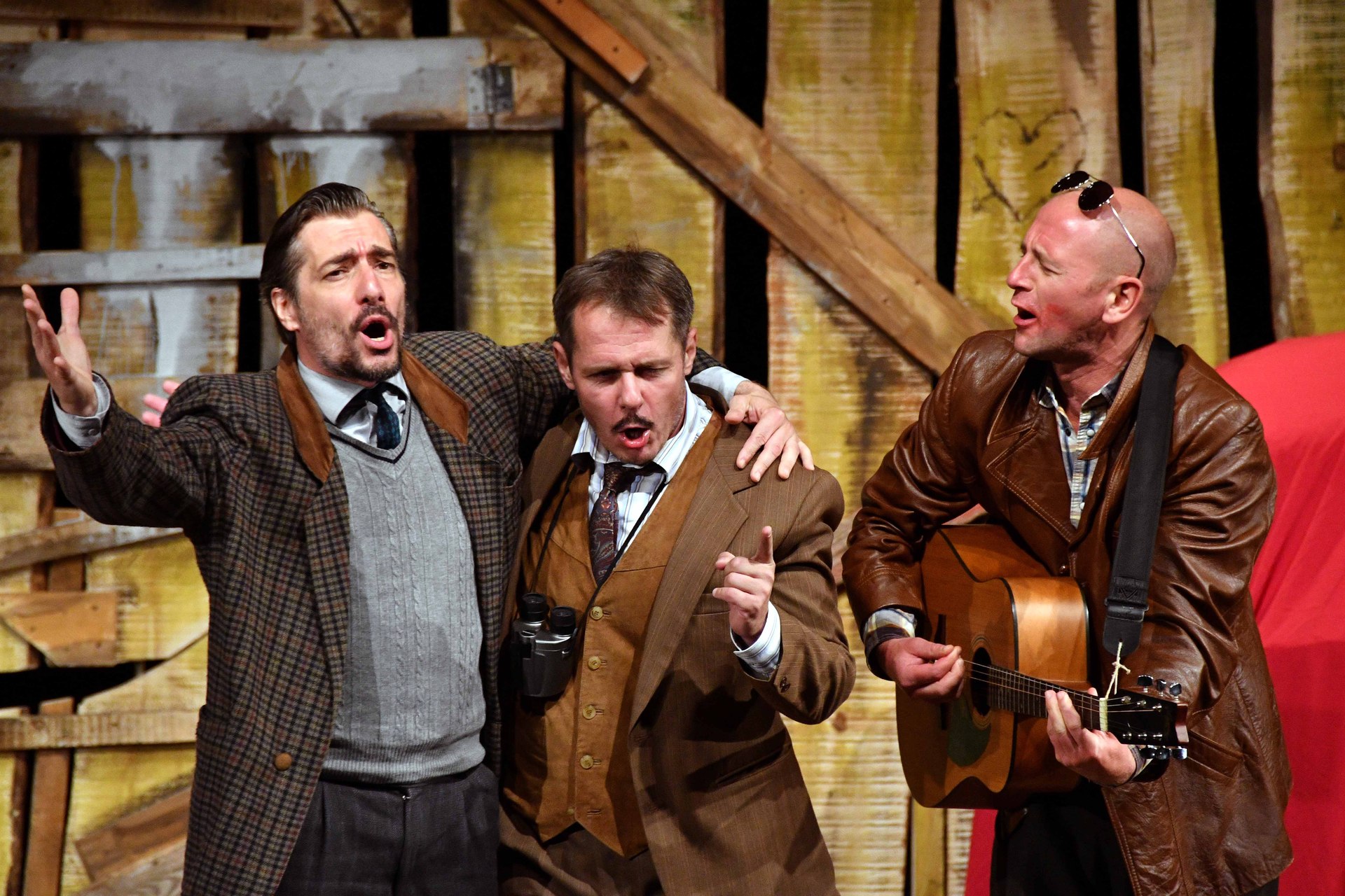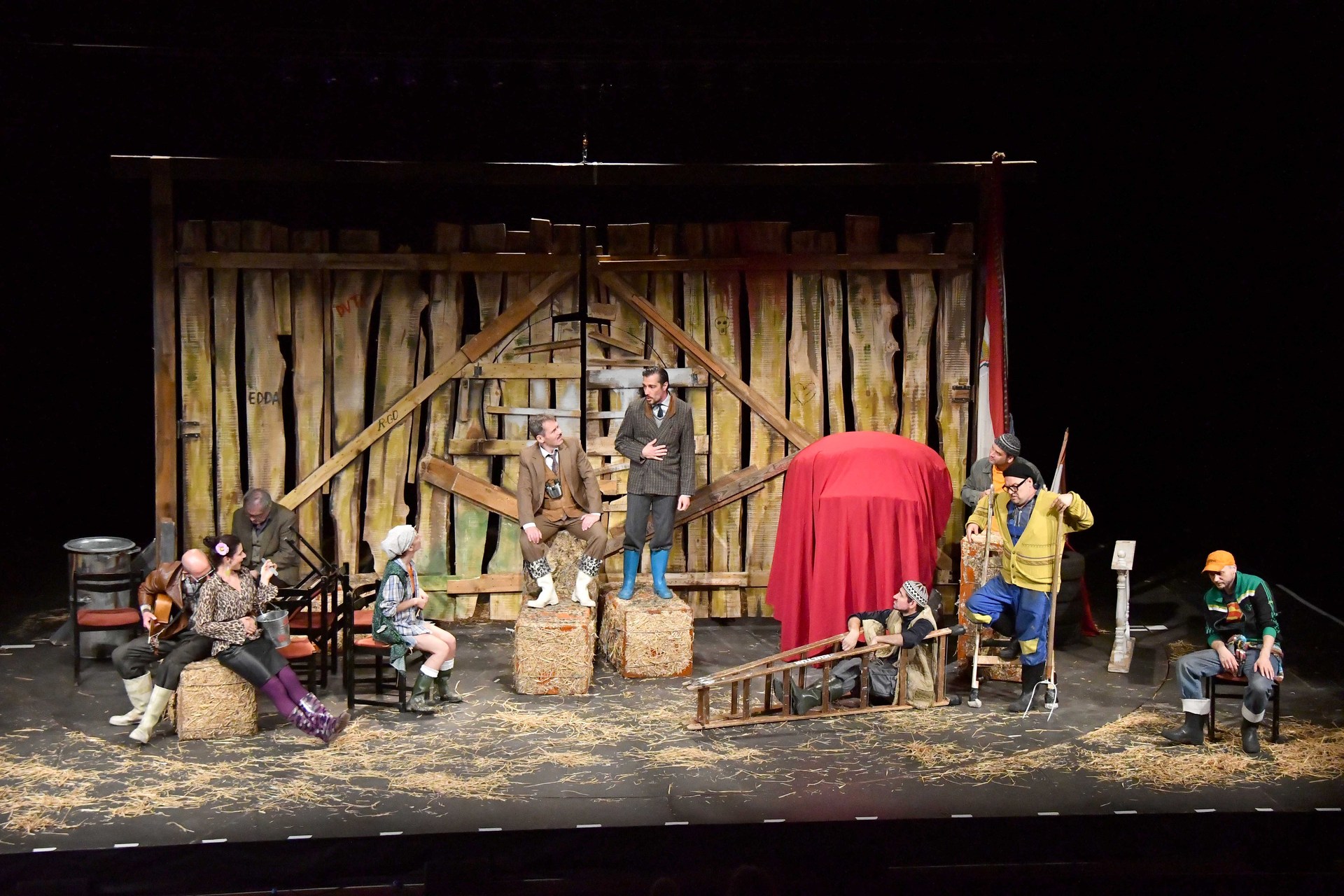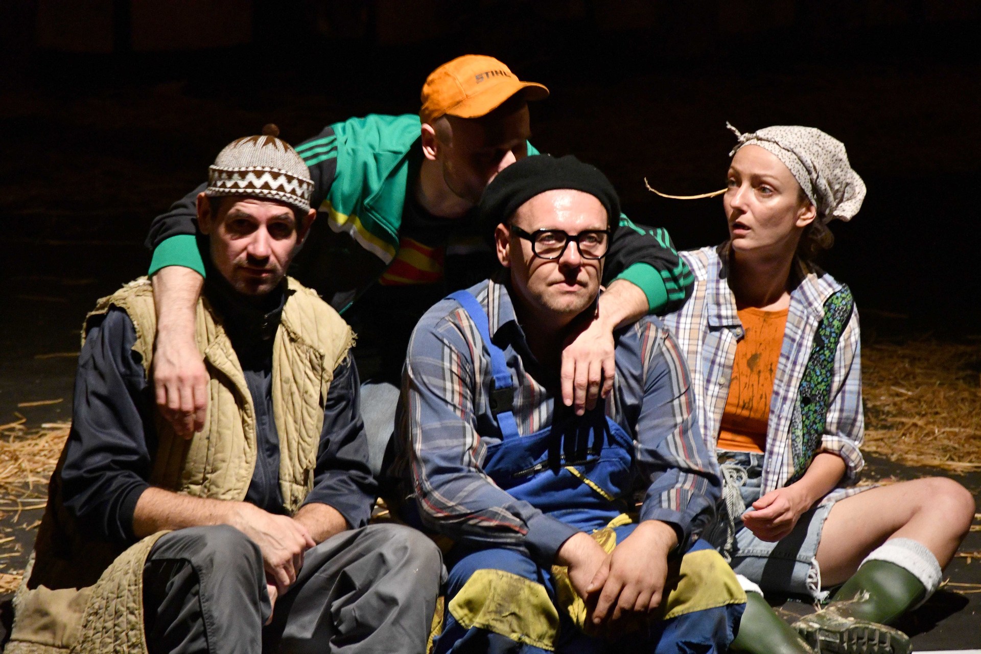 A hithű kommunistából nemzetivé átvedlett, megtért Büki Lajos (volt tsz-elnök, jelenleg földbirtokos; Claudius király: Őze Áron) anyagilag és erkölcsileg gyanúsan jól jött ki a rendszerváltás okozta kavarodásból. Kegyeltje Pálos Pityu (volt tanácselnök, jelenleg polgármester és vállalkozó: Polonius: Pataki Ferenc), a pályázatlehívó, „szabadon” megválasztott polgármester, aki a számlázási csalásokban aktív közreműködő. Rajtuk kapaszkodik fel az ügyeskedő könyvelő, Macska Jancsi (volt tsz-elnökhelyettes, jelenleg vállalkozó: Laertes: Jegercsik Csaba). Függő viszonyban van Bükitől Mariska, a kocsmárosnő is (Gertrúd: Kovács Vanda – szeretett gyulai származású színésznőnk), noha már nem kell pénzért bárkinek kínálnia bájait – álszabadság egy álországban. Pont annak vagyunk tanúi, hogy vált minden a szabadversenyes kapitalizmus portékájává az elmúlt negyed században. Az egykori tsz népe (Tomi, helyi paraszt: Kiss Attila; Laci, helyi paraszt: Gulyás Hermann Sándor; Jani, helyi paraszt: Csadi Zoltán; Gabika, helyi paraszt: Tőkés Nikoletta) egyre inkább kívülről figyelik az eseményeket, akár a két öreg a Muppet Showban – ezért ténylegesen a páholyba is másznak.