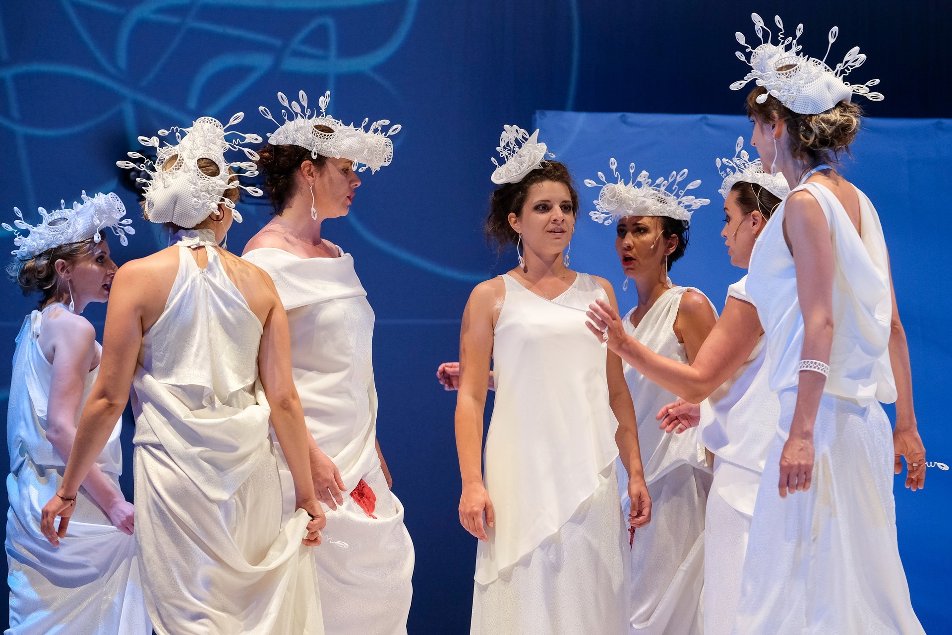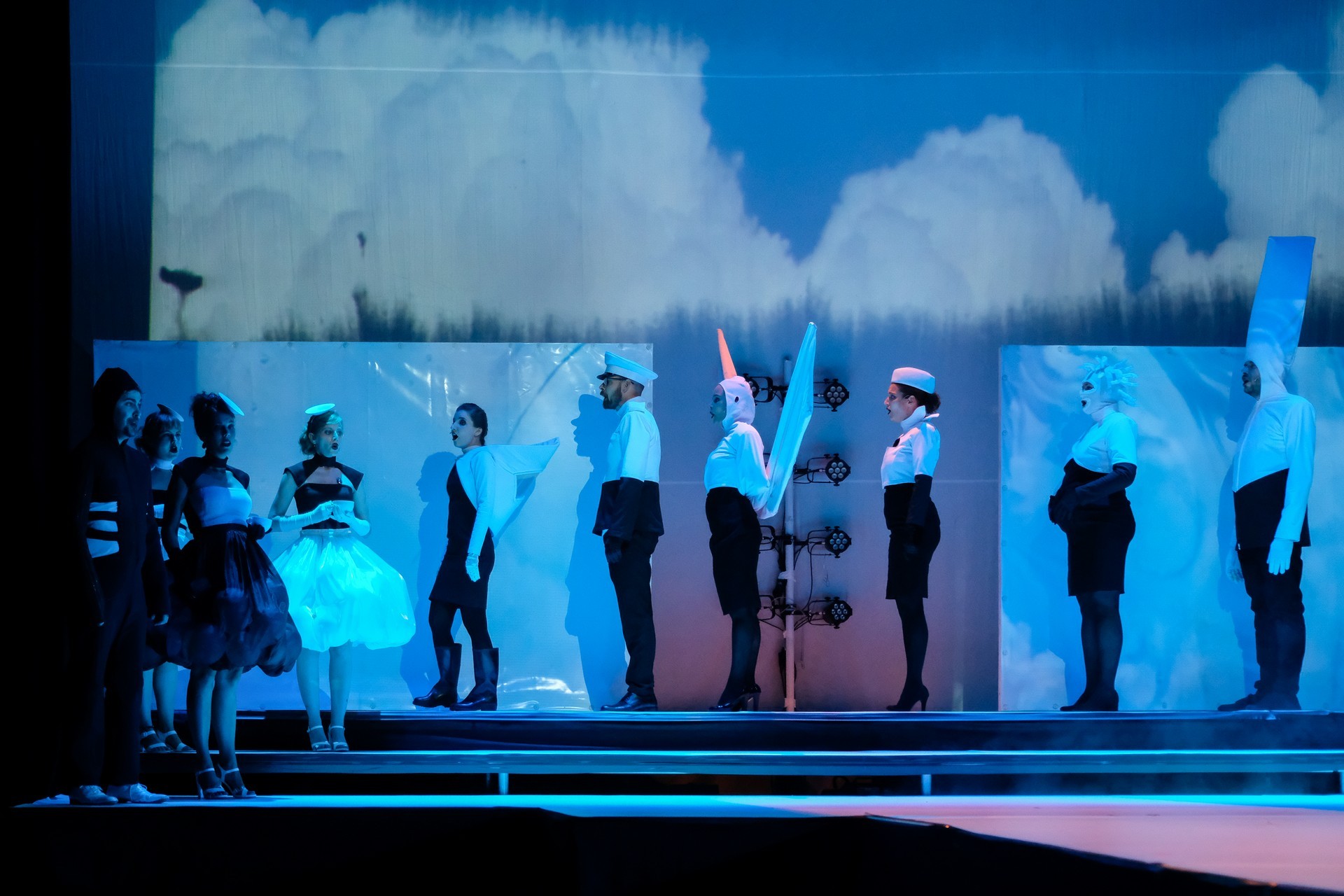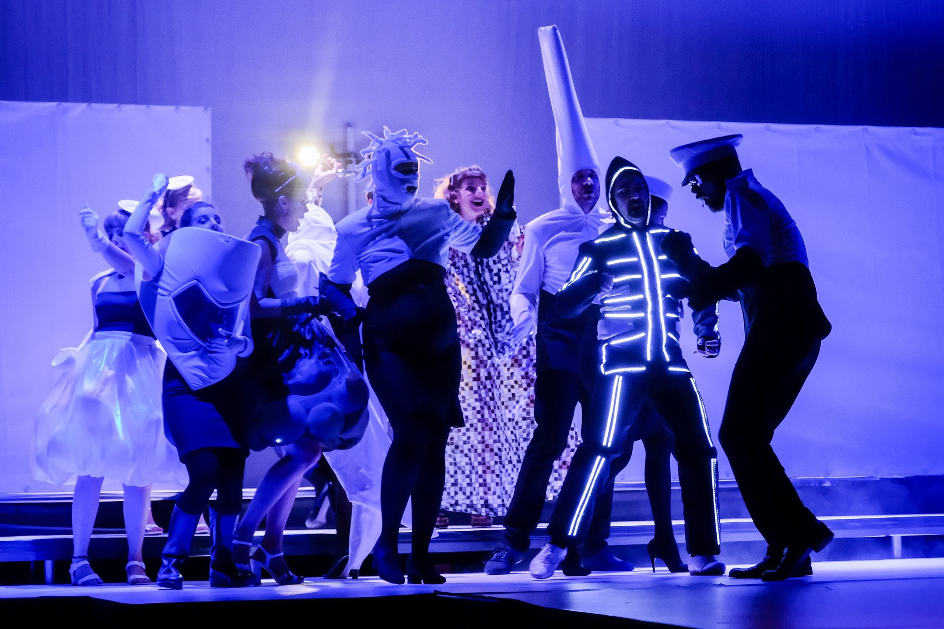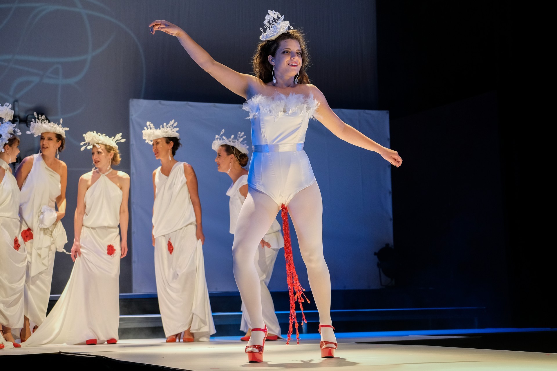 A csapatnak állítólag ez az első olyan előadása, amelyben elektronikus alapra dolgoztak rá más zenei műfajokat. És bár az ötlet hangzatos és élvezetes, picikét elvett a hatásfokából, hogy a mikroportokkal közvetített énekhangot elnyomta a gépmuzsika. Ám ennek ellenére is nyugtázható: a Lantos Rezső-díjas karnagy, Halas Dóra által irányított civilkórus hatalmasat alkotott és teljesített. Az énekesek Duda Éva koreográfiájára, alakzatból alakzatba szerveződve, jelzésszerű karaktermozgásokat végezve játszották el rendkívül hitelesen szerepeiket. Revüjükhöz Kiss Ákos médiaművész és Bartha Márk sound designer vizuális effektjeinek, az emberi testekre és a háttéroltárra vetített képeinek, valamint hanghatásainak együttes kompozíciója biztosított extravagáns atmoszférát.