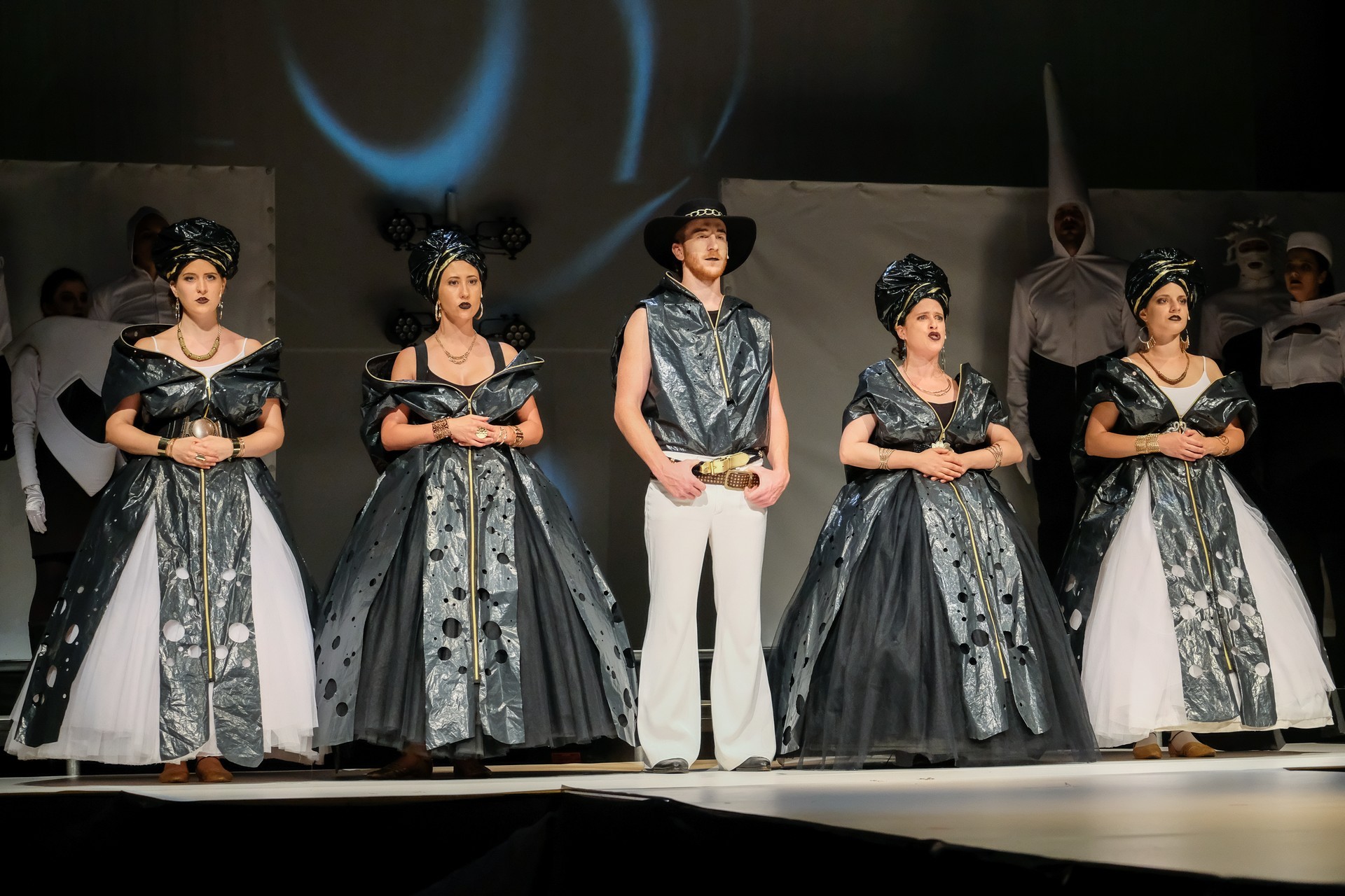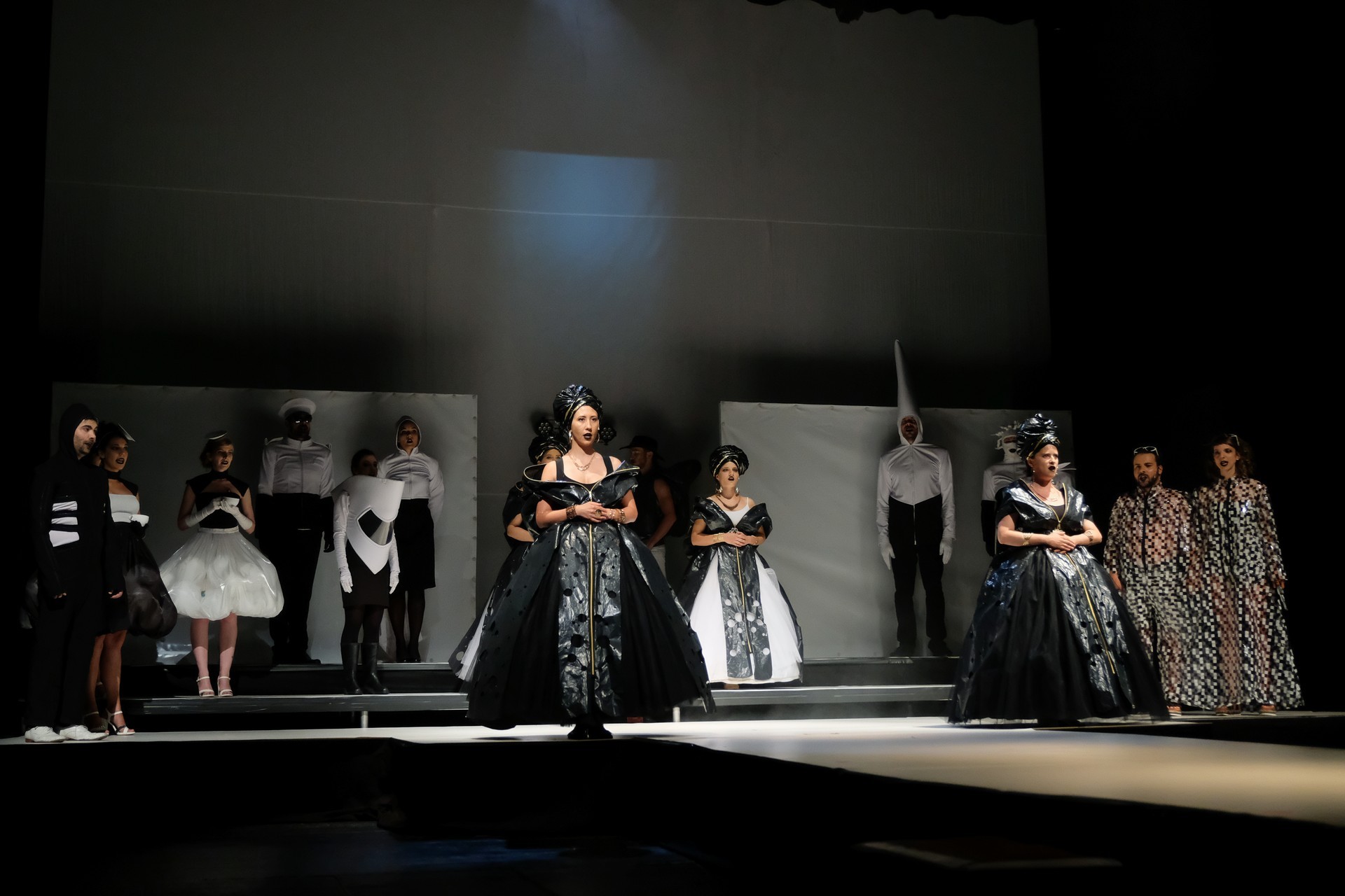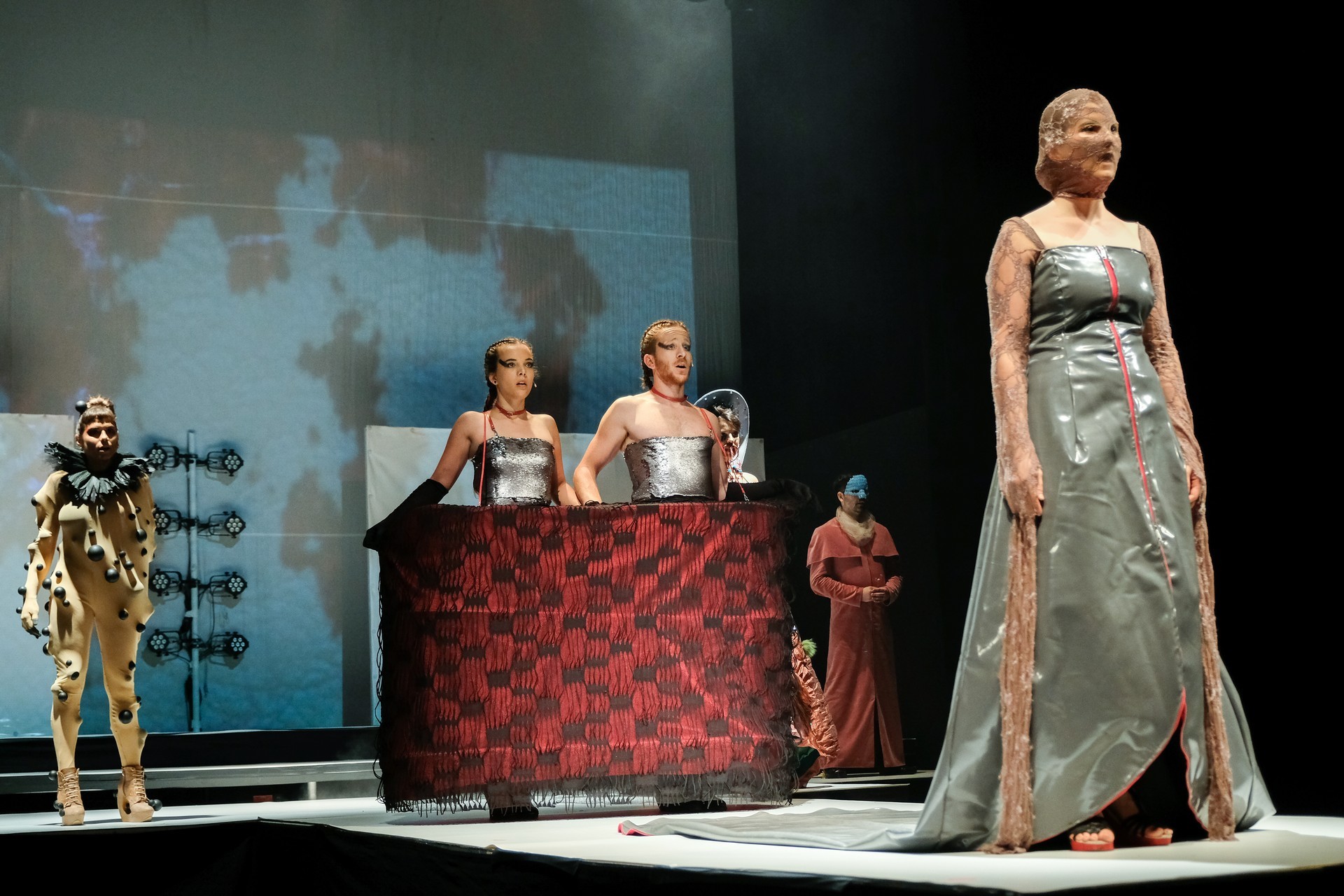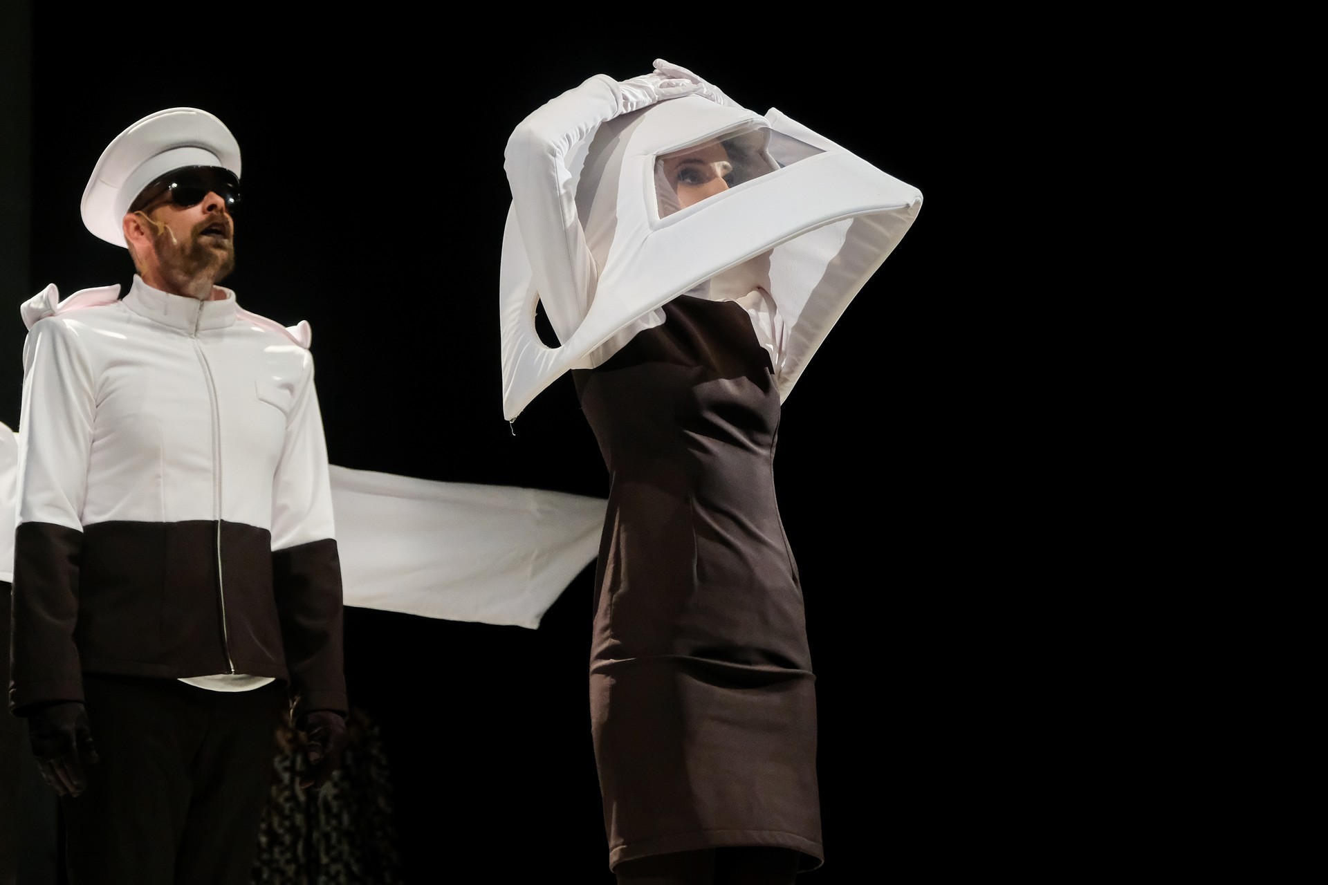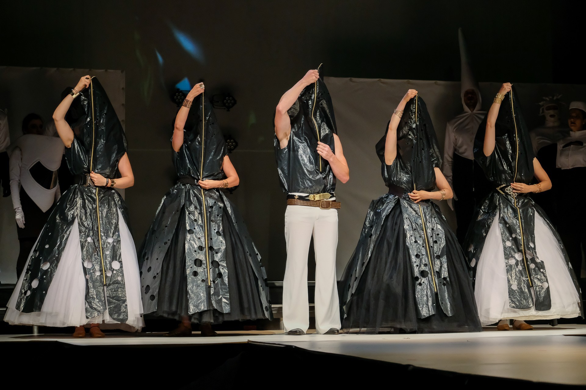 A ledvilágításos és a 3D-technikával nyomtatott kosztümök, a hullazsák- és apácamaszkok a produkció végére nagyon is jelképesen kerülnek le az előadókról, akik ezt követően hozzánk hasonlóan, hétköznapi viseletükben, hétköznapi arcukkal, sokszínűen cáfolják meg a fekete-fehér ellenpólus elvét.