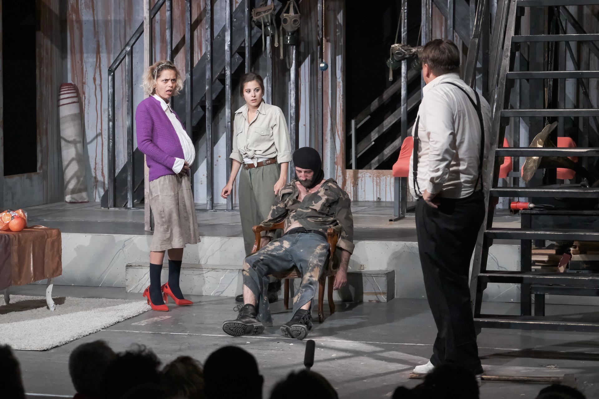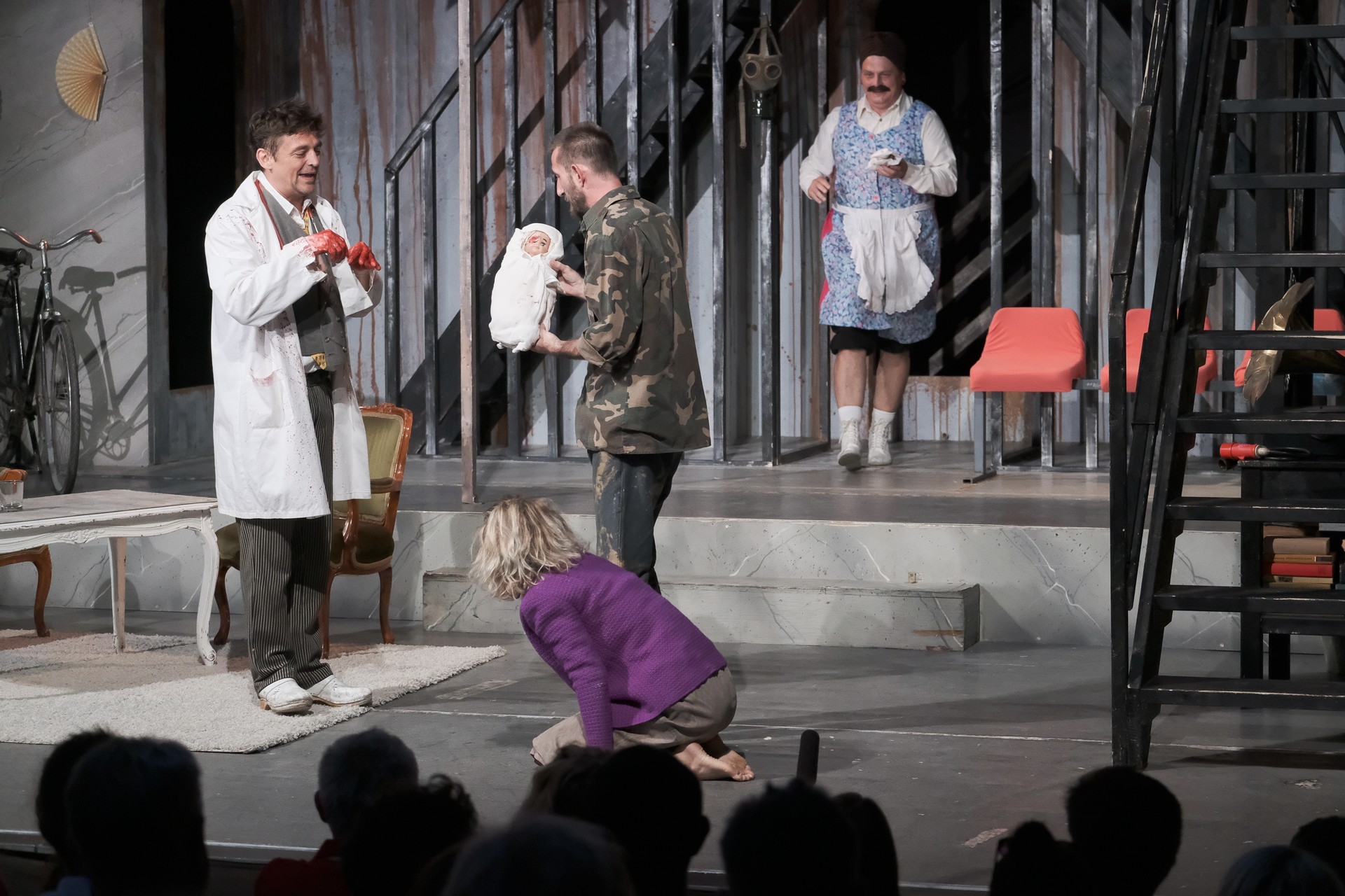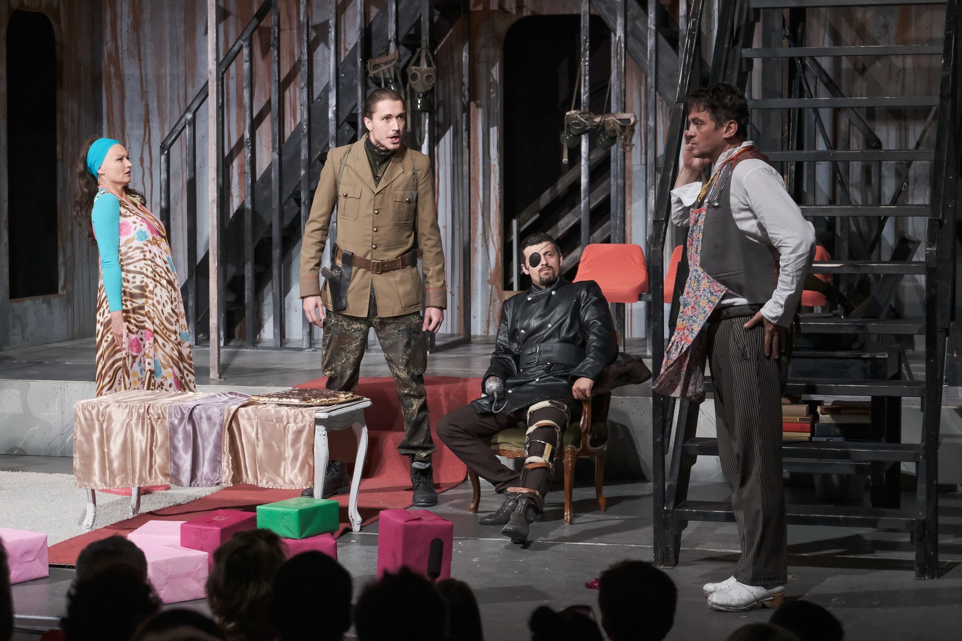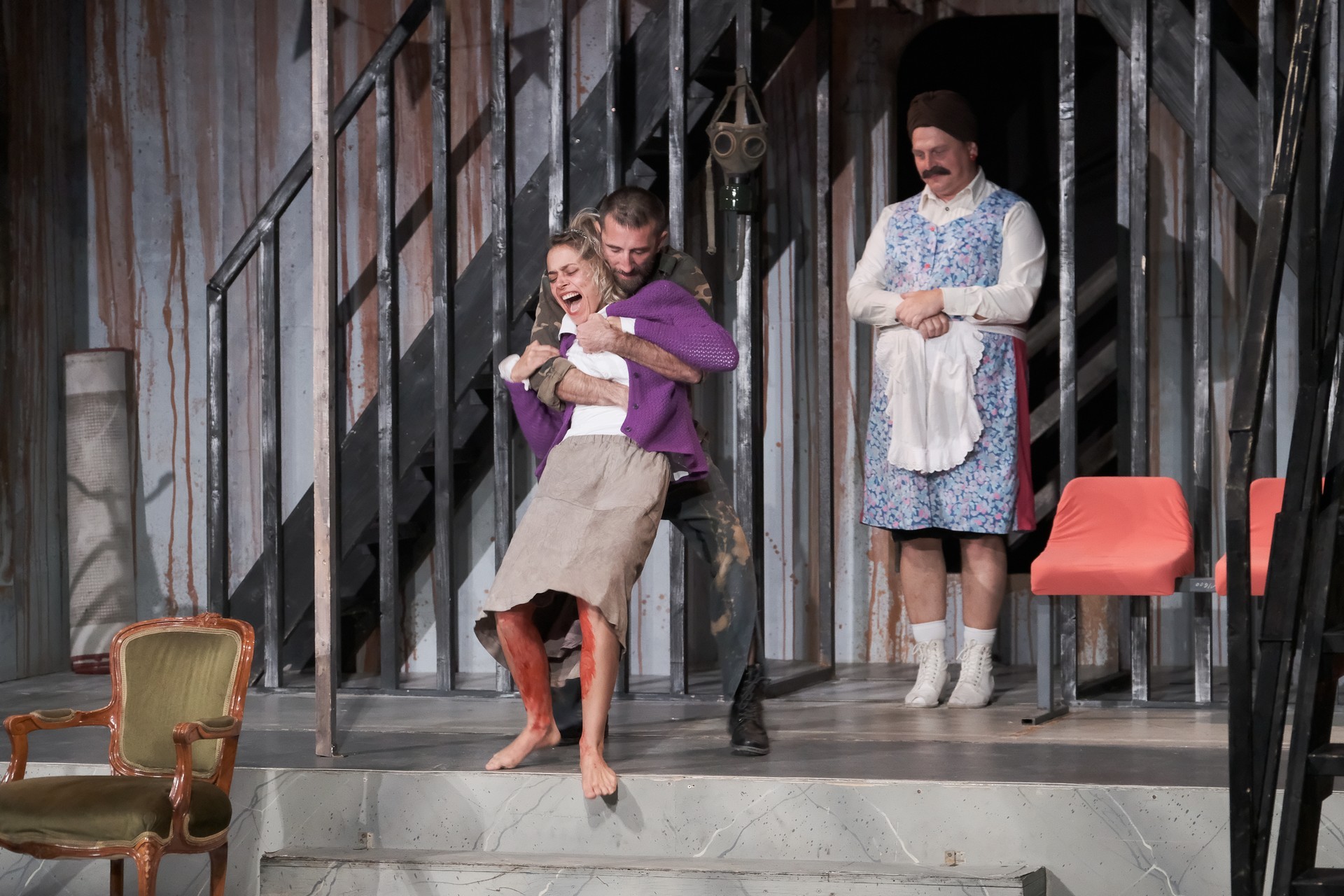 A családtagok egymást terrorizálják, az apa, Miskolczi Mózes (Harsányi Attila) véres kezű szülészorvos, aki legfőként csecsemők csonkolásából jut busás jövedelemhez – nem szereti csinálni, de belátja, így legalább a gyermekek nem lesznek katonák. Mária, a felesége (Szirbik Bernadett) másra sem vágyik, csak hogy lecsillapítsa a kedélyeket, de ő ugyanúgy a rendszer kiszolgáltatott figurája, aki soha nem tehette, amit akart. A vaslépcsőkkel, traverzekkel kibélelt kietlen odú falai vészjóslóan szűkülnek. A frontról hazalátogat egy-egy testvér (Farkas Sándor). Apostoli nevekkel ellátott ikerfigurák, akik mind másképpen jelenítik meg a háborúban sérült elme viszontagságait – itt egyértelműen eszembe jut Móricz, de főképp Örkény Tótékja. Hol Máténak, hol Lukácsnak, hol Menyhértnek vagy Boldizsárnak nevezik őket. Amikor parancsnokként lép színre, azonmód bevezeti a diktatúrát, a háborús terrort, és kivégzi a nagymamát (Molnár Anna), aki előtte örökíti a Föld sorsát Elzára. A Parancsnok a végén önmaga halott voltára döbben, és teljes a káosz, senki sem élheti túl ezt az embertelen világot, legfőképpen az ember nem.