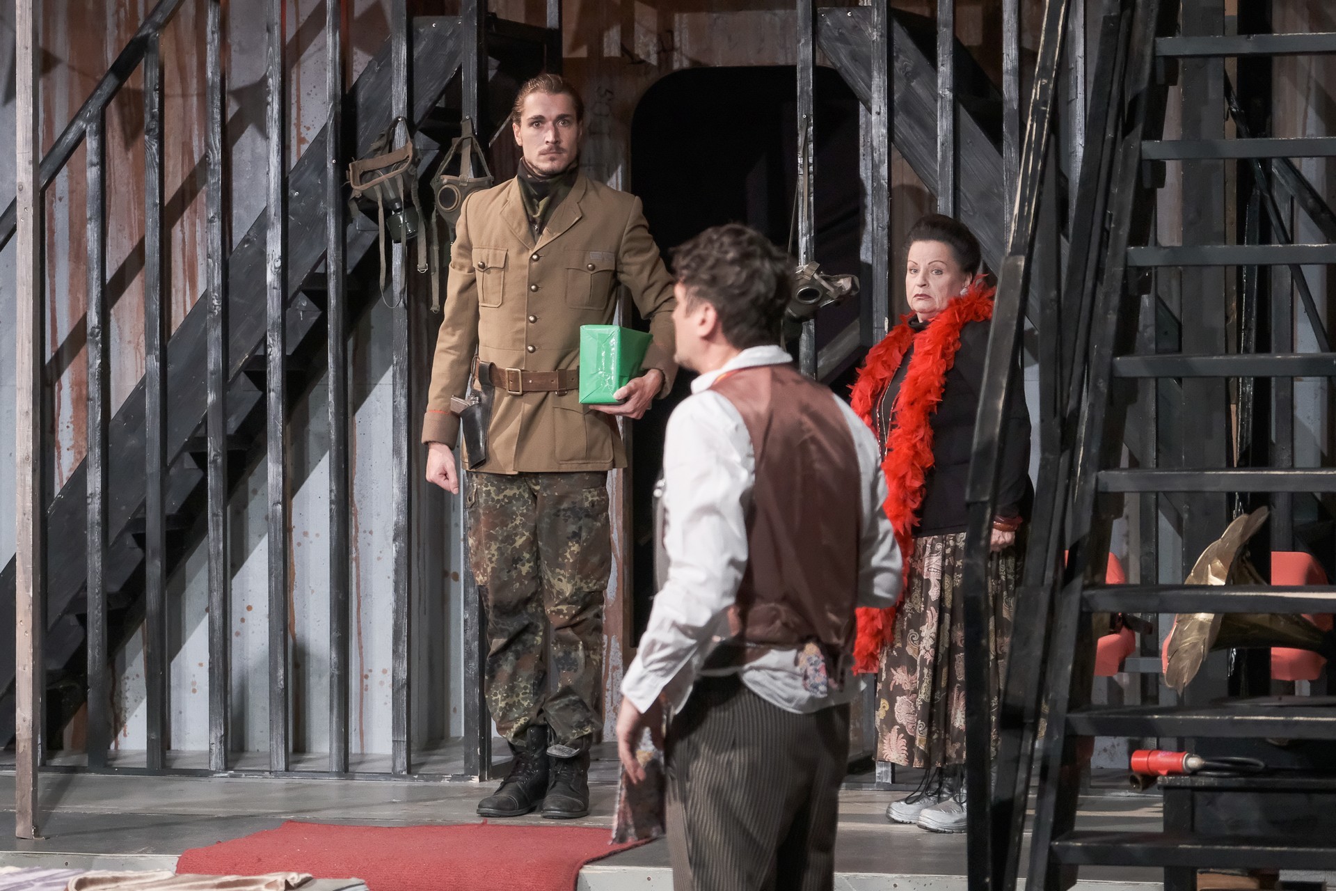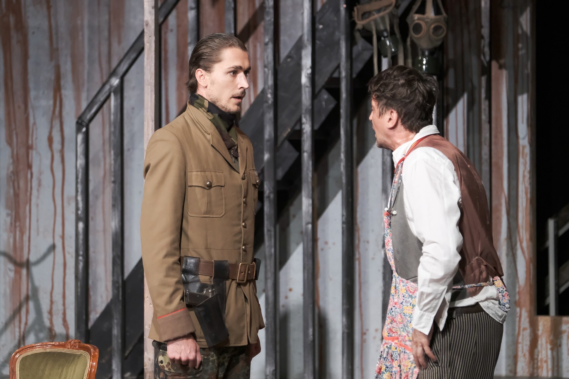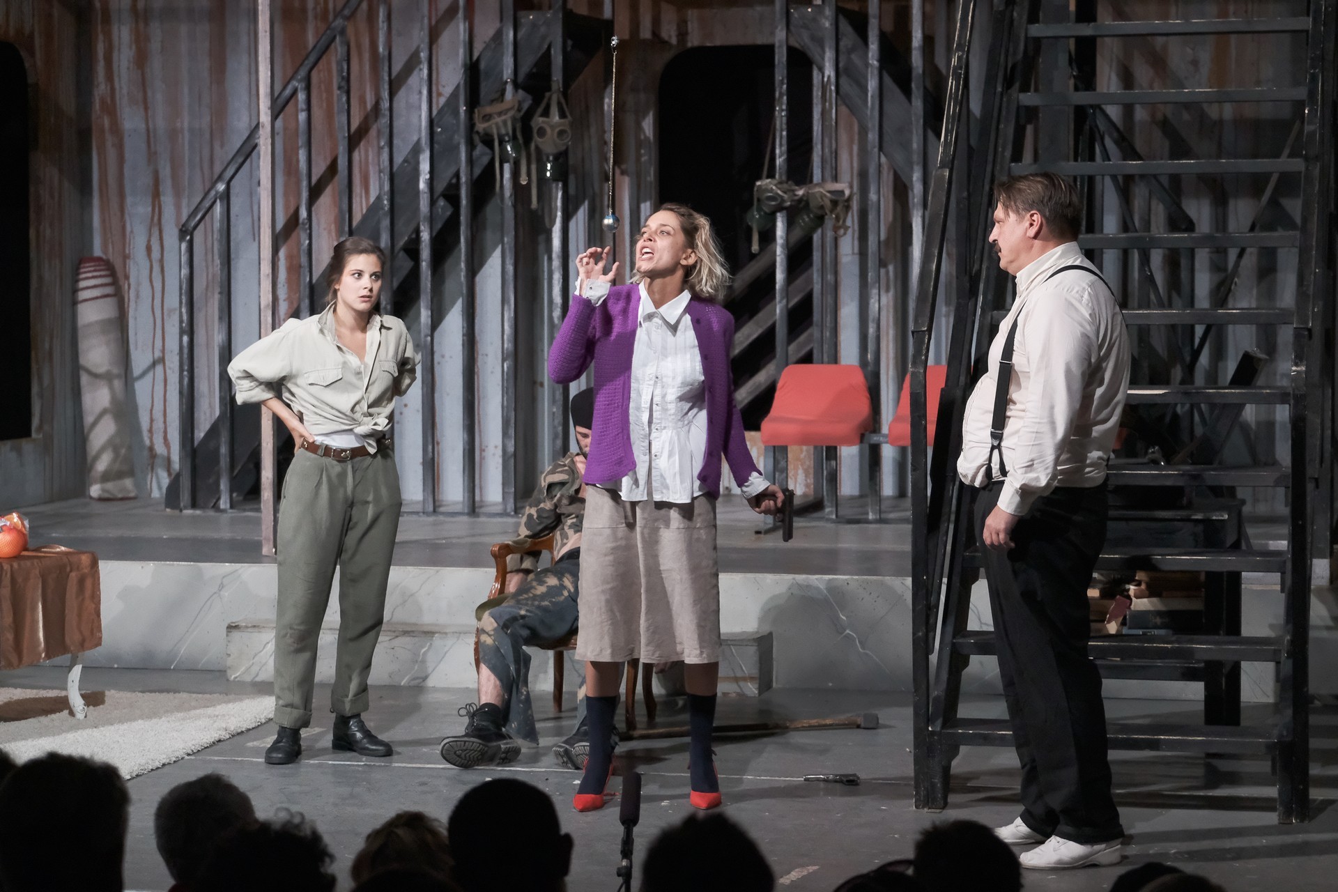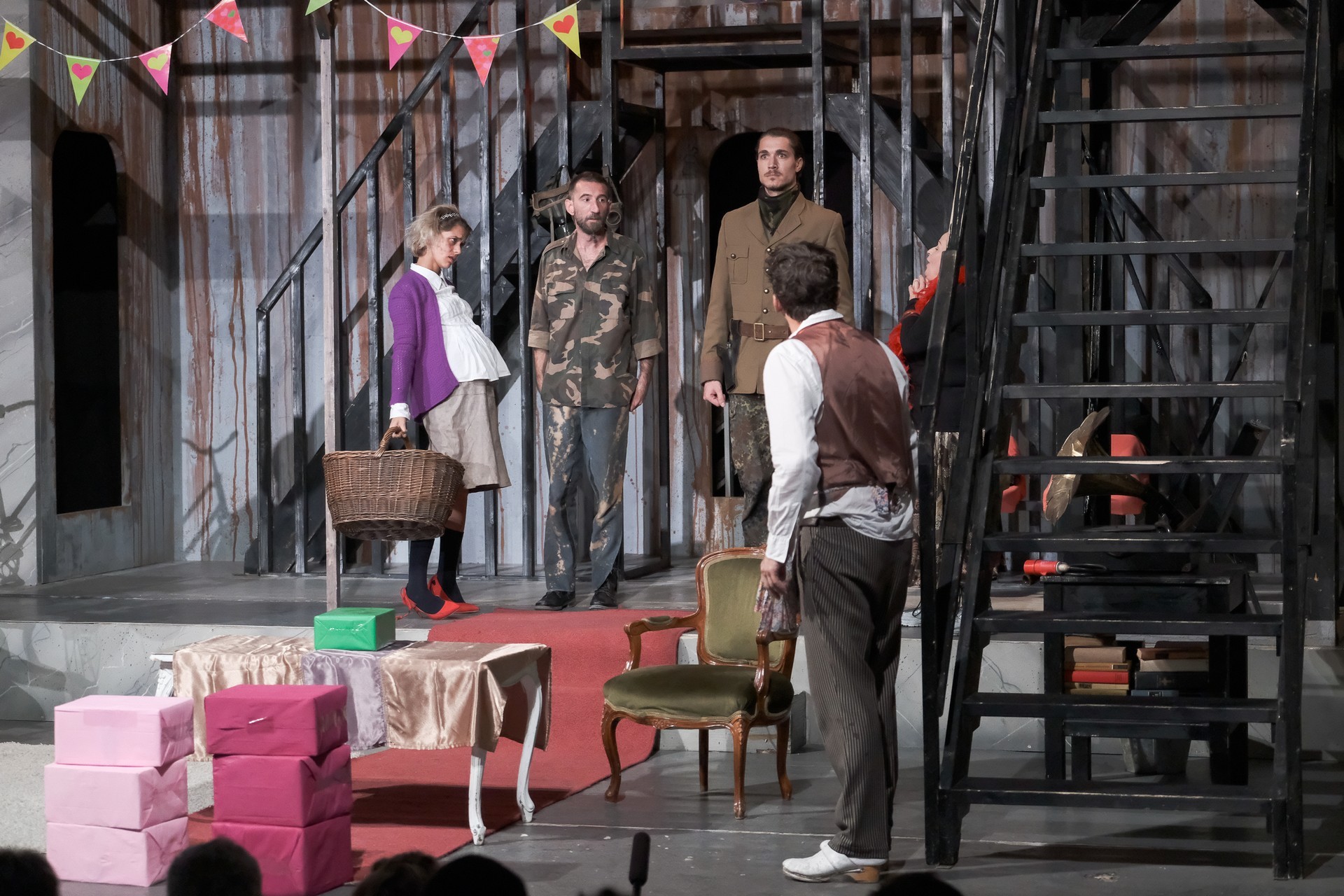 A családtagok egymást terrorizálják, az apa, Miskolczi Mózes (Harsányi Attila) véres kezű szülészorvos, aki legfőként csecsemők csonkolásából jut busás jövedelemhez – nem szereti csinálni, de belátja, így legalább a gyermekek nem lesznek katonák. Mária, a felesége (Szirbik Bernadett) másra sem vágyik, csak hogy lecsillapítsa a kedélyeket, de ő ugyanúgy a rendszer kiszolgáltatott figurája, aki soha nem tehette, amit akart. A vaslépcsőkkel, traverzekkel kibélelt kietlen odú falai vészjóslóan szűkülnek. A frontról hazalátogat egy-egy testvér (Farkas Sándor). Apostoli nevekkel ellátott ikerfigurák, akik mind másképpen jelenítik meg a háborúban sérült elme viszontagságait – itt egyértelműen eszembe jut Móricz, de főképp Örkény Tótékja. Hol Máténak, hol Lukácsnak, hol Menyhértnek vagy Boldizsárnak nevezik őket. Amikor parancsnokként lép színre, azonmód bevezeti a diktatúrát, a háborús terrort, és kivégzi a nagymamát (Molnár Anna), aki előtte örökíti a Föld sorsát Elzára. A Parancsnok a végén önmaga halott voltára döbben, és teljes a káosz, senki sem élheti túl ezt az embertelen világot, legfőképpen az ember nem.