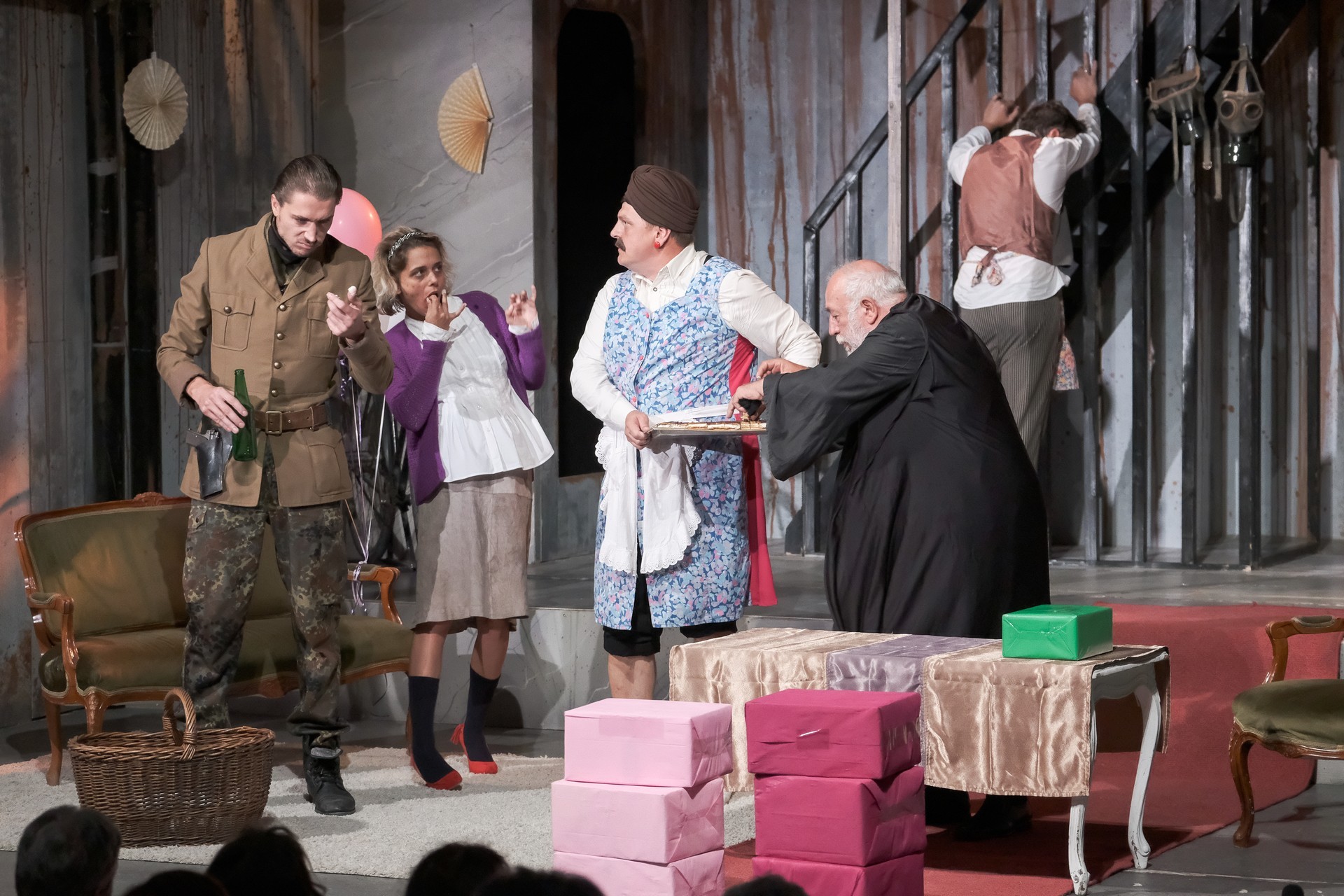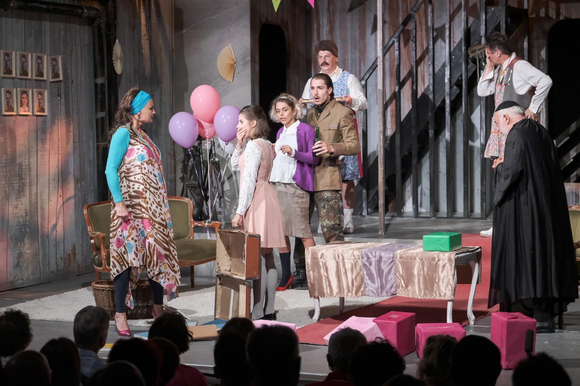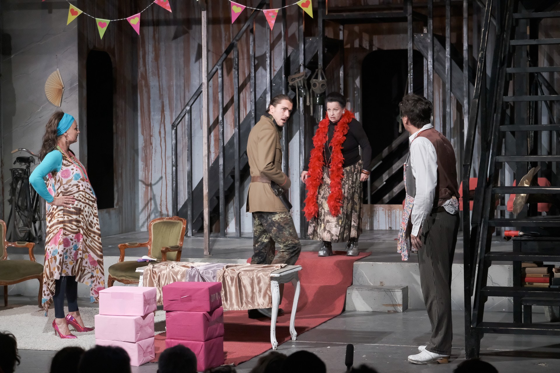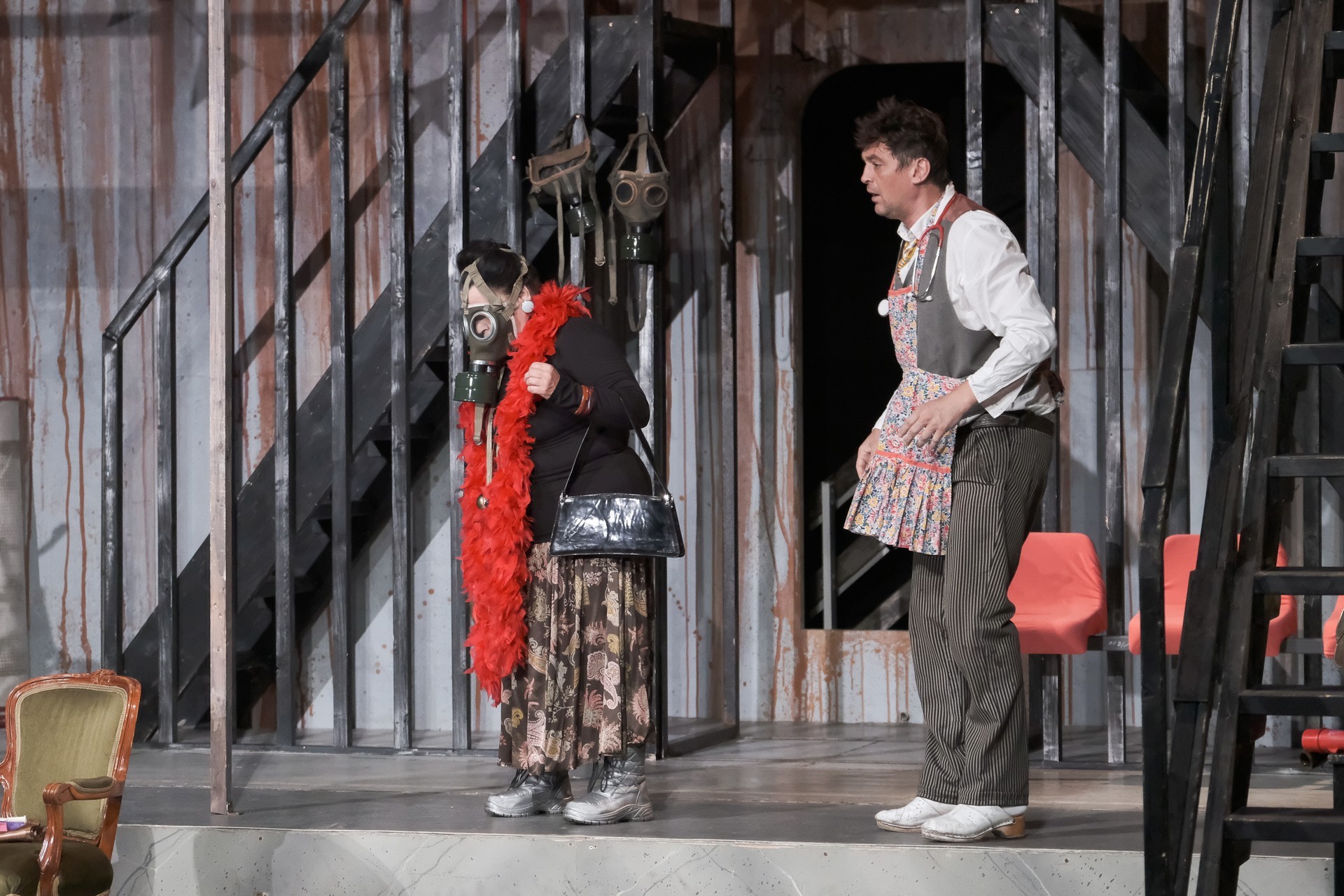 A dimenzionális kaput ez esetben a Schulberg által feltalált időgép jelenti, egy kis, nyakba akasztható, világító földgömb formájában – afféle Men in Black: „a galaxis az Orion-övön van”-effekt. A sziporkázó ötletekkel, szócsatákkal, nyelvi humorral, valós csatákkal, pörgős dramaturgiával és intertextusokkal (pl. Babits, József Attila, Kosztolányi, Radnóti) zsúfolt időutazás egészen a távoli jövőig halad. Kiderül, hogy a világvégi, véres falú bunker – a látvány Jeli Sára Luca munkája –, amely a szeánsz színtere, amelynek birtoklásáért a szó szoros értelmében is öldöklő küzdelmet vívnak hőseink, akár rakétabázis/időgép is lehet egy távoli galaxisban (nem mellesleg az avasi templom alkamráit mintázzák, minden Miskolcra hangolva). Tömve a darab epizódokkal, flashbackpillanatokkal, amelyeket igazán komoly meditatív betétek szakítanak meg. Ugyanakkor sokáig nincs idő mélyen bólintani az axiomatikus igazságokra, mert a filozófiát mindig humorral, nyegle és obszcén poénokkal, szabad szájú, malac viccekkel szakítják meg a rendezők. Eltorzult, kifordított figurák Hejő Csaba (Kokics Péter) közlegény, aki elfogadja gyermeke csonkítását, Margit (vagyis Káder Kata, kommunista kém / Mályi Margit, Csaba párja, Piti Emőke), aki bárkinek felkínálja magát, amíg le nem lepleződik kém mivolta. Kulcsfontosságú lehetne Bőcsi Jónás, a tanító és pap (Szegedi Dezső) szerepeltetése, de karaktere eltolódik egy zserbózabáló, megbízhatatlan, hitehagyott lúzer felé. Abszurd bohózat, kabarépersziflázs, groteszk, humoreszk, gag, burleszk, ugyanakkor analitikus dráma is, ahogyan Elza karaktere változik. Üdítő katasztrófakomédia, amely önmagára, azaz a színjátszás mibenlétére is reflektál kiszólásokkal. Végig úgy érzem magam, mint Tábory Elemér, nem tudom, mikor álmodom és mi a valóság.