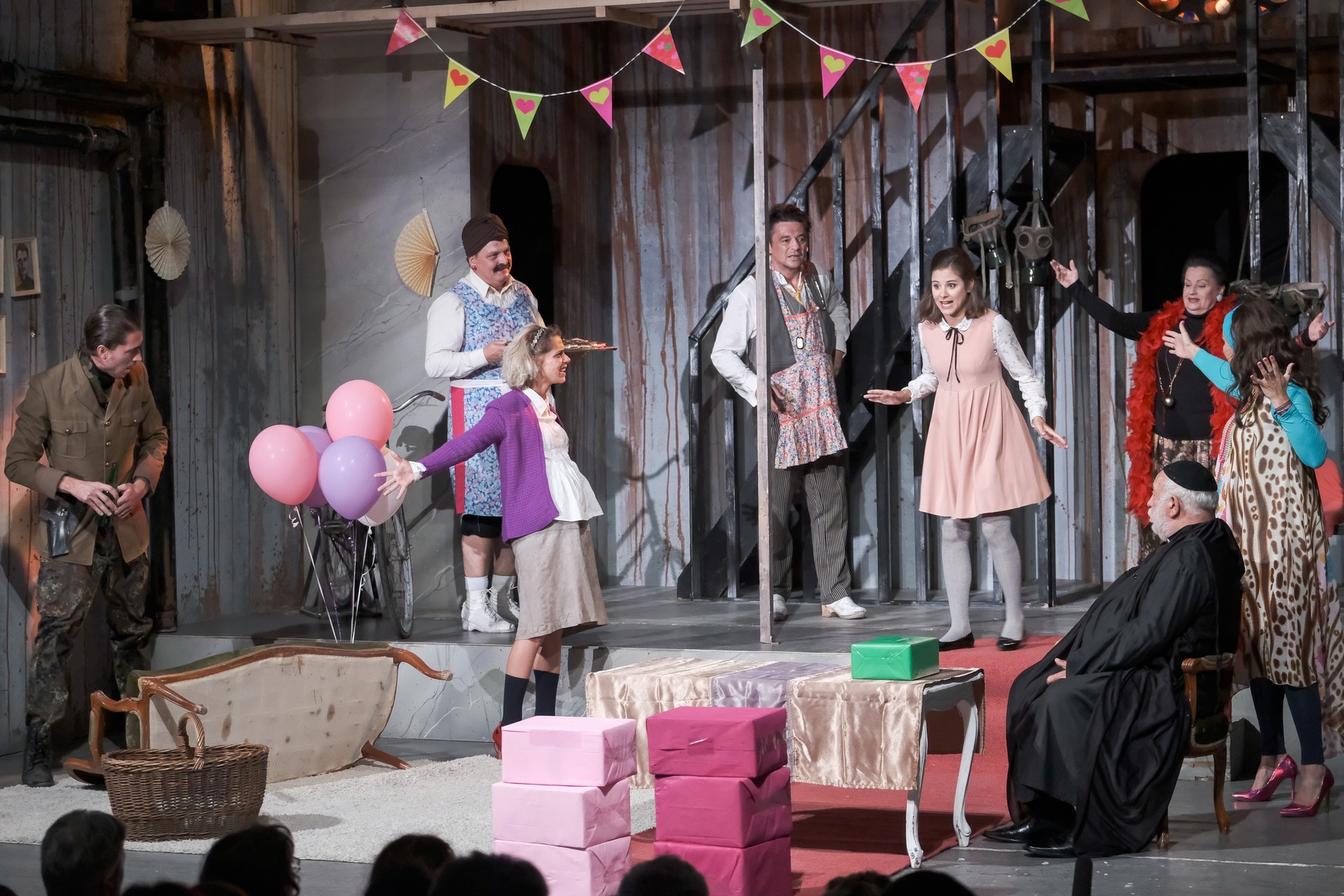 A színpadi alaptörténetben egy fiatal lány, Miskolczi Elza (Prohászka Fanni) szülinapját ünneplik a szülők, de a meglepiparti helyszíne szüntelen hadműveleti tereppé válik, állandó bombarobbanás, áramszünet. (Több jelenetnek futnak neki többször, az ismétlés, a szituációk széttördelése a reflexív játék része.) Közben világháborús nosztalgiazenék úsznak be, filmképek zuhognak, filmes áttűnések, áthallások torlódnak egymásra (pl. Tarantino). Időről időre elszabadul a pokol. Ilyen jövőből hőseink szívet melengetve emlékezzenek vissza a békebeli kétezres évek elejére, amikor még lehetett filozofálni, kultúráról beszélgetni, nem égettek könyveket, nem volt átkos a műveltség.
