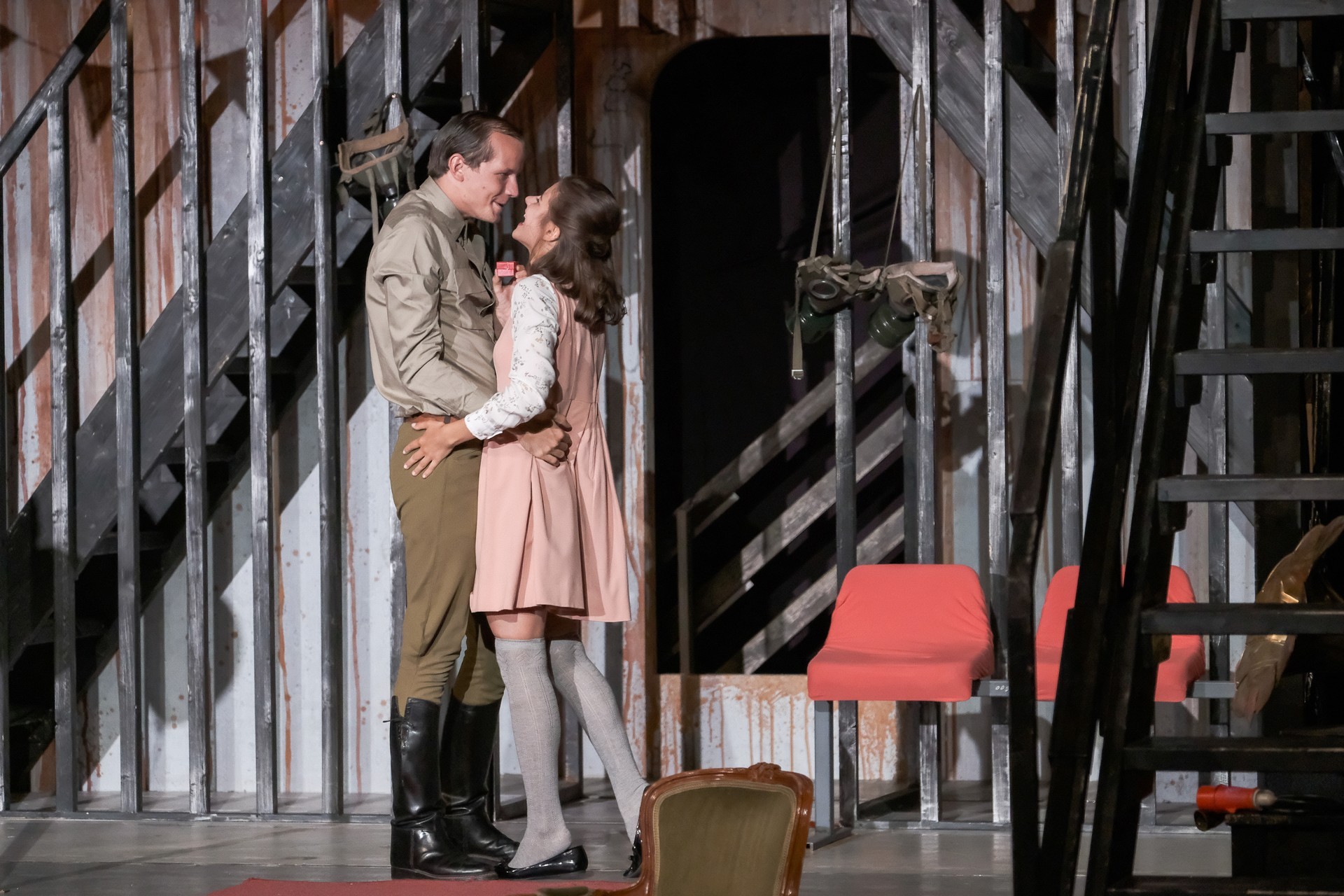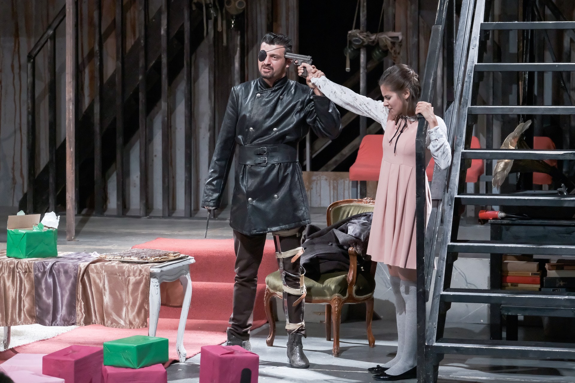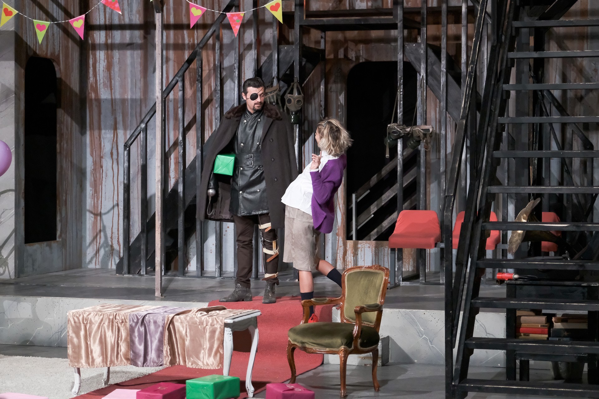 Egy ilyen világban mindenkinek kell lennie fegyverének. De nem mindegy, mire használja. Elza is pisztolyt kap ajándékba Radostyán Tihamértól (Rózsa Krisztián), a félszemű, kampókezű, műlábú hadfitól, akihez a szülők hozzá akarják adni feleségül, mert hát övé a bunker, a további létük tőle függ. De Elza mást szeret, Arnóti Dezsőt (Feczesin Kristóf), aki a fronton harcol, a háborúban, s ahonnan haza is tér, a lány nagy örömére. Jelen világunkban nem lehetnek egymáséi, de talán egyikben sem. A szerelem, barátság, bizalom, család, lojalitás mind eltűnni látszanak a legeslegutolsó emberiség órákban. Minden egész eltörött!