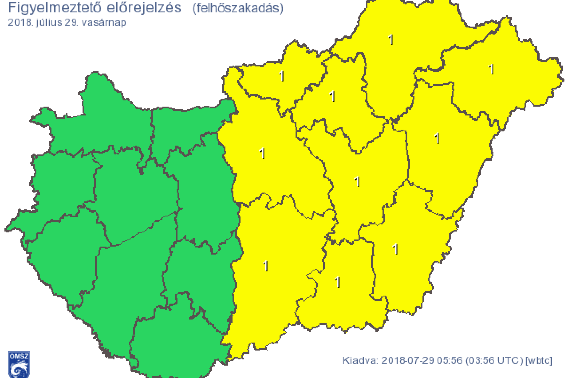 Az Országos Meteorológiai Szolgálat MTI-hez eljuttatott veszélyjelzése szerint felhőszakadás veszélye miatt Budapestre, Pest, Bács-Kiskun, Békés, Borsod-Abaúj-Zemplén, Csongrád, Hajdú-Bihar, Heves, Jász-Nagykun-Szolnok, Nógrád és Szabolcs-Szatmár-Bereg megyére adtak ki elsőfokú figyelmeztetést.
